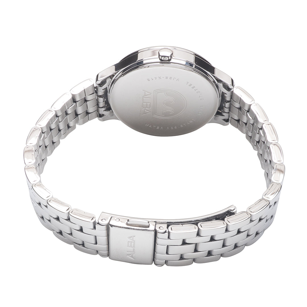 The Alba Women's Watch features a stunning light blue MOP patterned dial, accompanied by a stainless steel case and band. This timepiece is equipped with the VJ22 movement calibre and boasts a date display. The watch is water-resistant up to 5 bar and features a mineral crystal glass. The case...