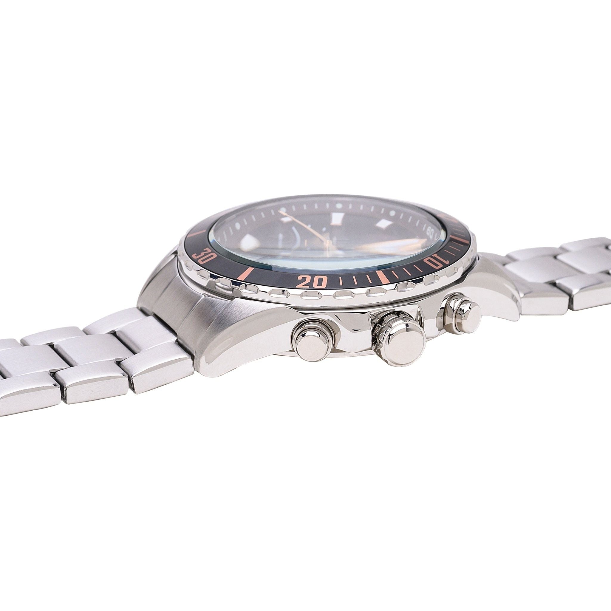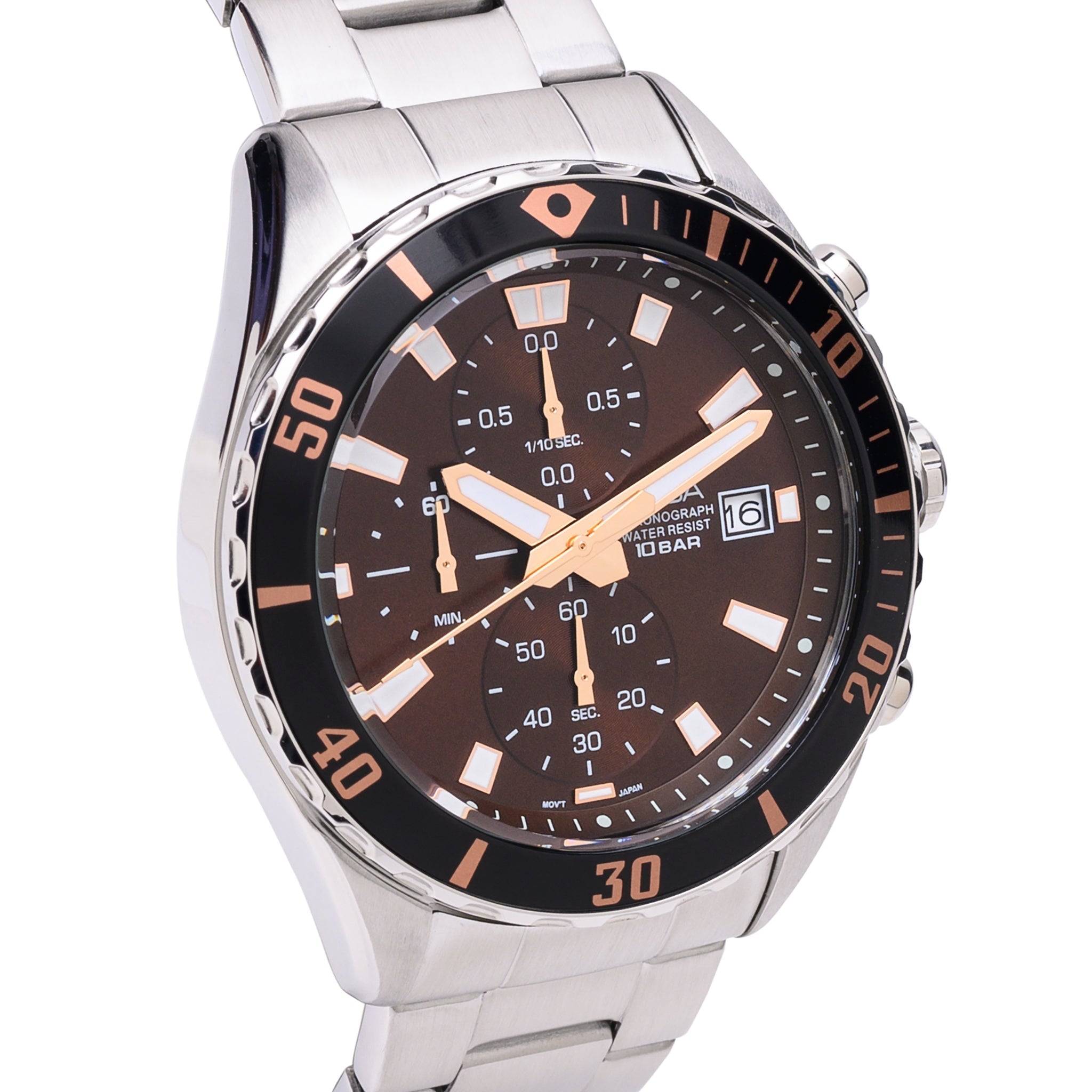 L/G: Men's Dial: Brown Functions: 60 minute chronograph accurate to 1/10 second Split timeHour, minute, second, sub-hands Date: Date Water Resistant: 10 Bar Material: Stainless steel case and screw case back Band: Stainless steel wrapped bracelet Glass: Curved mineral crystal Case Size: 43.5mm