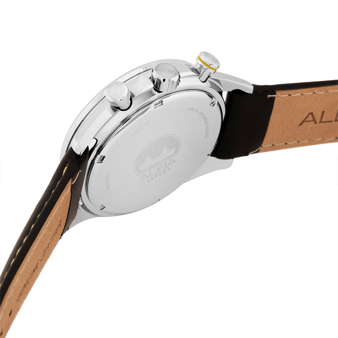 Gender : Men's Movement : Quartz Material : Stainless steel case Case Size: 43.5mm Glass: Mineral crystal Case Back : Screw Case Back Luminous : Luminous hands and markers Band : Genuine Leather Water Resistant: 10 Bar Date : Date Movement Calibre : VD53