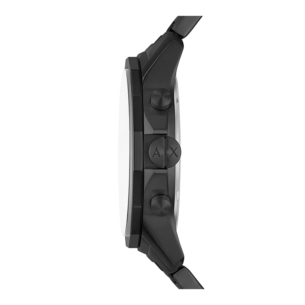 Go to the shopArmani Exchange's 44 mm watch features a black cd texture and sunray dial with silver stick indexes, chronograph movement and black-tone stainless steel bracelet.