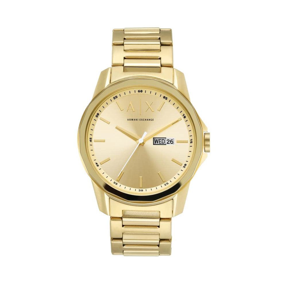 Go to the shopArmani Exchange's 44mm watch features a gold sunray dial, at least 50% recycled stainless steel case, three-hand day-date movement and gold-tone stainless steel bracelet.