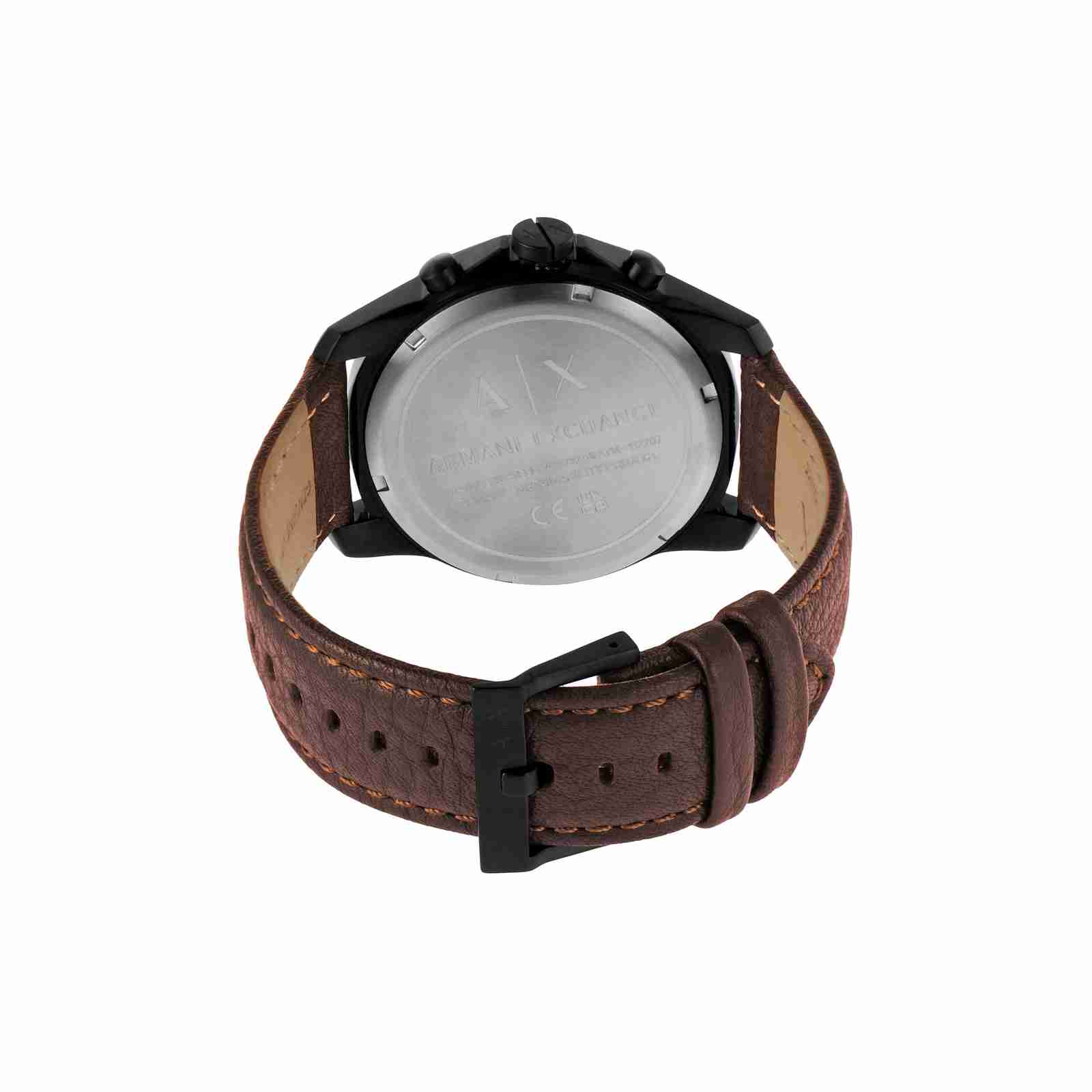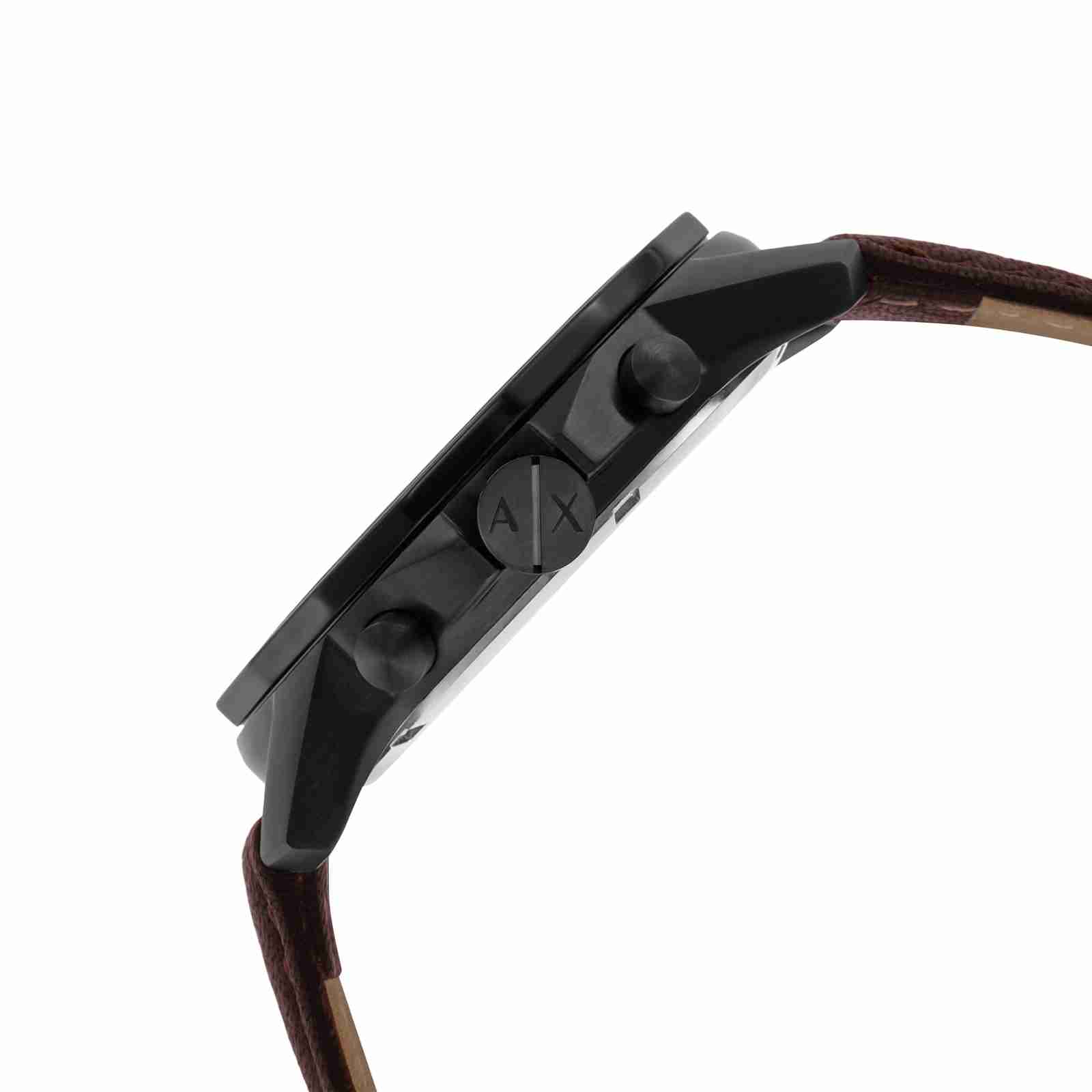 Armani Exchange's 44mm watch features a black cd finish, sunray dial, at least 50% recycled stainless steel case and strap buckle, chronograph movement and brown leather strap. This watch is perfect for those who want a stylish and functional timepiece. The chronograph movement allows for precise timekeeping, while the leather...