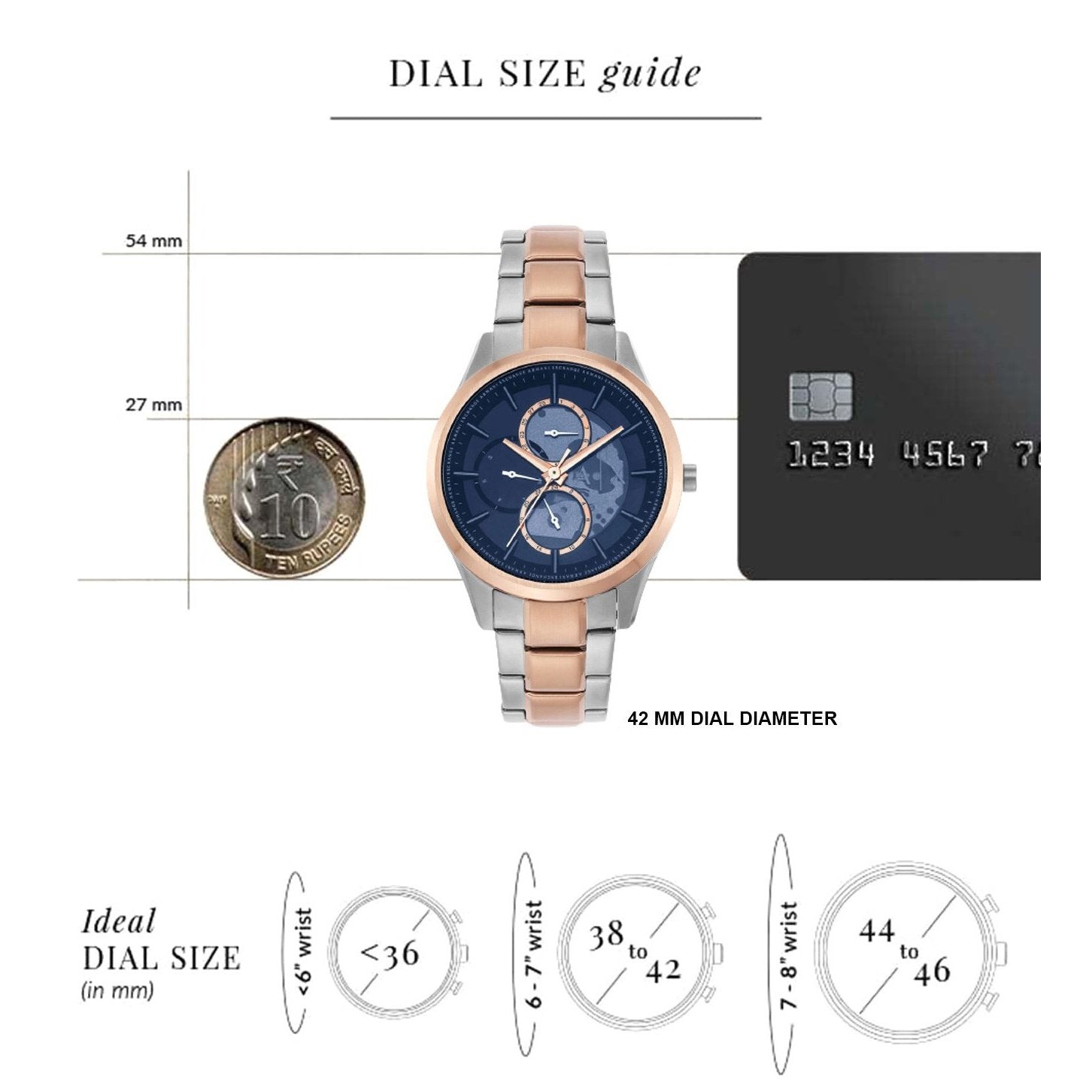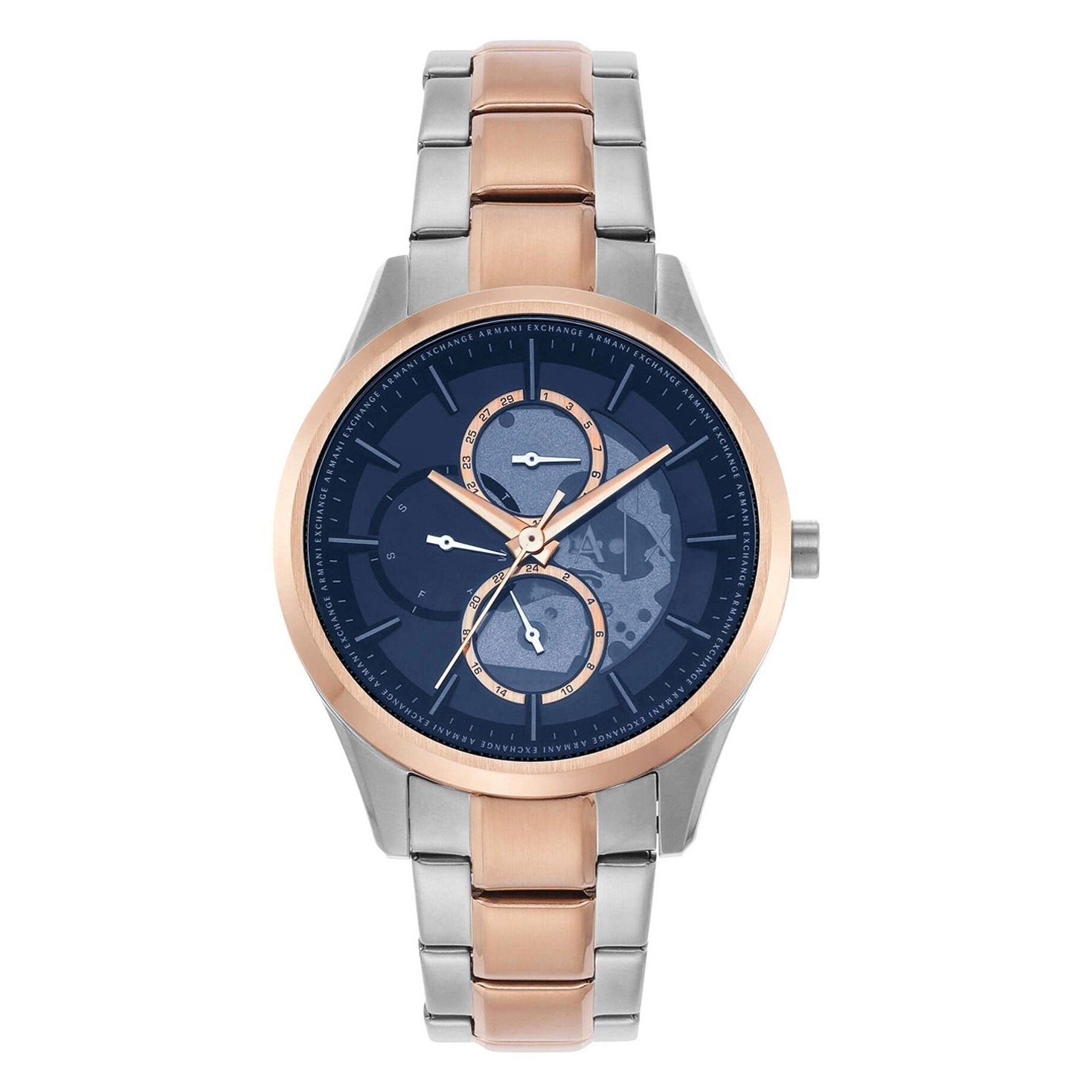 Give your timepiece collection a completion with this men's analog watch from Armani Exchange. The blue round dial is protected by a mineral glass. It has a crown for time adjustment. The stainless steel strap comes in a two tone hue that further elevates the look of the timekeeper. Armani...