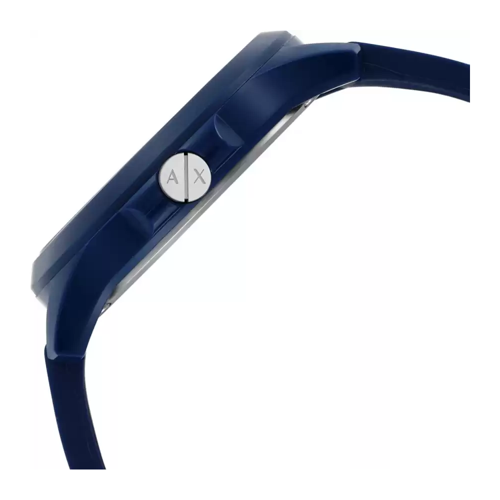 The bold and vibrantly distinctive design of this Armani Exchange Blue Men s Watch is undeniably class apart. This exquisitely designed 46 mm watch features a Blue matte dial with white numeral indexes, signature logo bar and inner seconds track, three hand movement and Blue textured silicone strap.