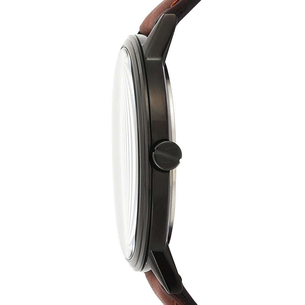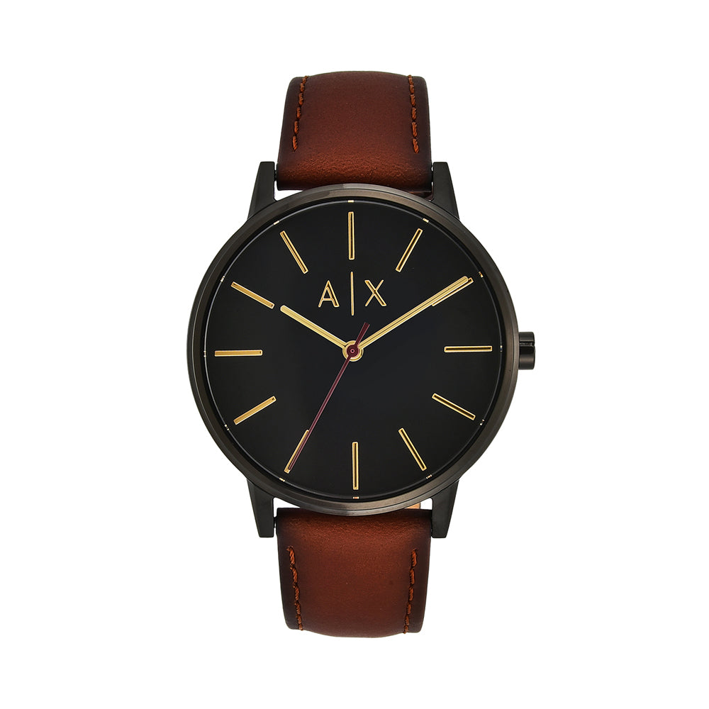 This sophisticated analog watch for men from Armani Exchange boasts of an elegant and simple black sunray dial with a beveled gold indices and brown leather strap which adds texture and modern style to this black Armani Exchange watch. It is water resistant and suited to go with any casual...
