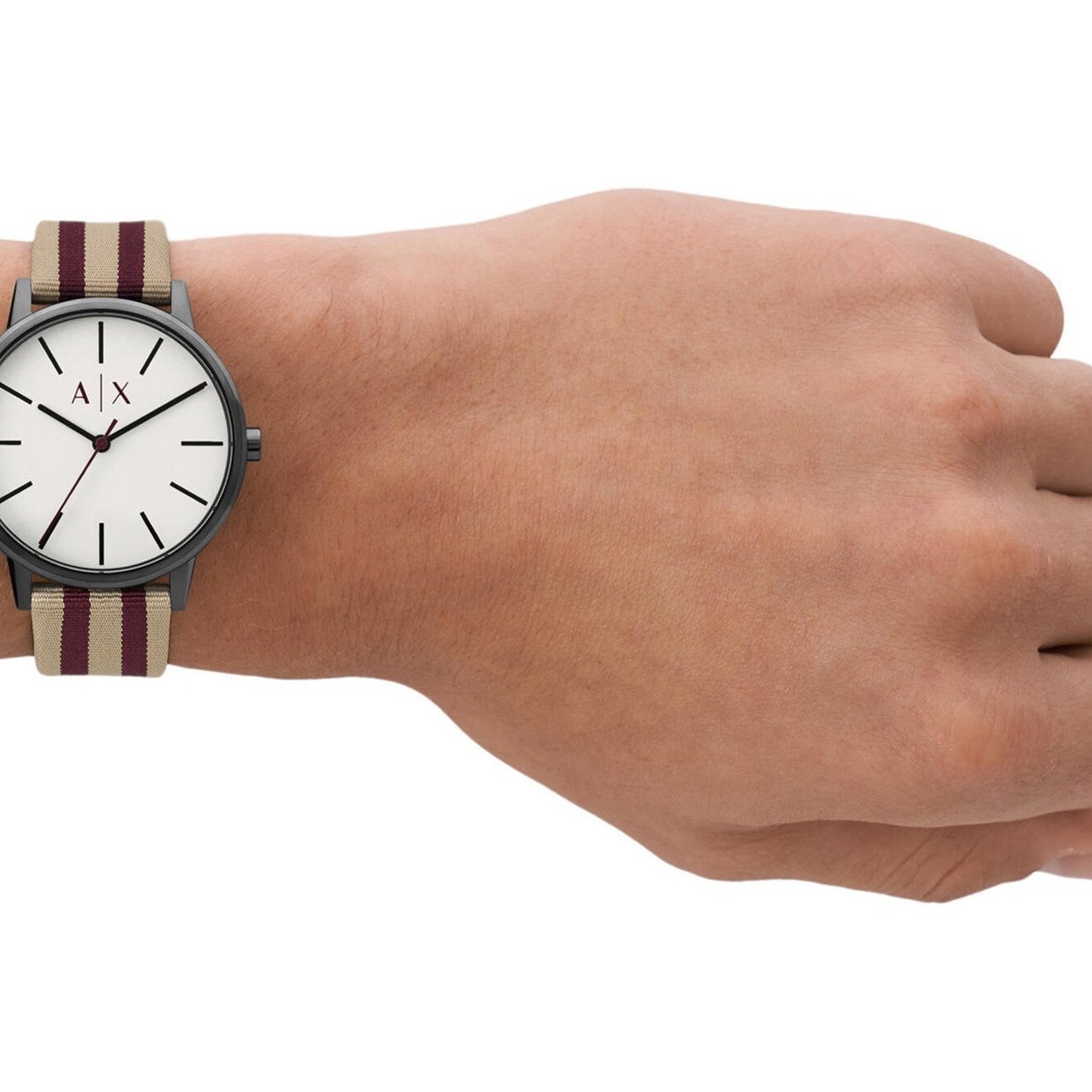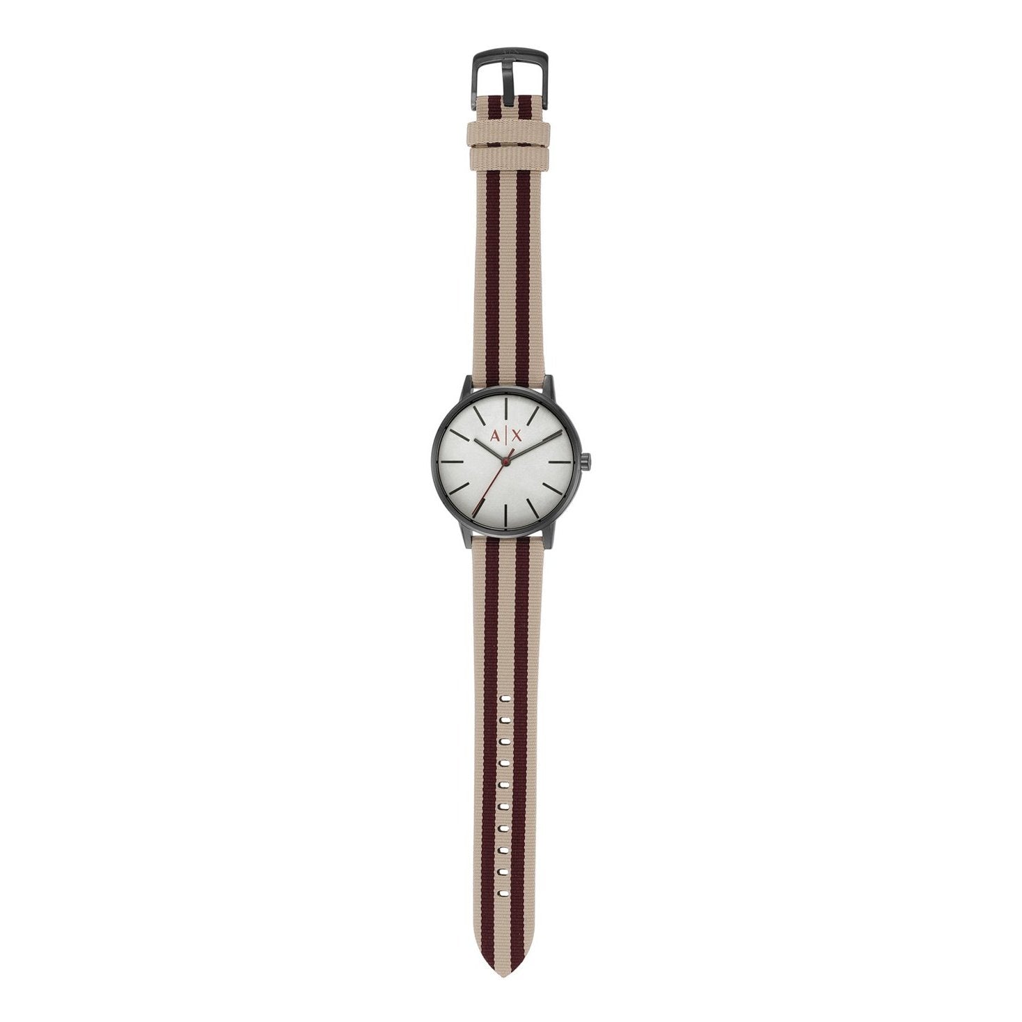 A perfect fusion of style and functionality, this men's analog watch from Armani Exchange is sure to make a style statement. The white round dial is protected by a mineral glass. It has a crown for time adjustment. The fabric strap comes in a multi hue that further elevates the look of the timekeeper. Armani Exchange's 42mm watch features a grey matte dial, three-hand movement and brown and red textile strap.
