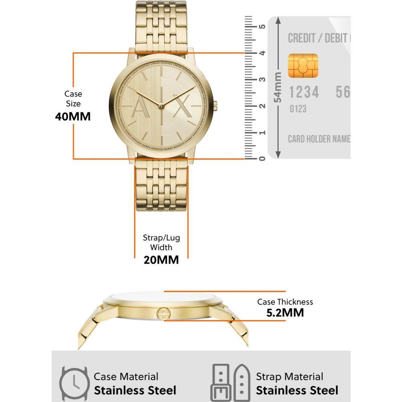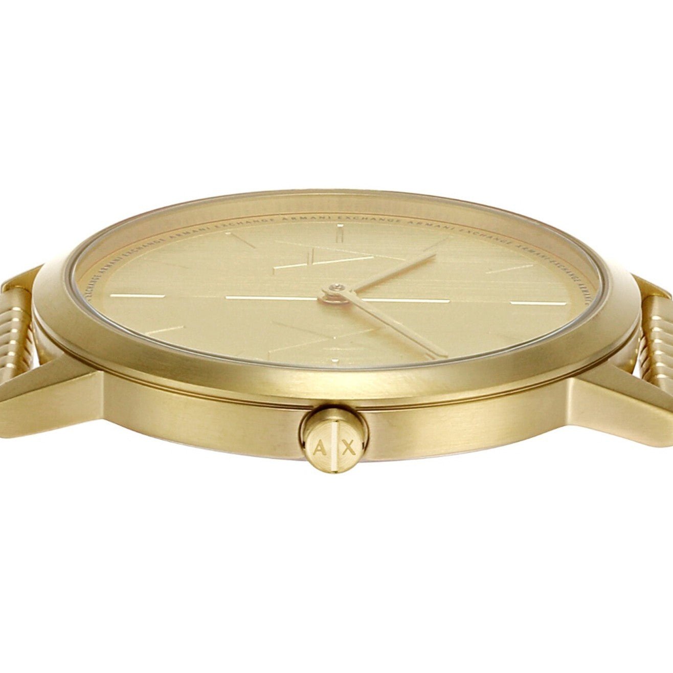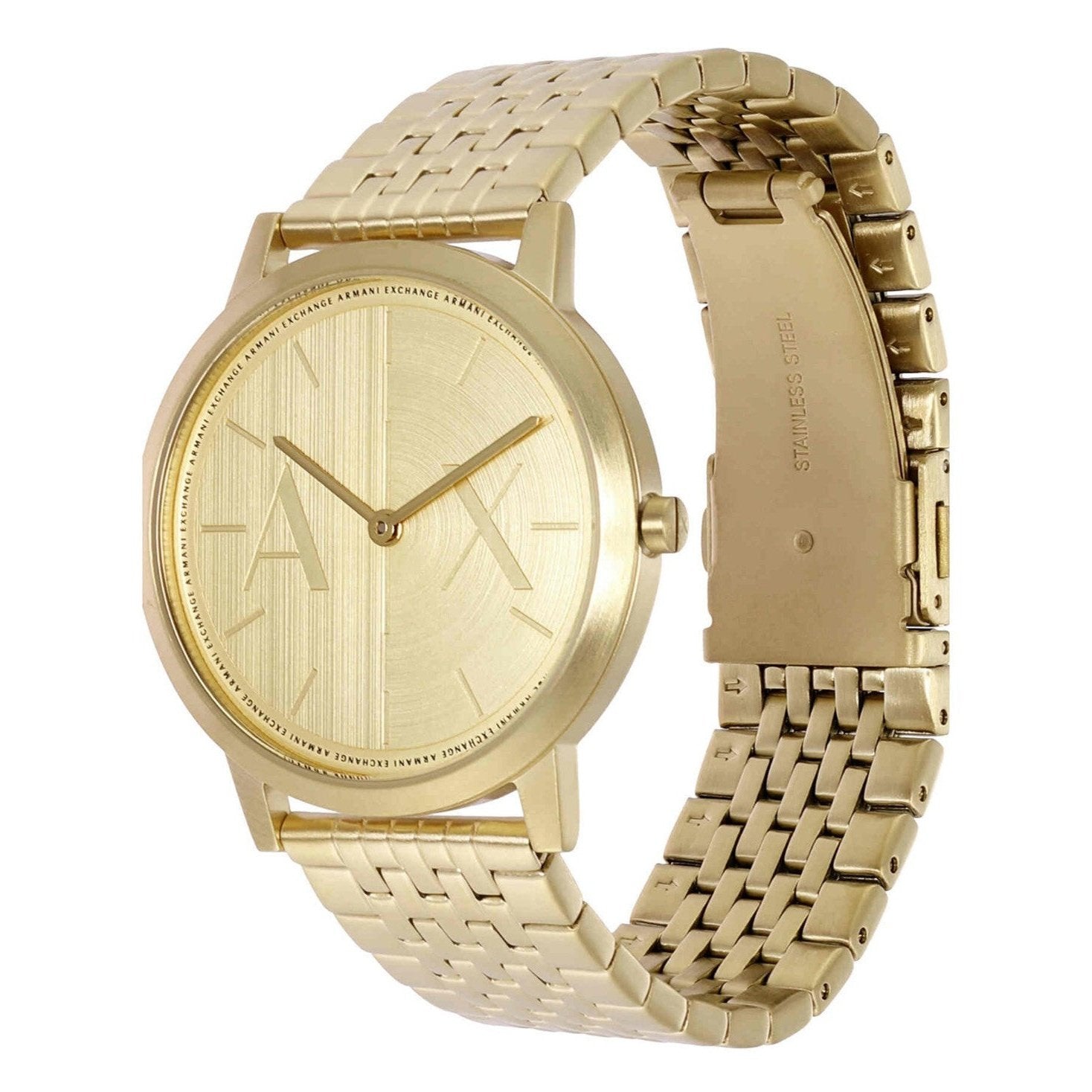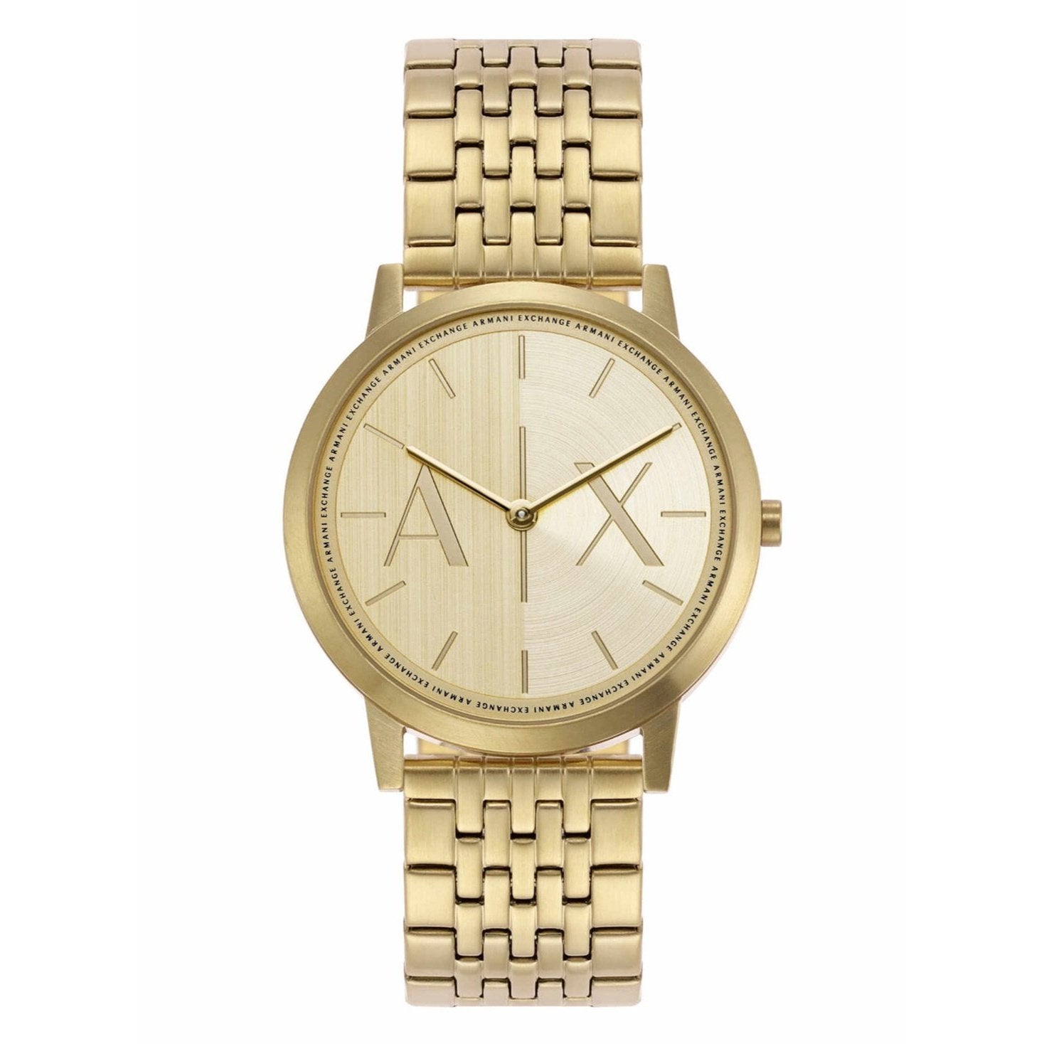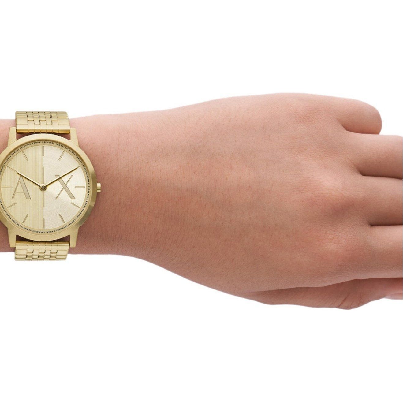 Carry great technology wrapped around your wrist with this stylish men's analog watch from Armani Exchange. The gold round dial is protected by a mineral glass. It has a crown for time adjustment. The stainless steel strap comes in a gold hue that further elevates the look of the timekeeper....