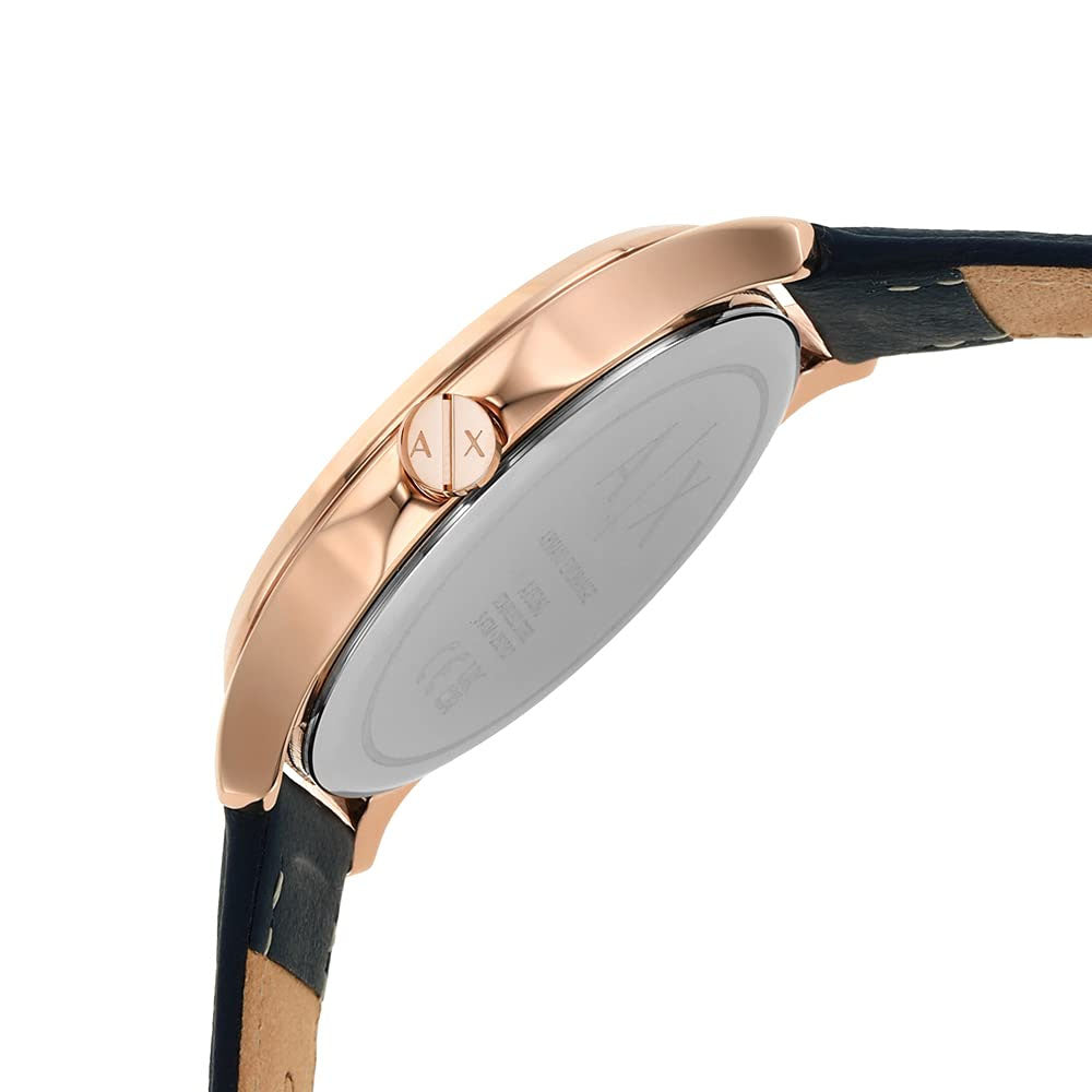 Armani Exchange's 36mm watch features a white sunray dial with rose gold indexes, three hand movement and blue leather strap. Armani Exchange features an optical illusion inducing X link stainless steel bracelet inspired by the A X logo. The brand takes inspiration from contemporary dance music and a street chic...