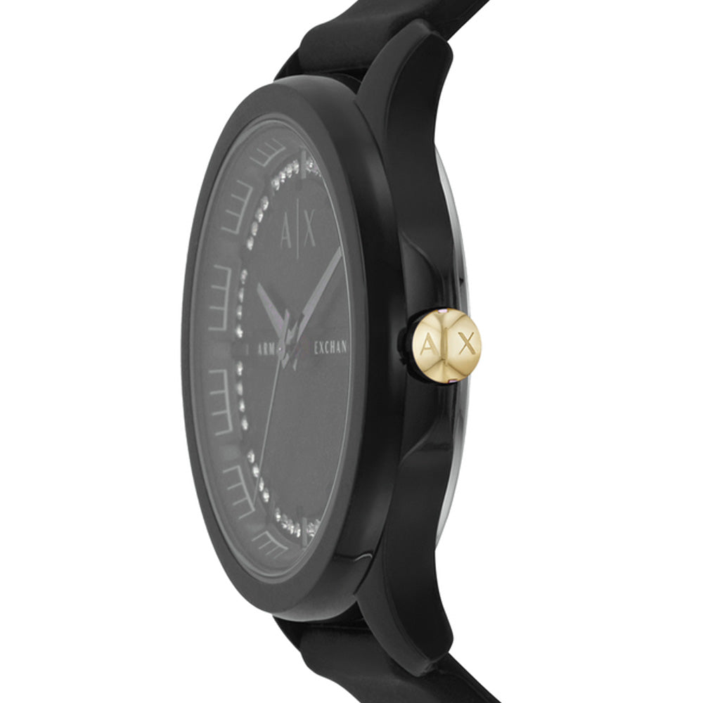 A must-have timepiece for all the watch aficionados, this women's analog watch from Armani Exchange will be a perfect pick. Its strap vaunts a black hue that enhances the look of the watch. Housed in a case, the black round dial is protected by a mineral glass. It showcases plain...