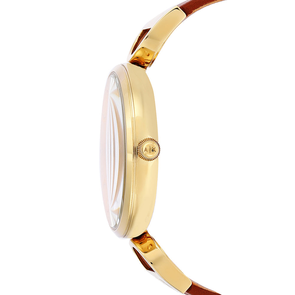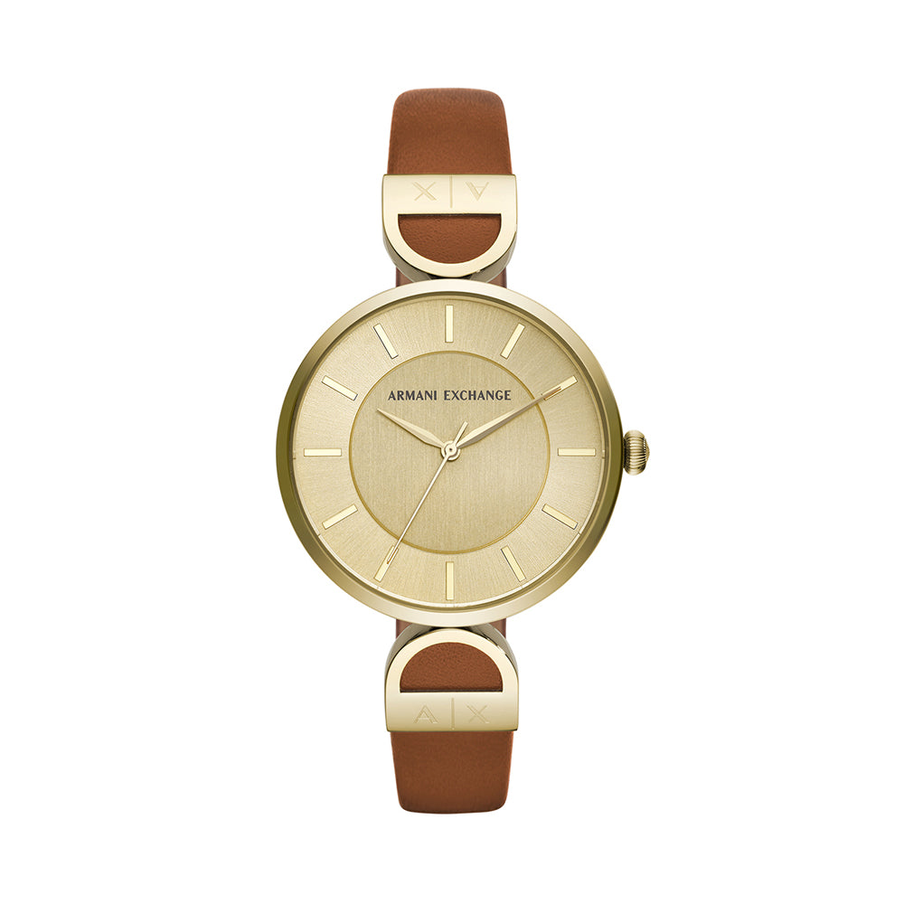 This sophisticated analog watch for women from Armani Exchange boasts of an elegant and simple gold sunray dial with a beveled index ring and brown leather strap which adds texture and modern style to this gold IP Armani Exchange watch. It is water resistant and suited to go with any...