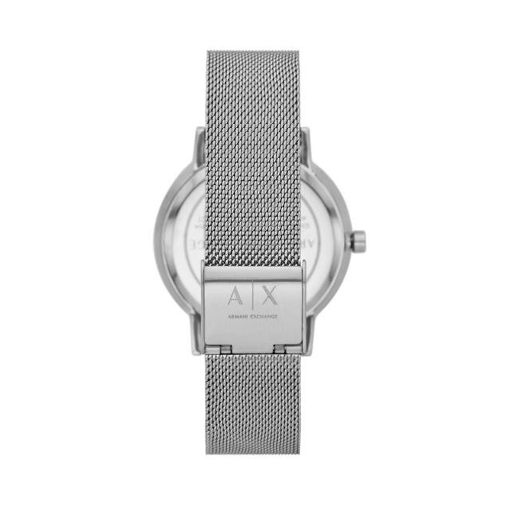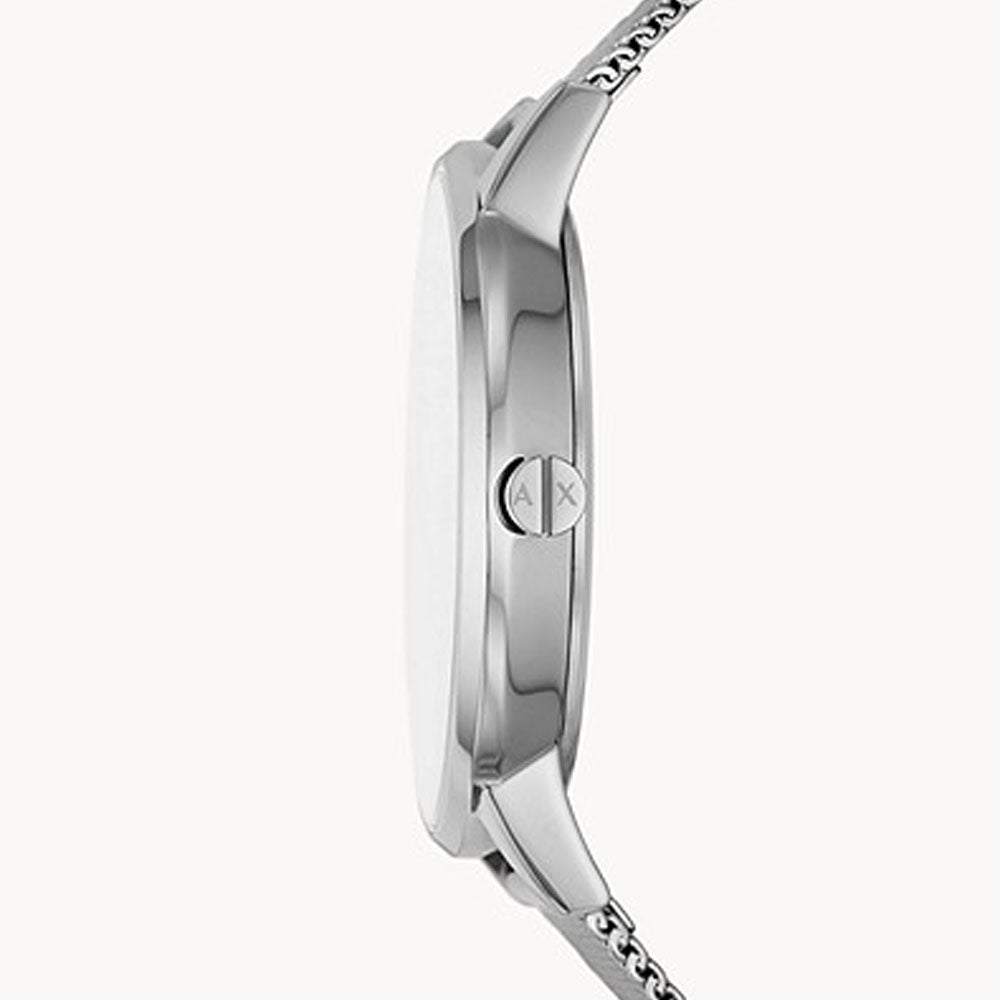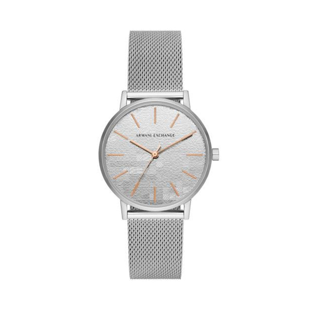 Get a sleek look by sporting this women's analog watch from Armani Exchange. Its round-shaped silver-toned textured dial is mosaic-inspired and protected in a case of 36 mm diameter with a mineral glass on top. The stainless steel bracelet of this watch exudes a silver hue for an eye-catching look....