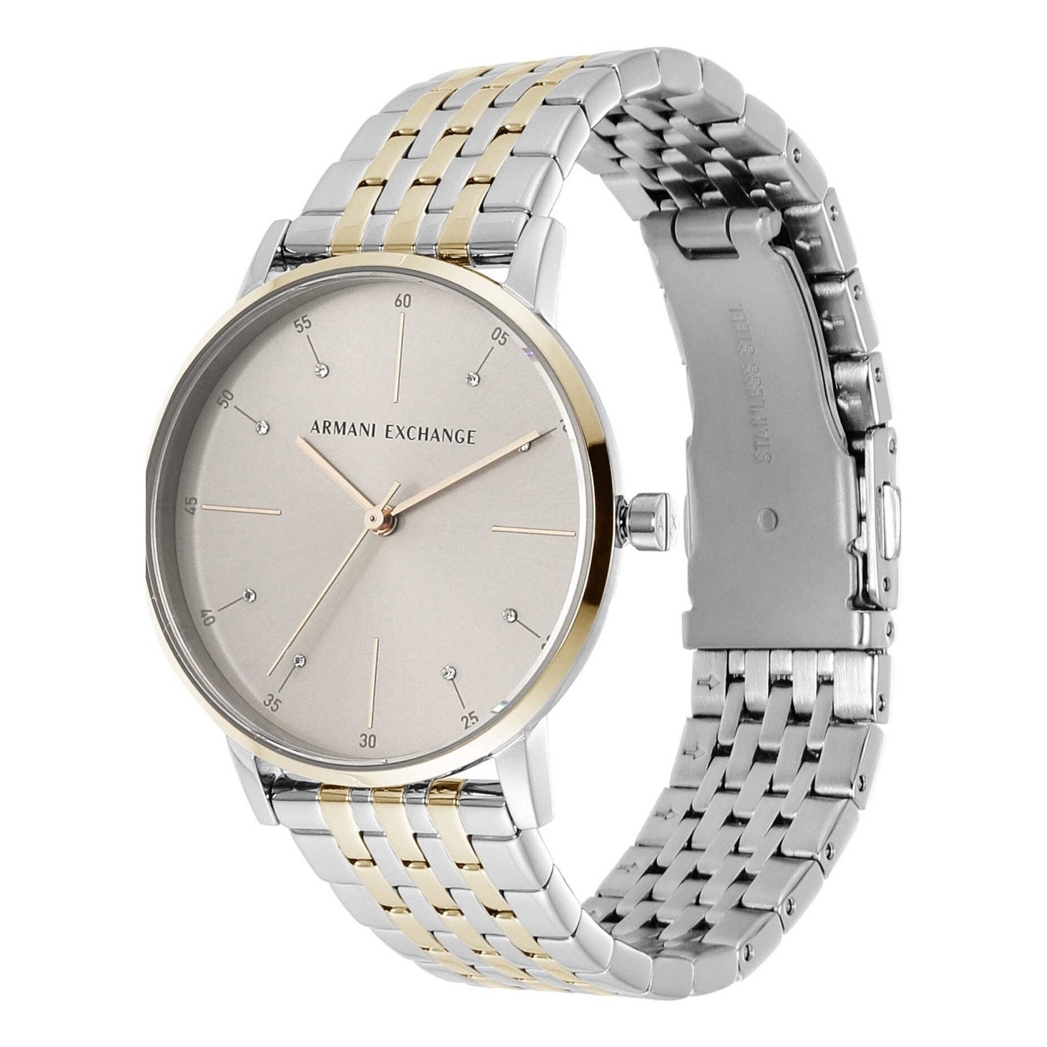 Style and performance perfectly combine together to form this women's analog watch that is brought to you by Armani Exchange. The grey round dial is protected by a mineral glass. It has a crown for time adjustment. The stainless steel strap comes in a two tone hue that further elevates the look of the timekeeper. Armani Exchange's 36mm watch features a beige sunray dial, three-hand movement and two-tone stainless steel bracelet.