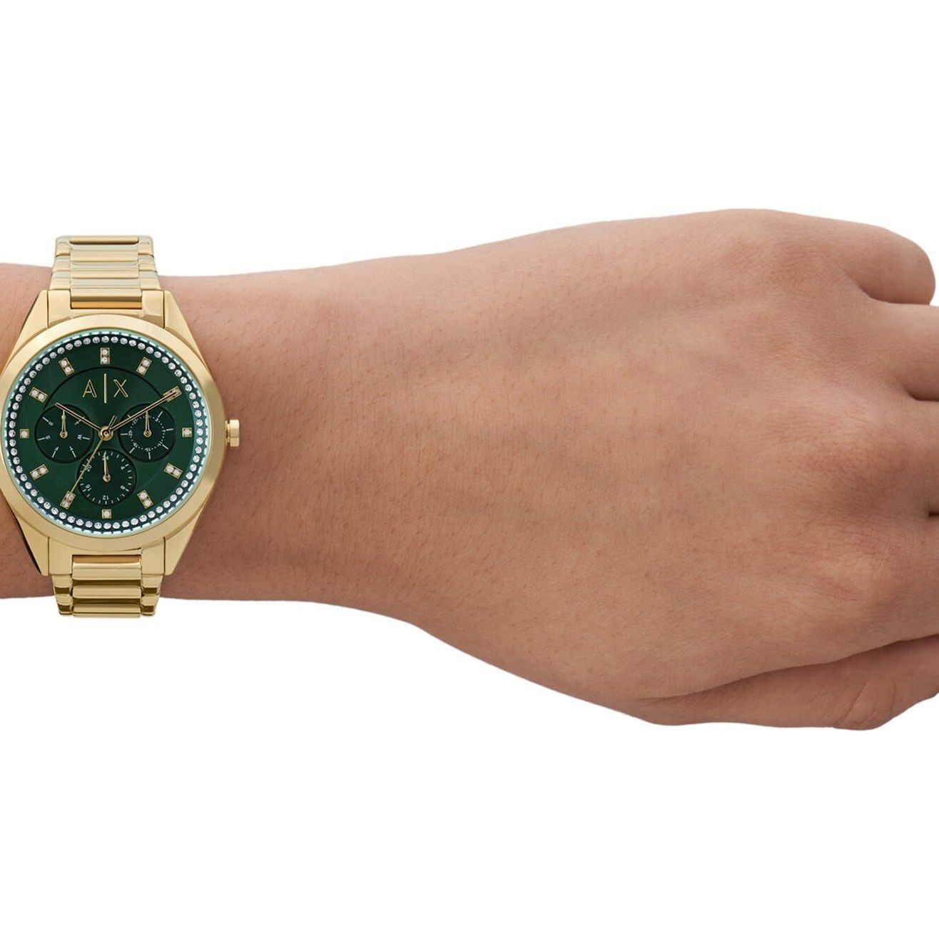 Look stylish by donning this women's analog watch from Armani Exchange. The green round dial is protected by a mineral glass. It has a crown for time adjustment. The stainless steel strap comes in a gold hue that further elevates the look of the timekeeper. Armani Exchange's 38mm watch features...