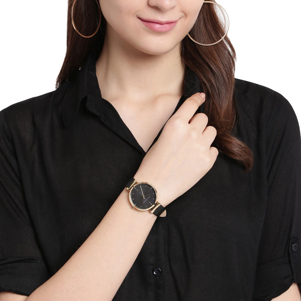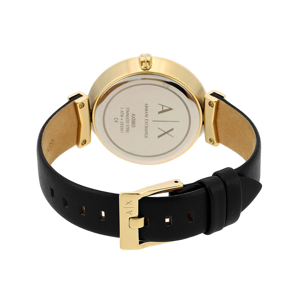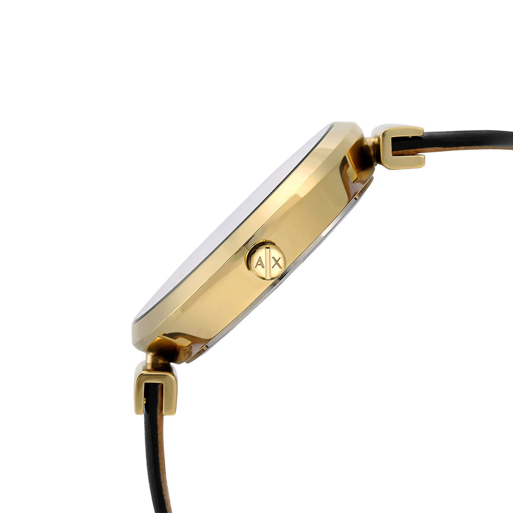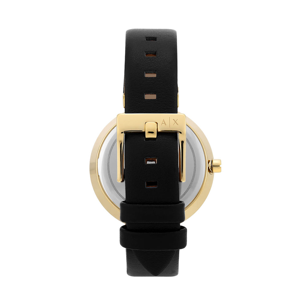 Minimalistically elegant, this women's analog watch from the House of Armani Exchange makes for a perfect wear for formal days. The Outlet Zoe takes a turn for the sophisticated, incorporating a rich black leather strap, a gold-tone stainless steel case to hold the piece together. Featuring an elite black textured...