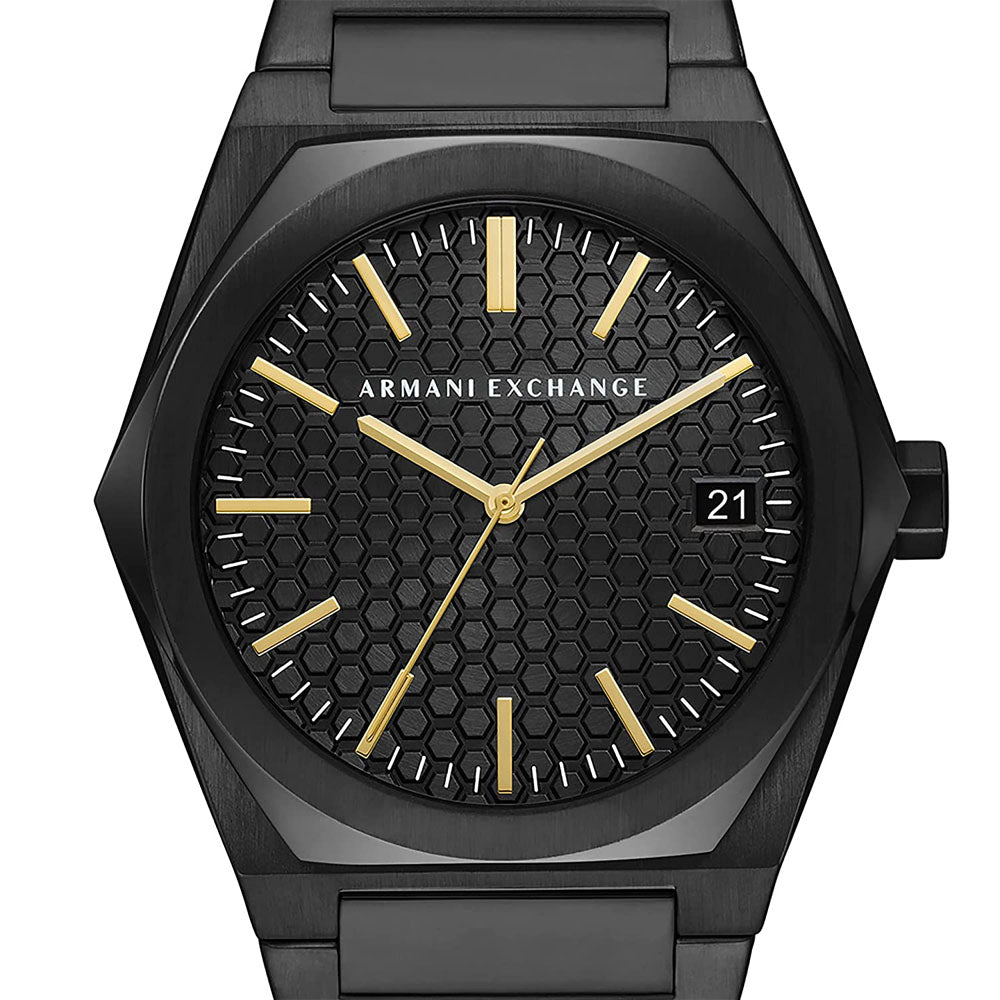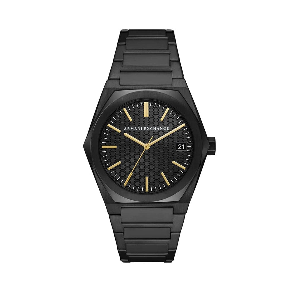 Add a perfect finishing touch to your look with this men's analog watch from the Geraldo collection by Armani Exchange. Its stainless steel strap vaunts a black hue that enhances the look of the watch. Functional on a quartz movement, the black round dial is encompassed in a 44 mm...