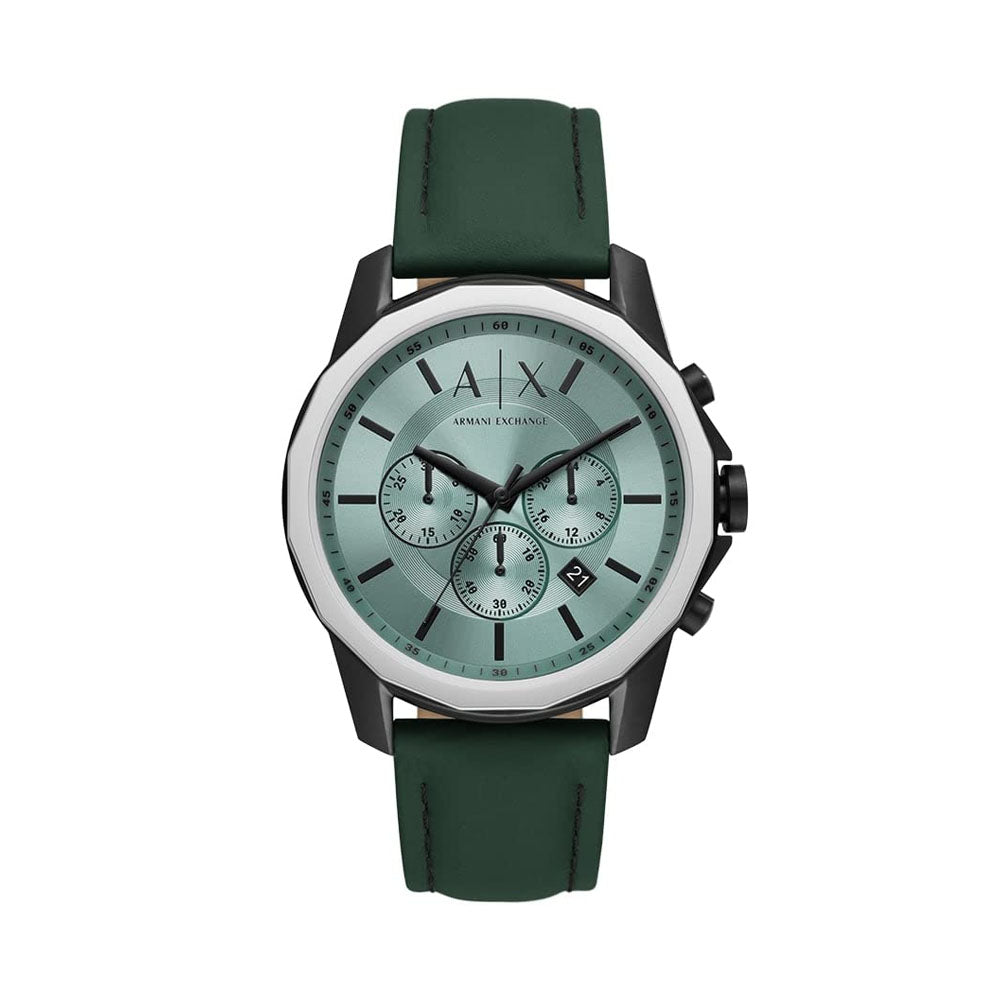 Go to the shopArmani Exchange's 44mm watch features a cd finish, sunray green dial, chronograph movement and green leather strap.