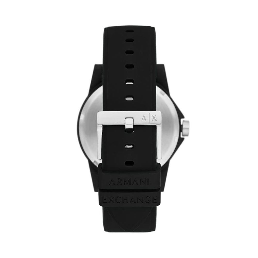 Define your suave personality by wearing this men's analog watch from the Outerbanks collection by Armani Exchange. The black round dial is housed in a 44 mm case. It exhibits plain three hands and a crown for time adjustment. The silicon strap showcases a black hue that uplifts the look...