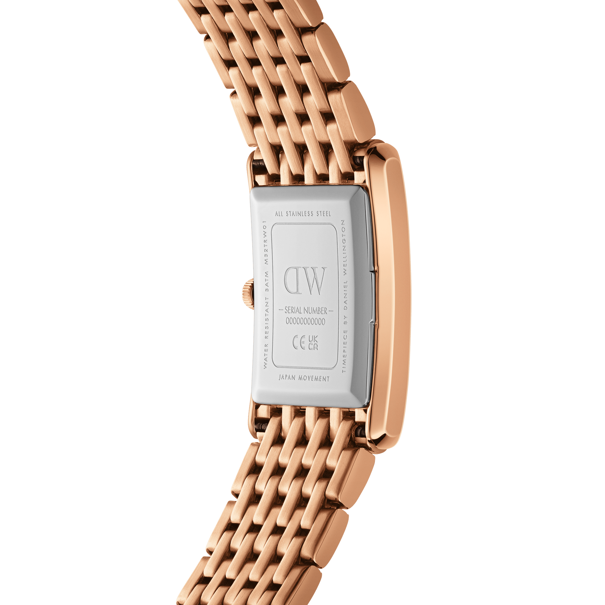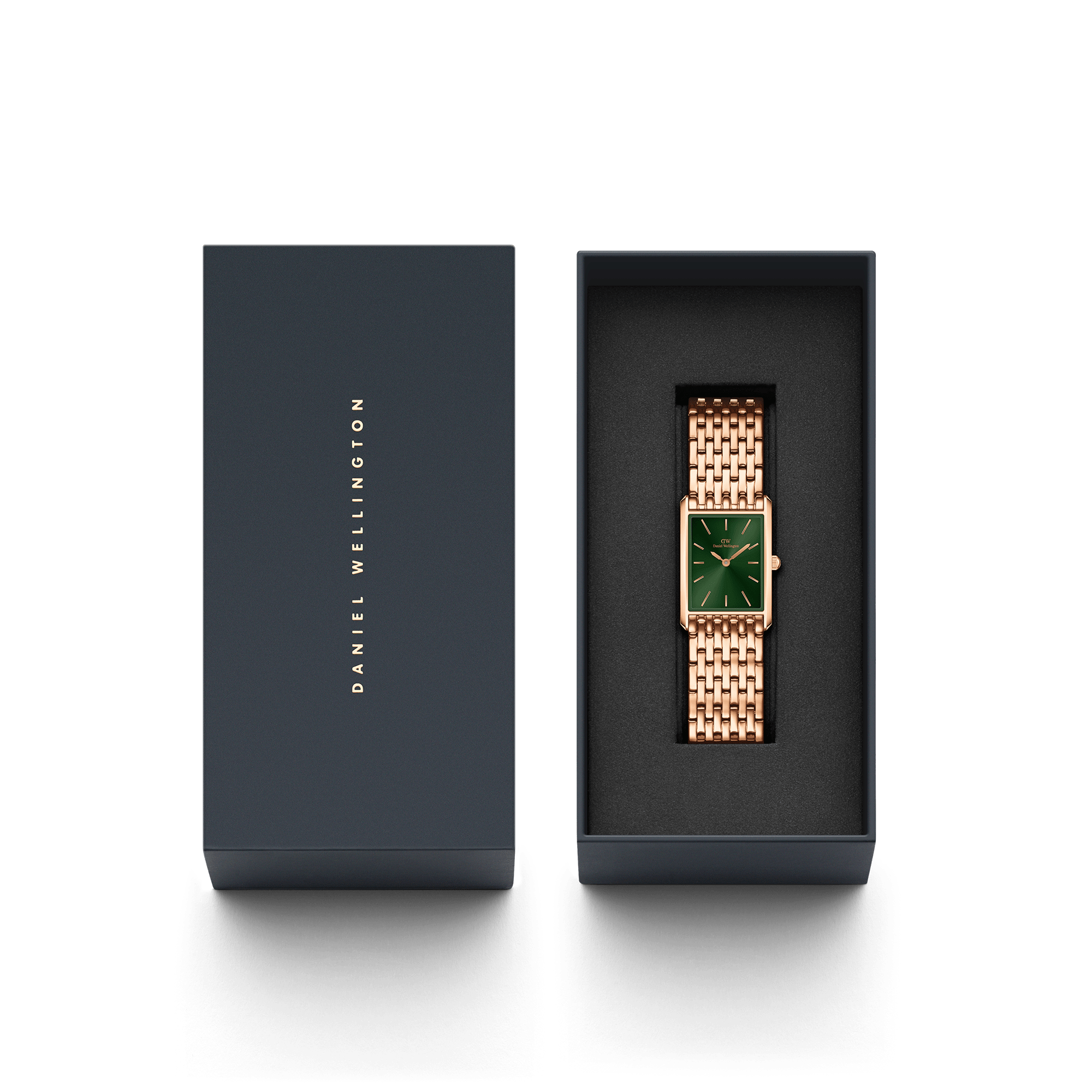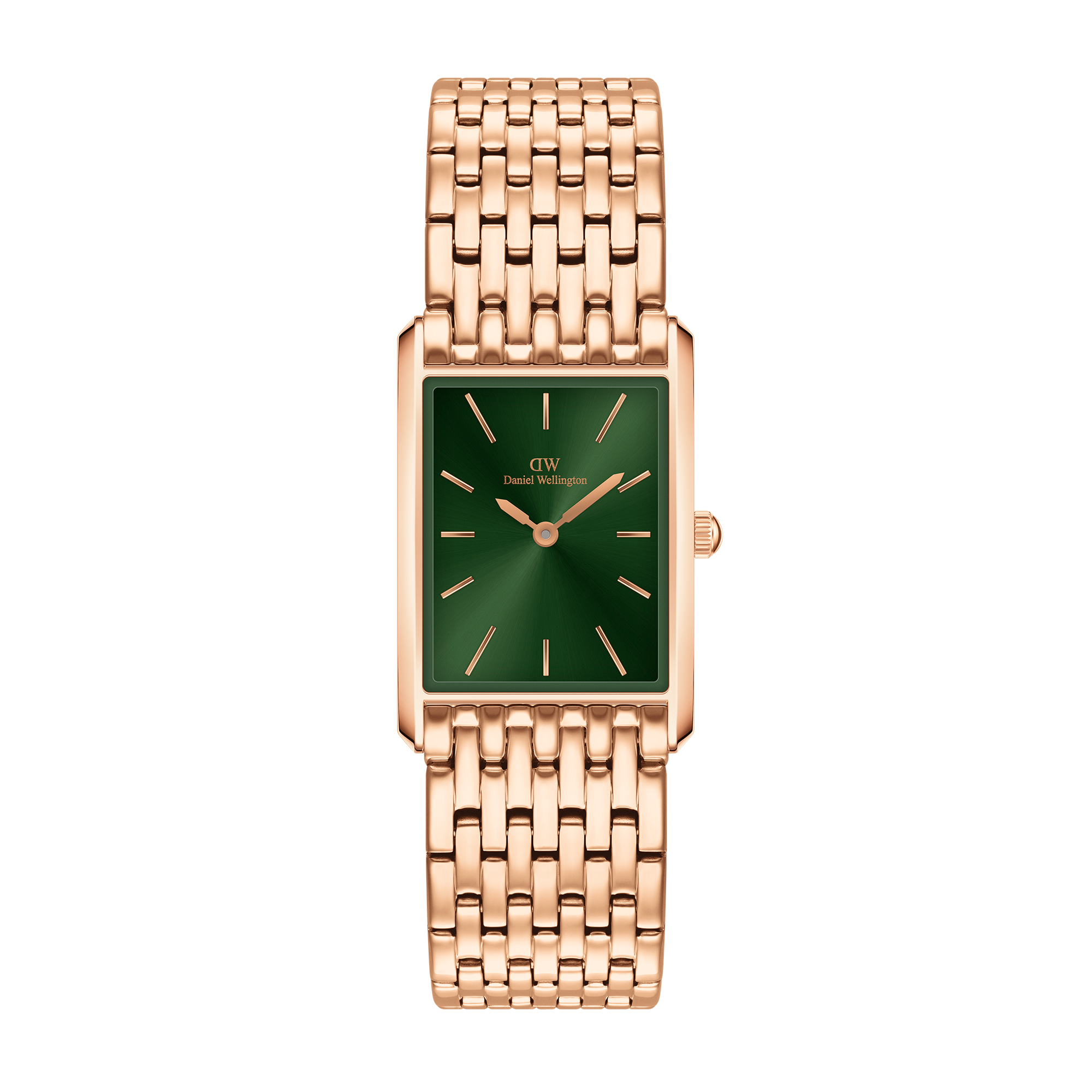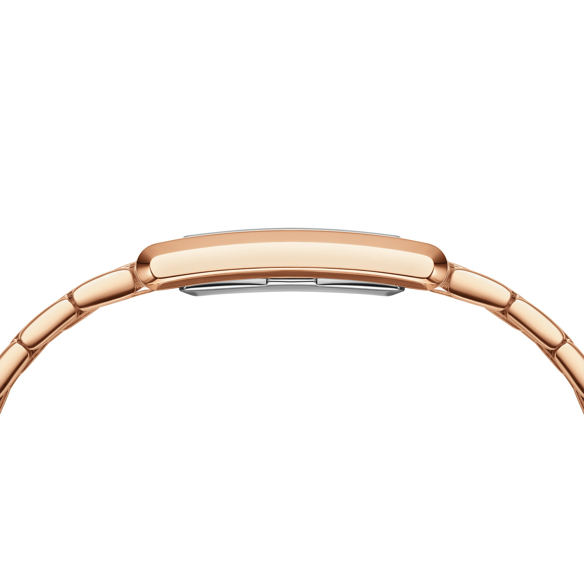 With sleek geometric edges and two sizes to choose from, our Bound collection brings perfect symmetry to your wrist. The curved rectangular case of this rose gold watch matches the exact width of its 9-link strap—giving you a seamlessly integrated emerald sunray dial.