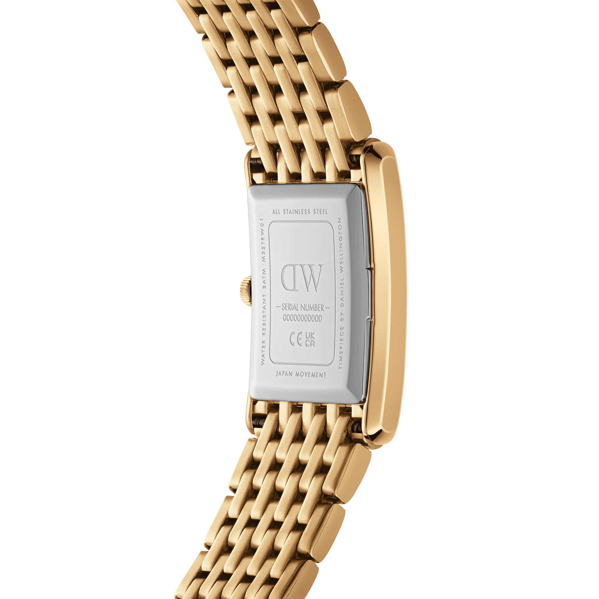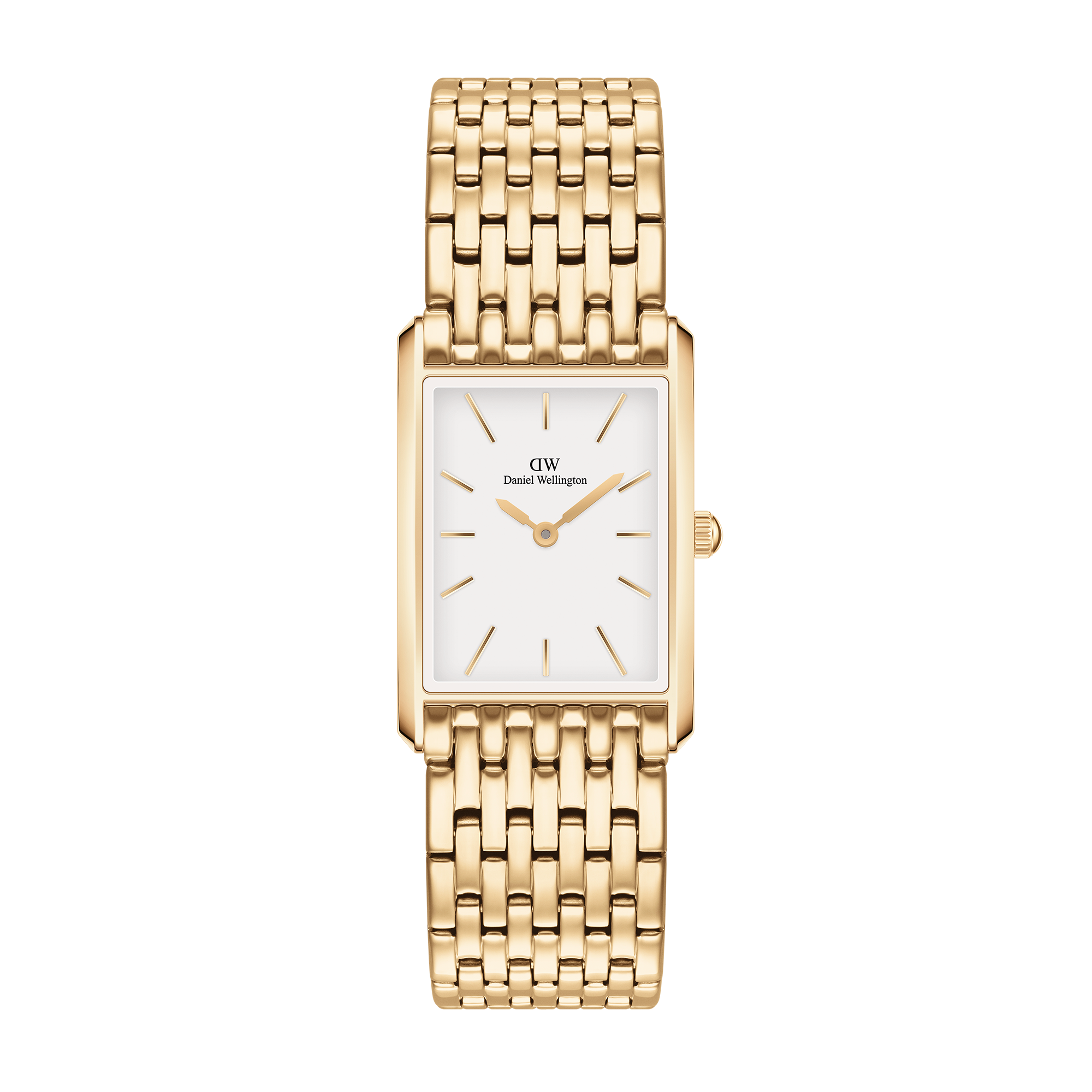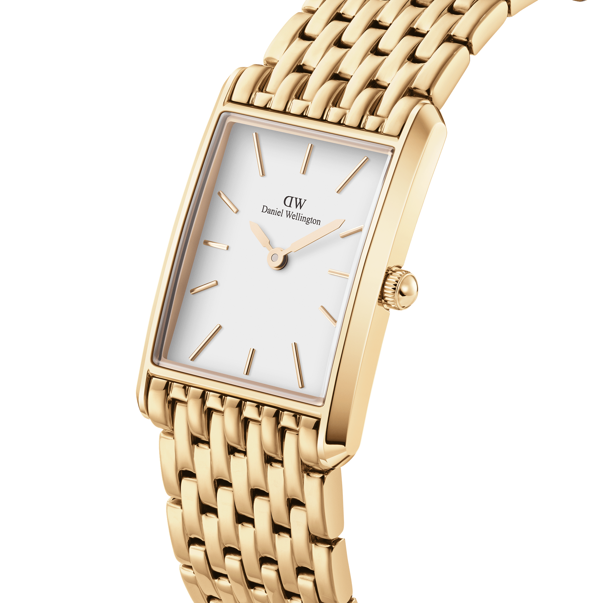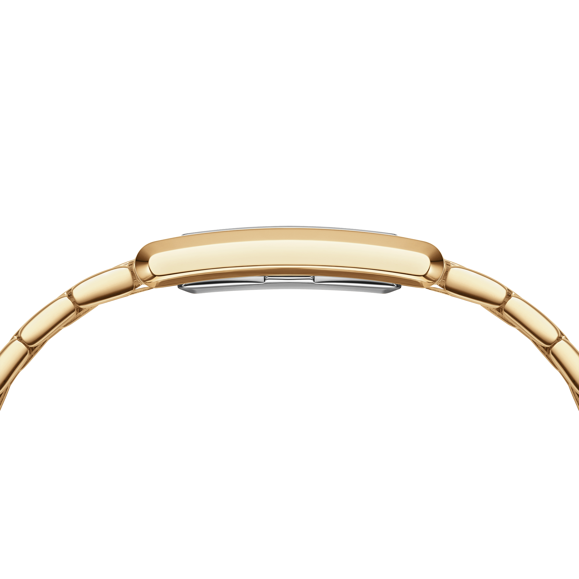With sleek geometric edges and two sizes to choose from, our Bound collection brings perfect symmetry to your wrist. The curved rectangular case of this gold watch matches the exact width of its 9-link strap—giving you a seamlessly integrated dial.