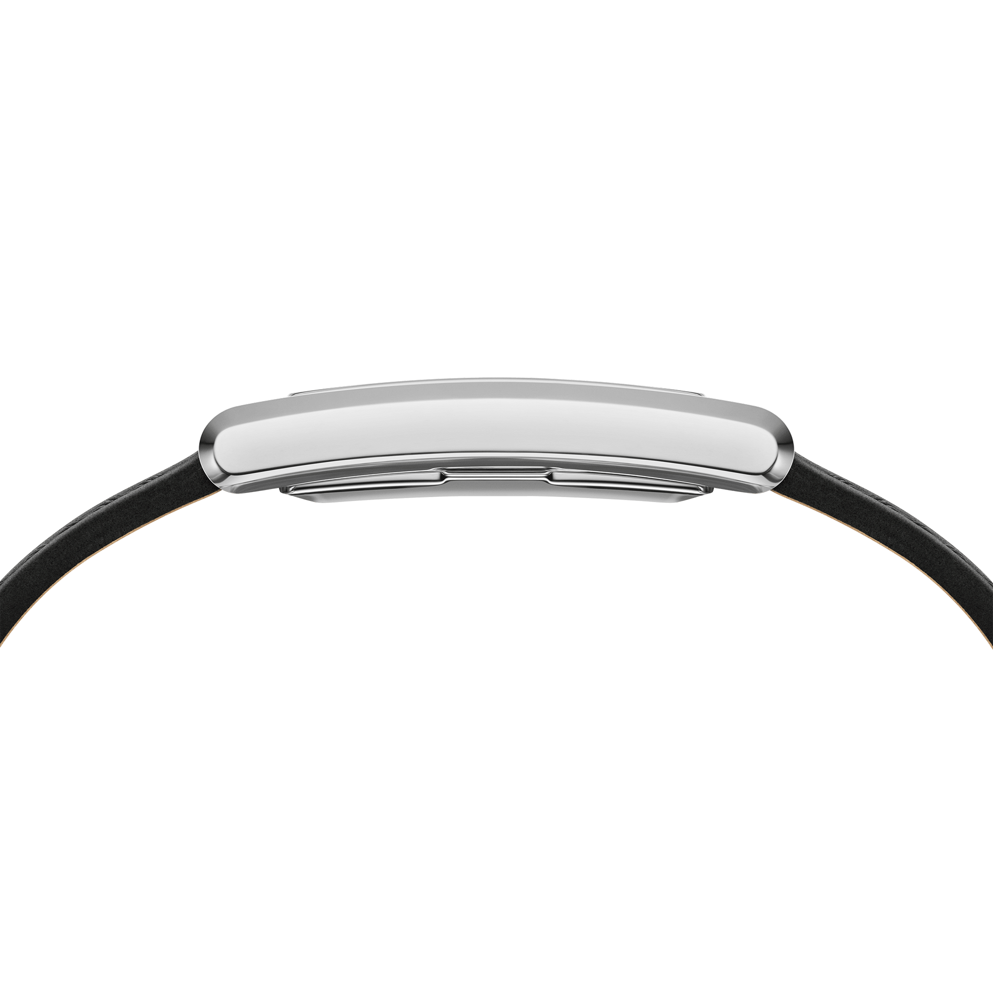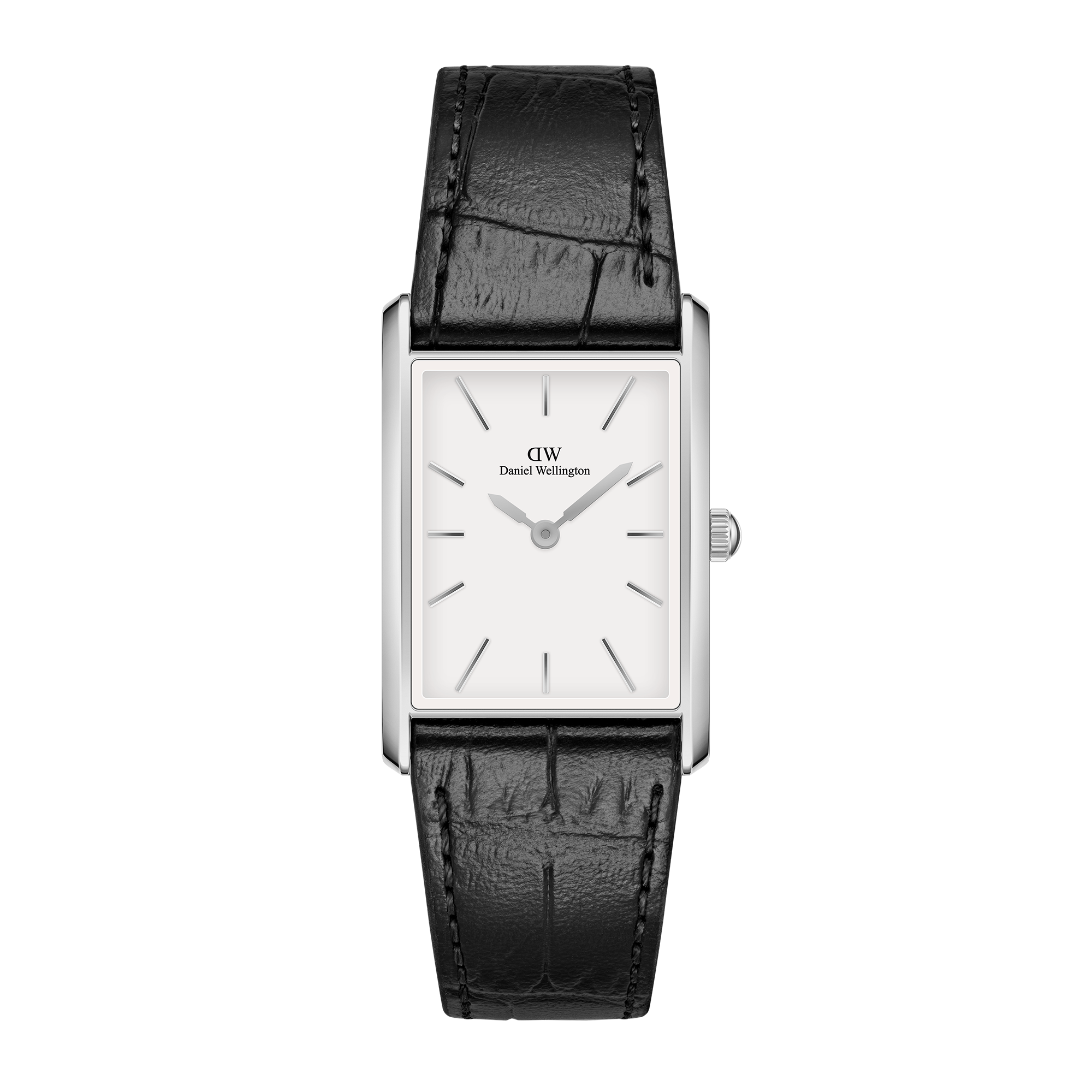With sleek geometric edges and two sizes to choose from, our Bound collection brings perfect symmetry to your wrist. The curved rectangular case of this silver watch matches the exact width of its crocodile pattern black leather strap—giving you a seamlessly integrated dial.
