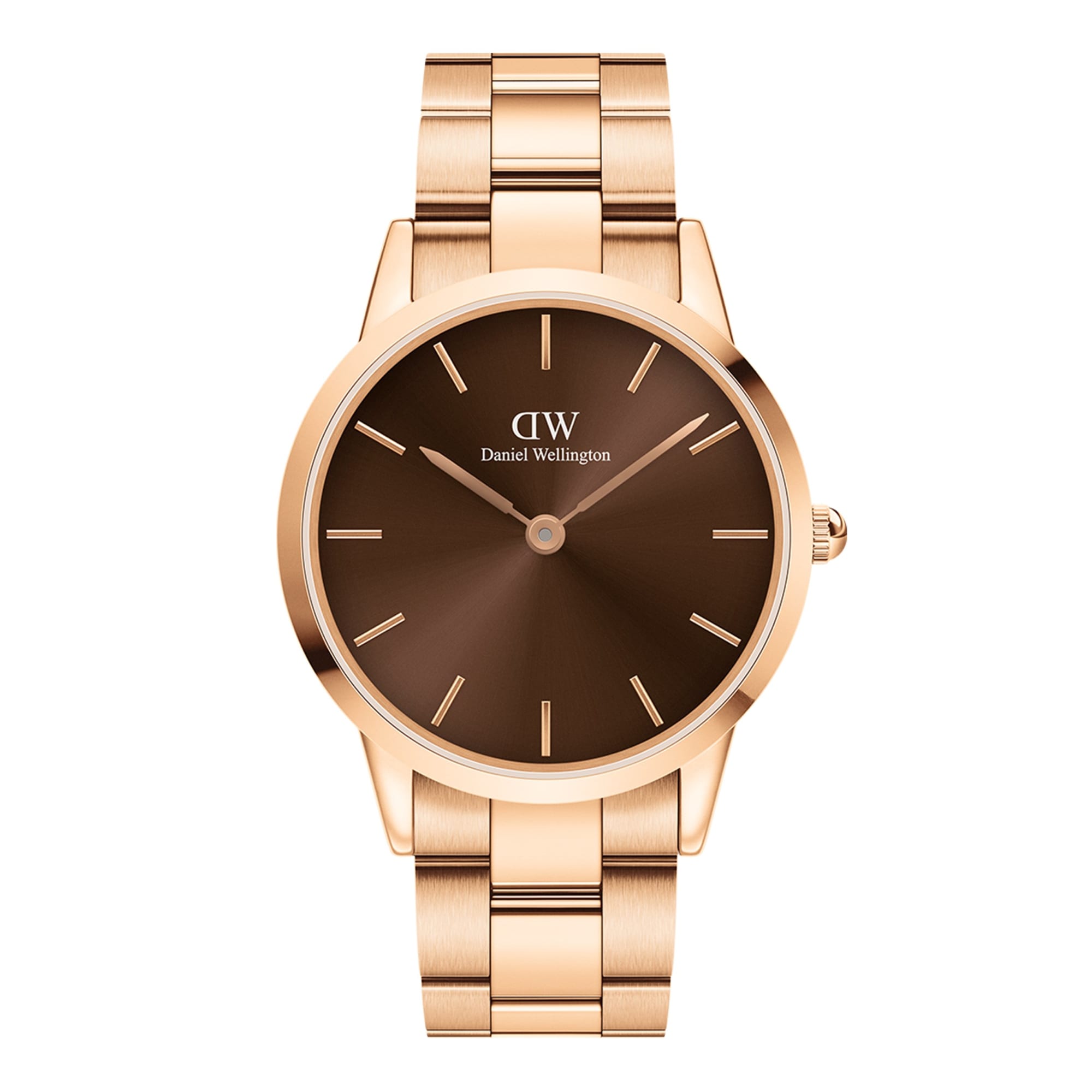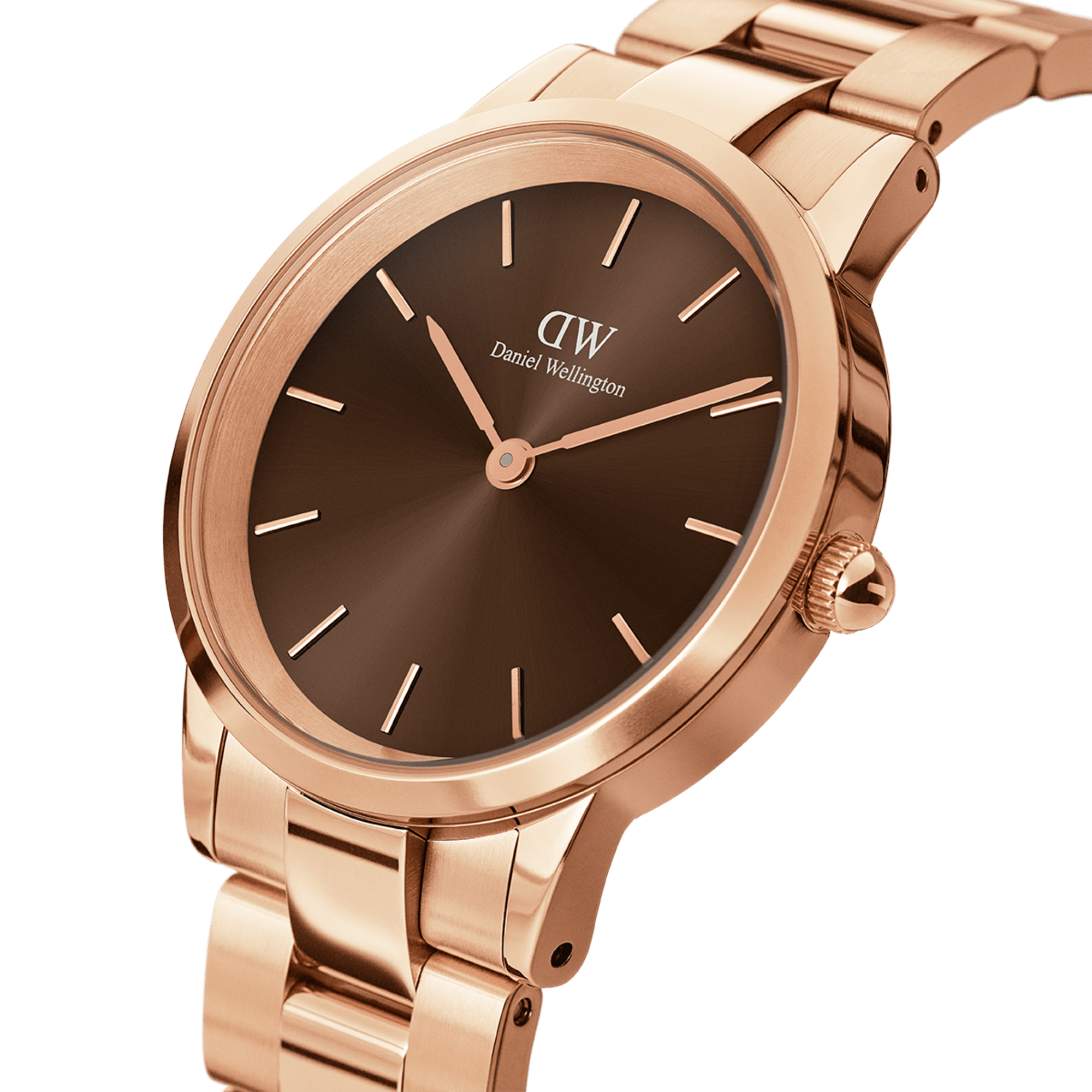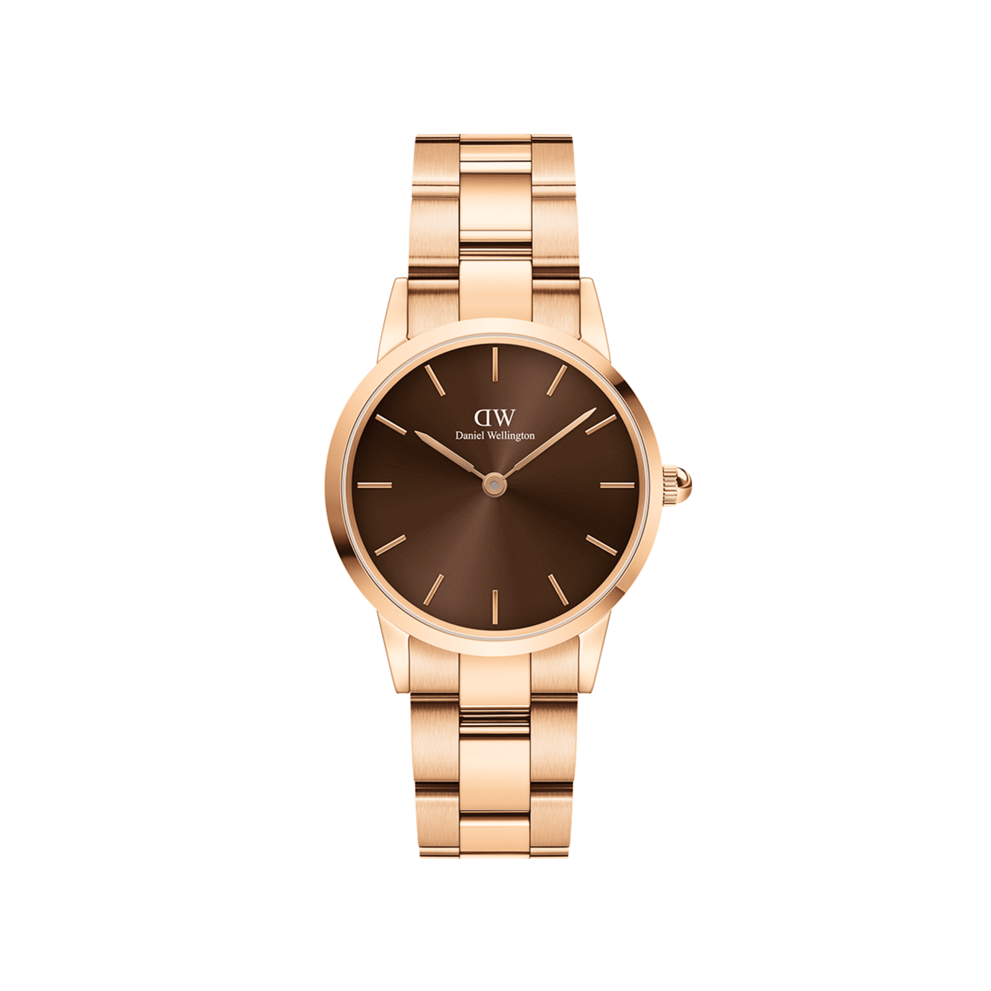 The Iconic Link Amber features a light brown dial with a sunray finish. A vibrant color associated with warmth, energy, and boldness. Crafted with polished stainless steel, available with a refined rose gold plating. An eye-catching timepiece that gives your look a unique touch.