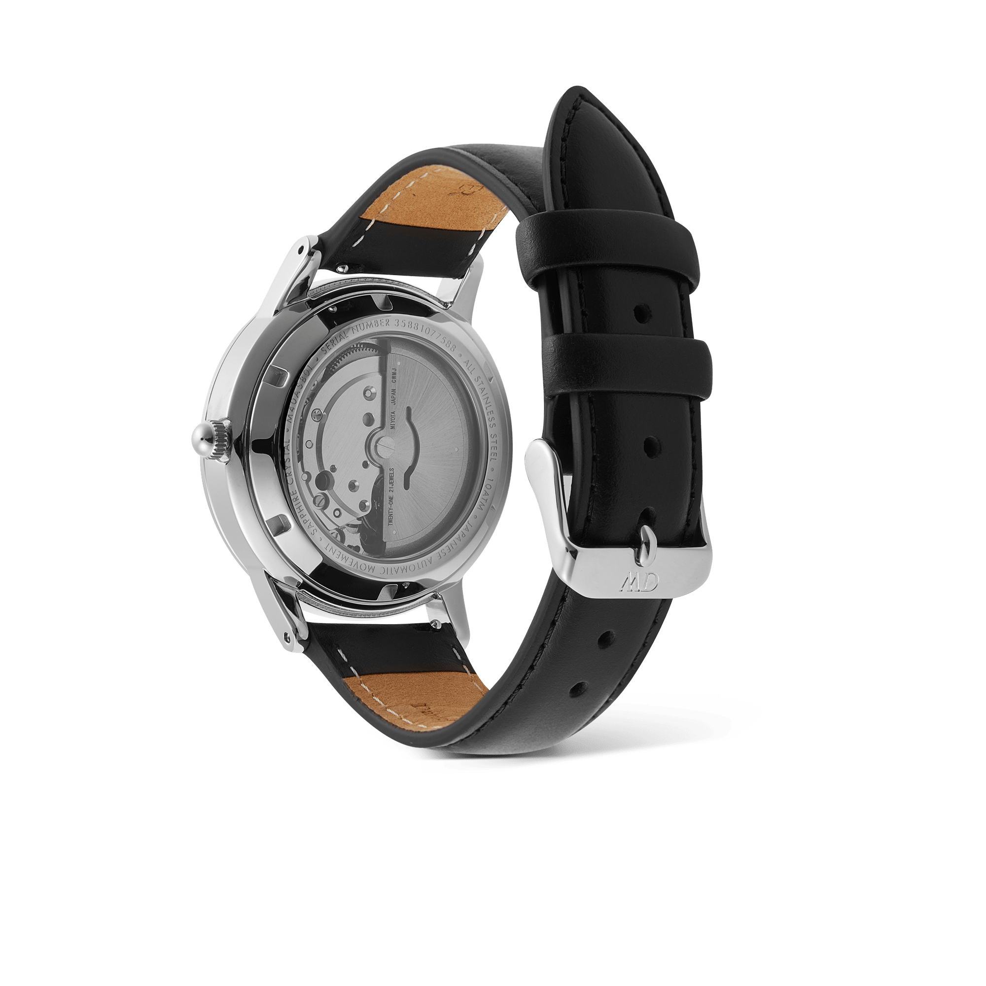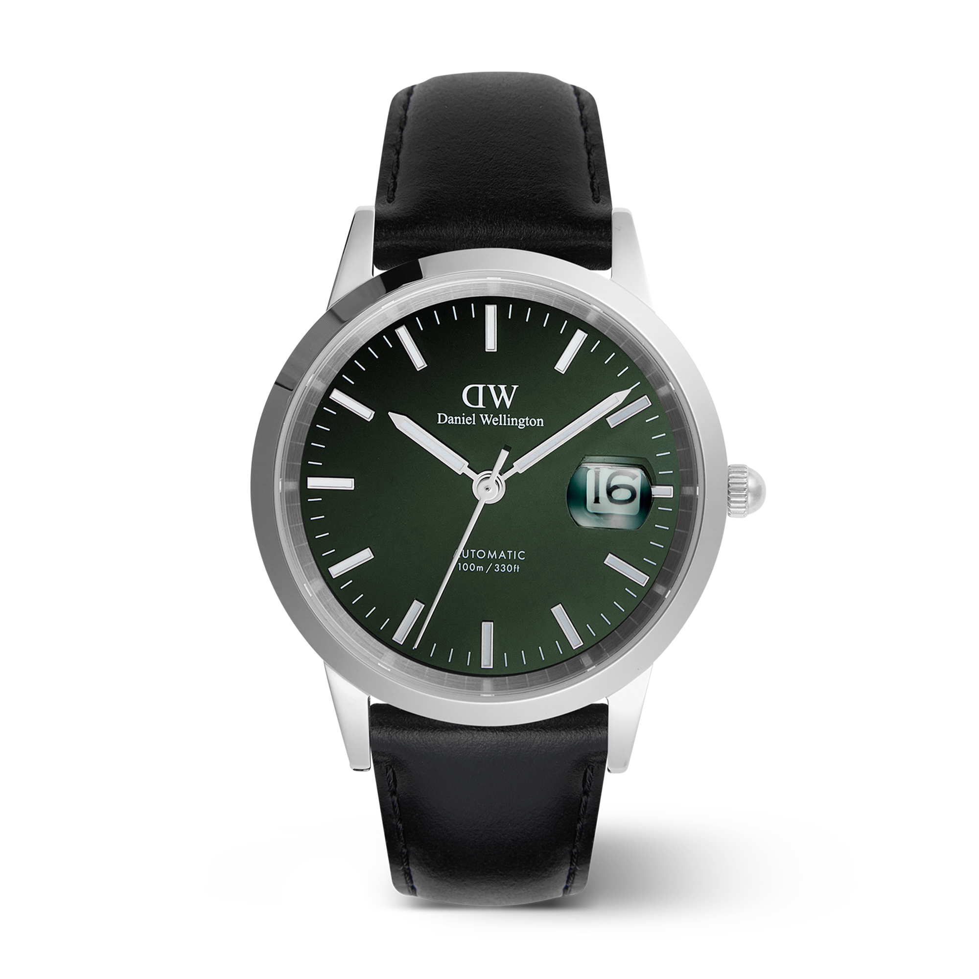 The Iconic Link Automatic is our most advanced timepiece to date, featuring a self-winding movement powered by the motion of your wrist. This version’s emerald green dial has an exclusive enamel finish, delivering a glossy and vivid hue. It boasts glow-in-the-dark index markers and floating hands, a magnified date display, and water-resistance up to 100 meters. The quick release spring bars on the black leather strap make for easy style changes, and there is scratch-resistent sapphire crystal covering the front and back of the silver watch. The exhibition case back exposes the automatic movement inside. A watch designed to get you where you need to be.