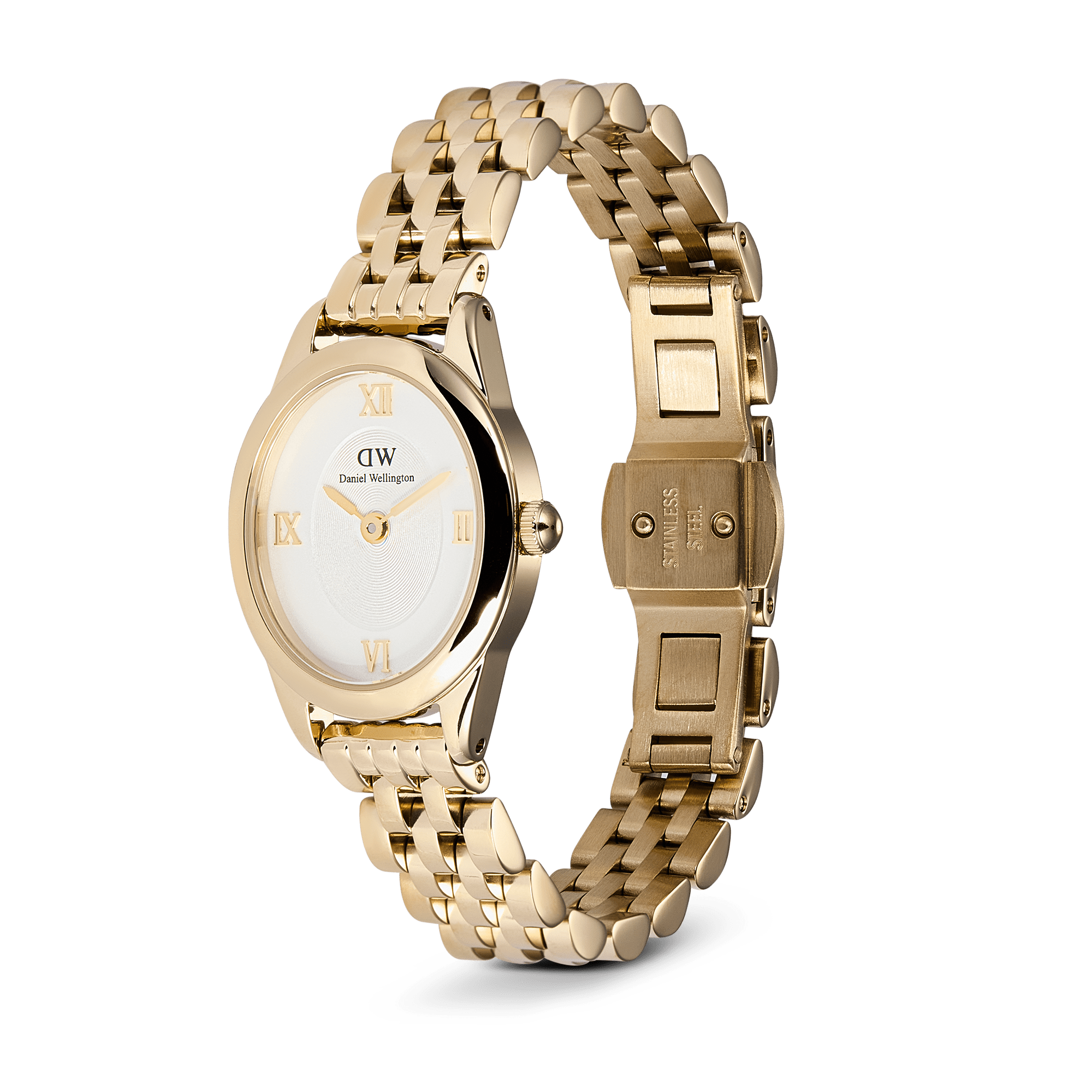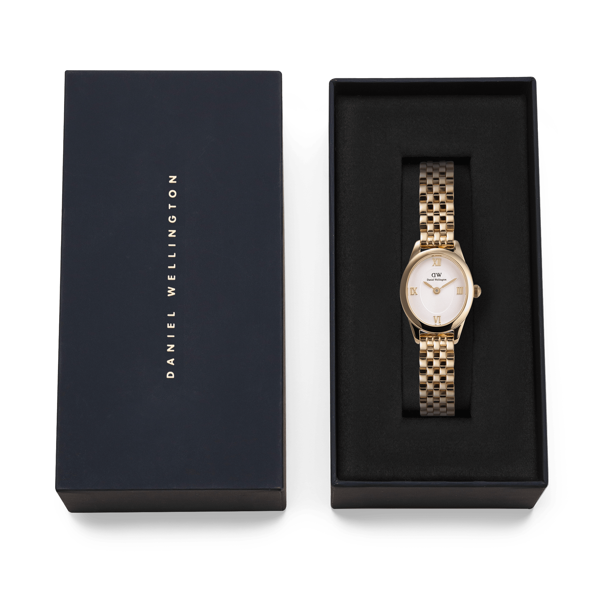 The Ophelia Mini Watch features a dial with an elegant oval shape that diverges from traditional watches. This one-of-a-kind new female watch offers a lot of newness. It comes with a newly designed beans link strap and a butterfly buckle. The slightly heavier oval case enhances its elegant silhouette, while the tapered lugs ensure a smooth transition to the link bracelet. The watch boasts metal Roman numerals atop a disc pattern at the center of the sunray dial, and both the case and bracelet are polished to a bold, shimmering finish.
