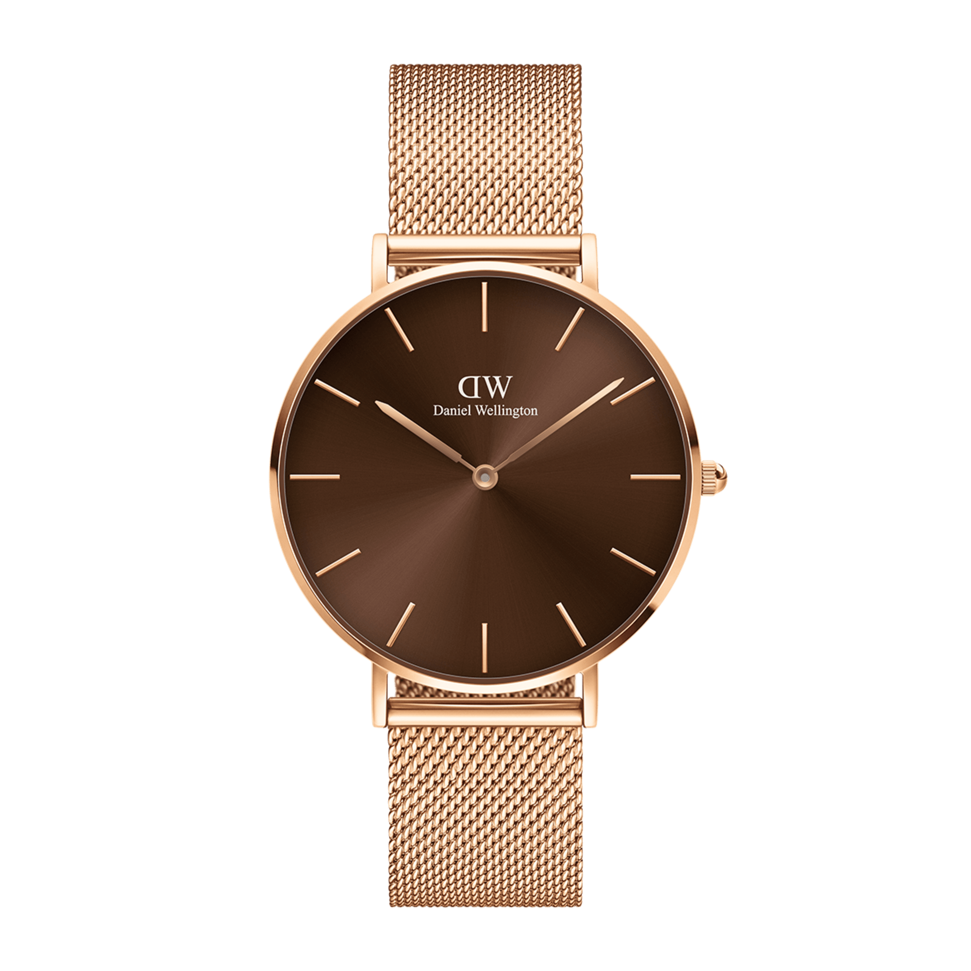The Petite Amber features a light brown dial with a sunray finish. A vibrant color associated with warmth, energy, and boldness. Crafted with polished stainless steel, available with a refined rose gold plating. A delicate and chic timepiece that gives your look a unique touch.