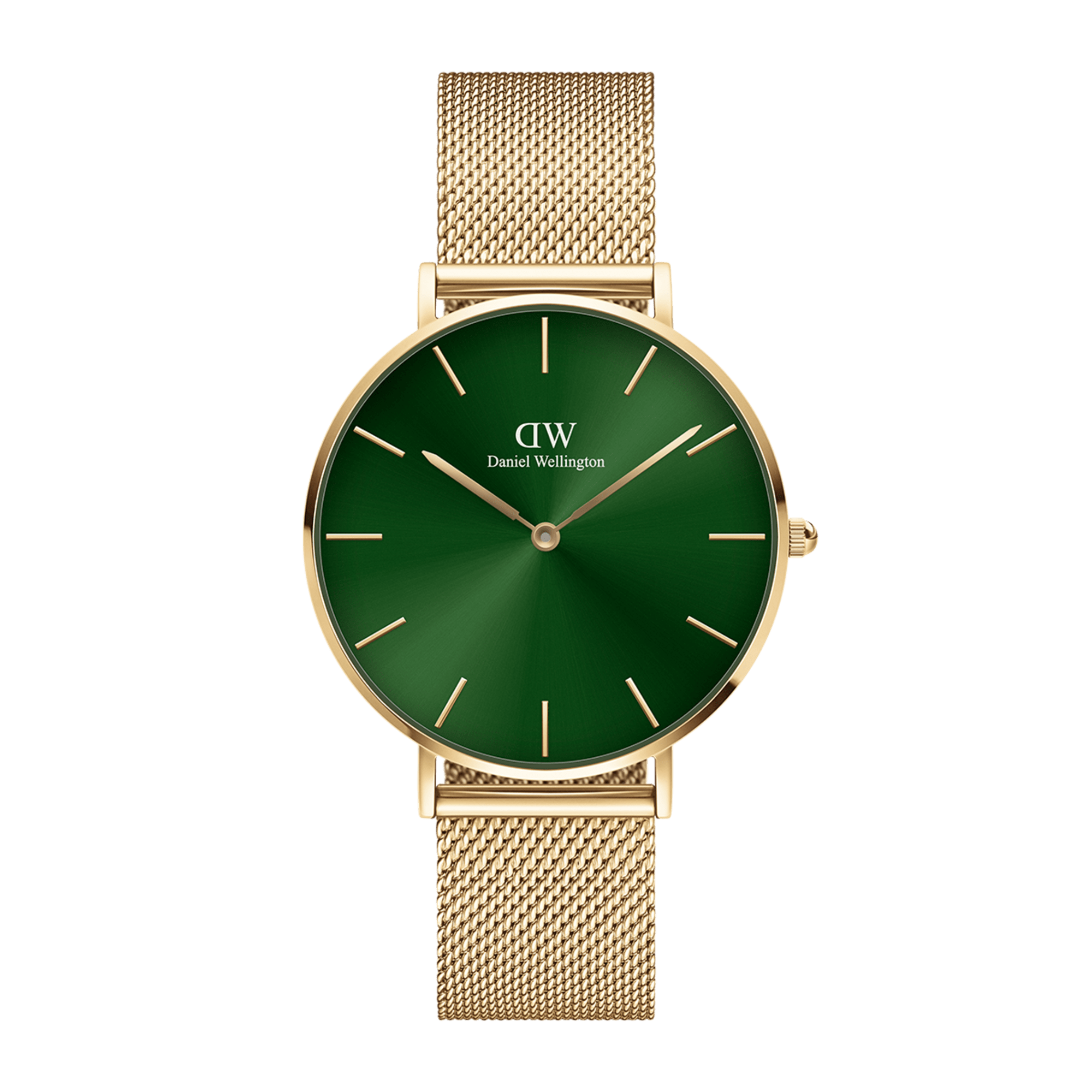The Petite Emerald features a dark green dial with a sunray finish. A color that symbolizes balance, harmony, and good luck. Crafted with polished stainless steel, available with a refined gold plating. A bold timepiece that gives your look a unique touch.
