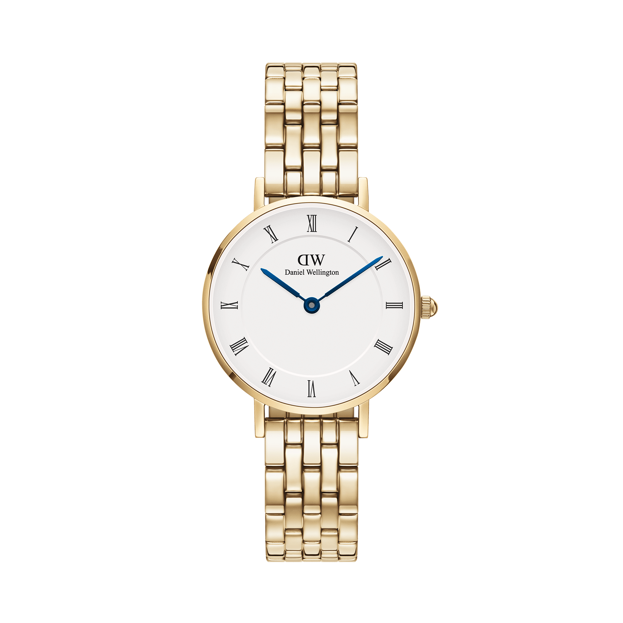 With vintage-inspired design details—like the Roman numeral dial and blue steel hands—this version of our Petite watch strikes just the right balance between old-school and trending now. Features an interchangeable 5-link strap in gold.