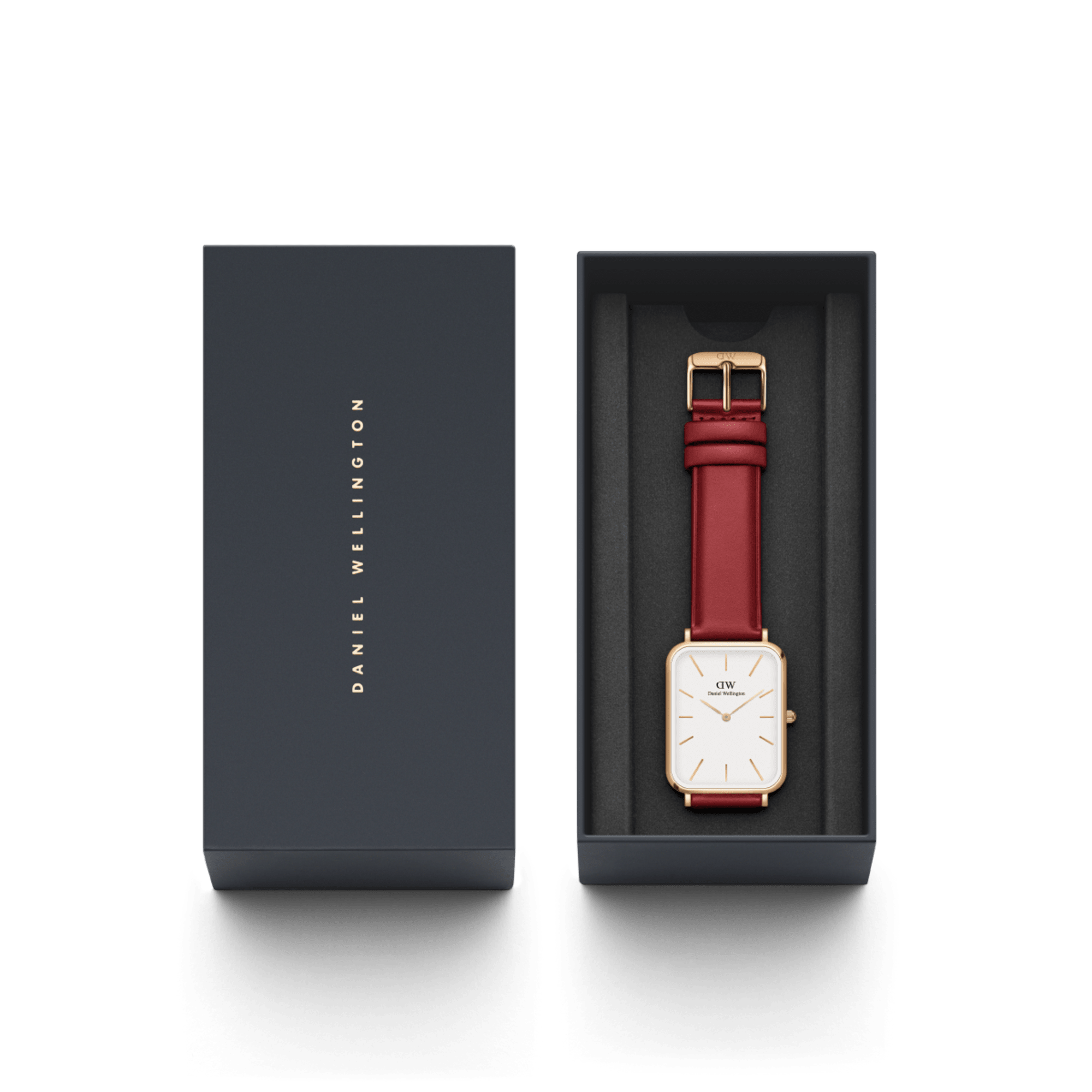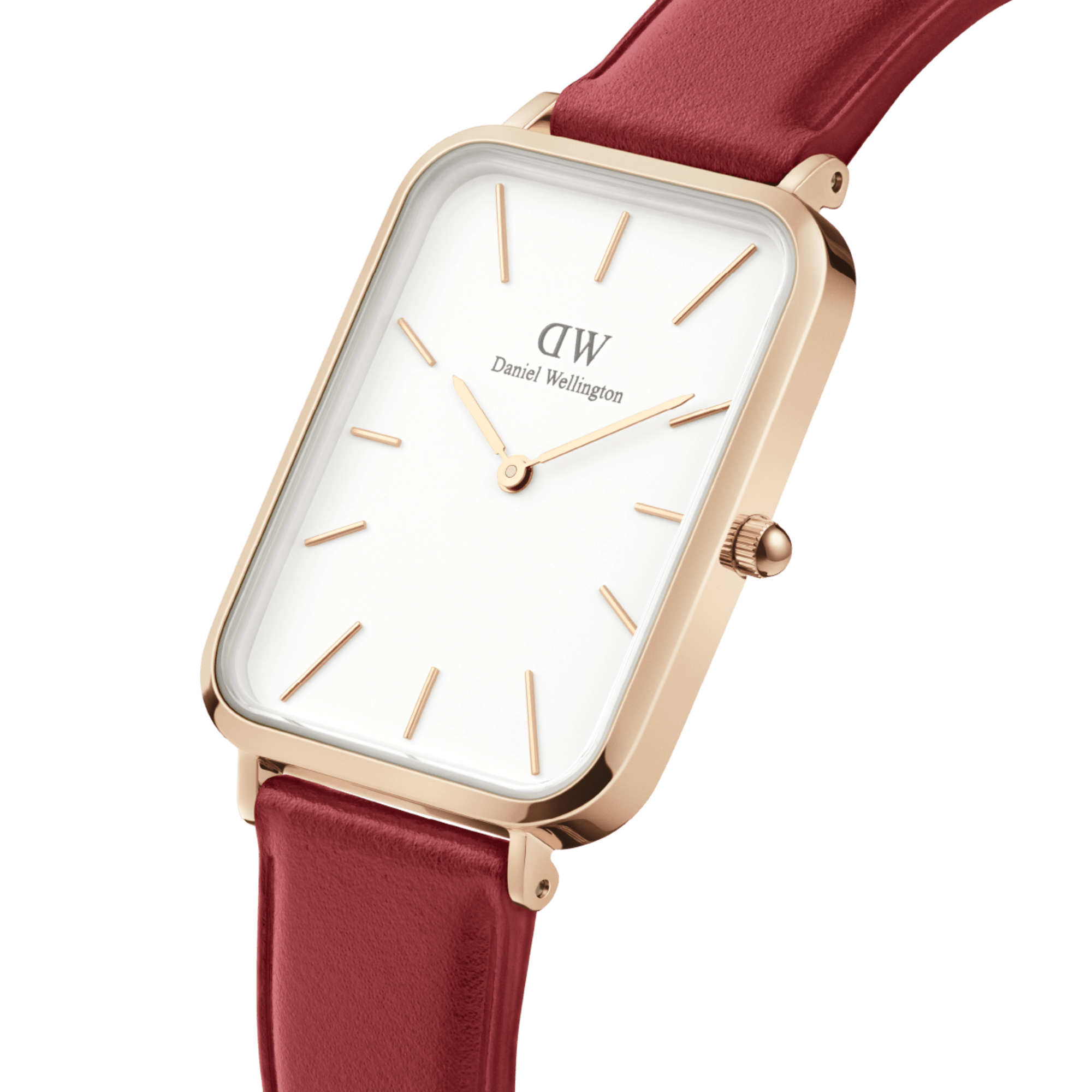 The Quadro is our first square-dial timepiece, crafted with polished stainless steel and available in a refined rose gold plating finish. A pressed leather watch strap in maple leaf red that’s perfectly combined with classic white and rose gold details. Elevate your look with a unique edge.