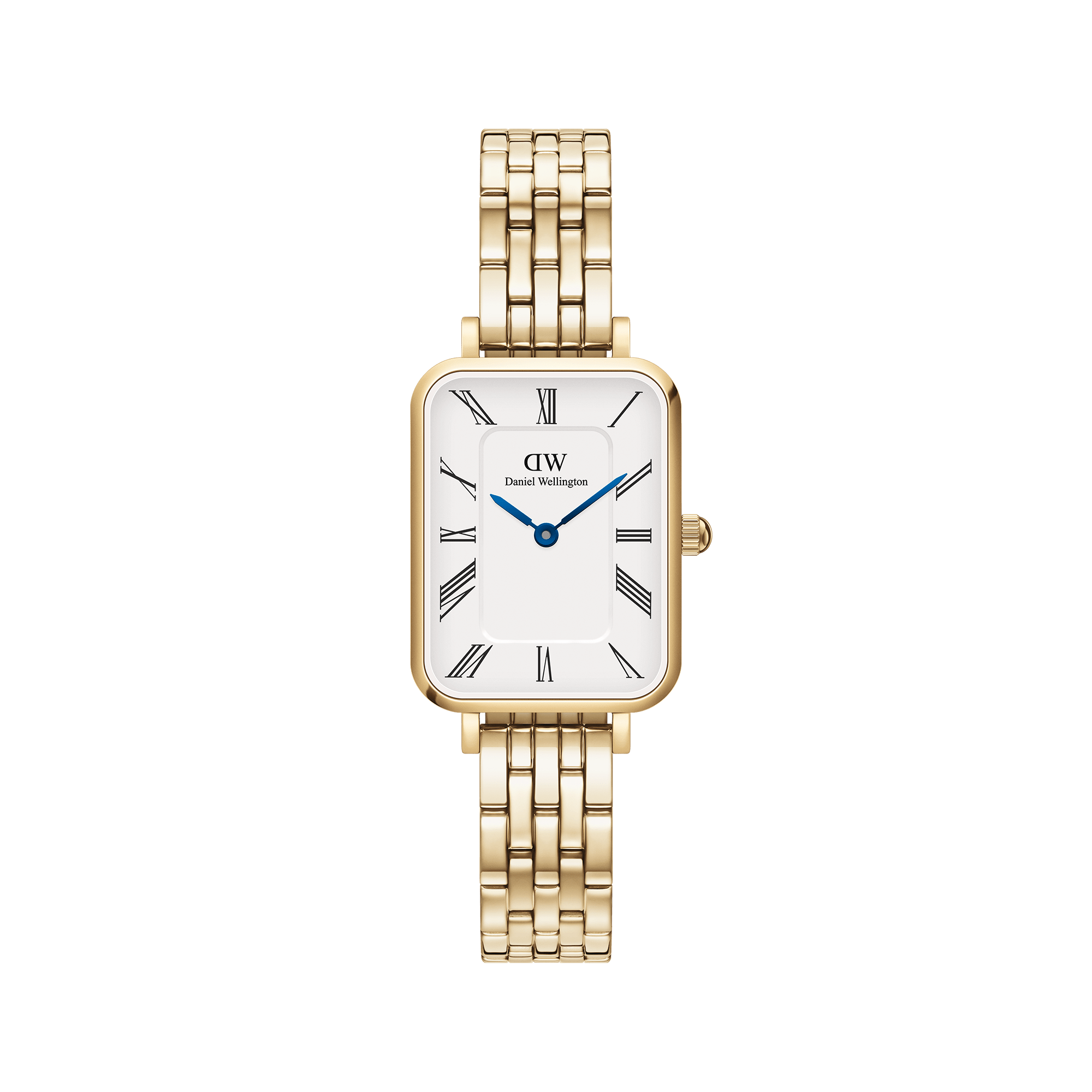 With vintage-inspired design details—like the Roman Numeral dial and blue steel hands—this version of our Quadro watch strikes just the right balance between old-school and trending now. Features an interchangeable 5-link strap in gold.
