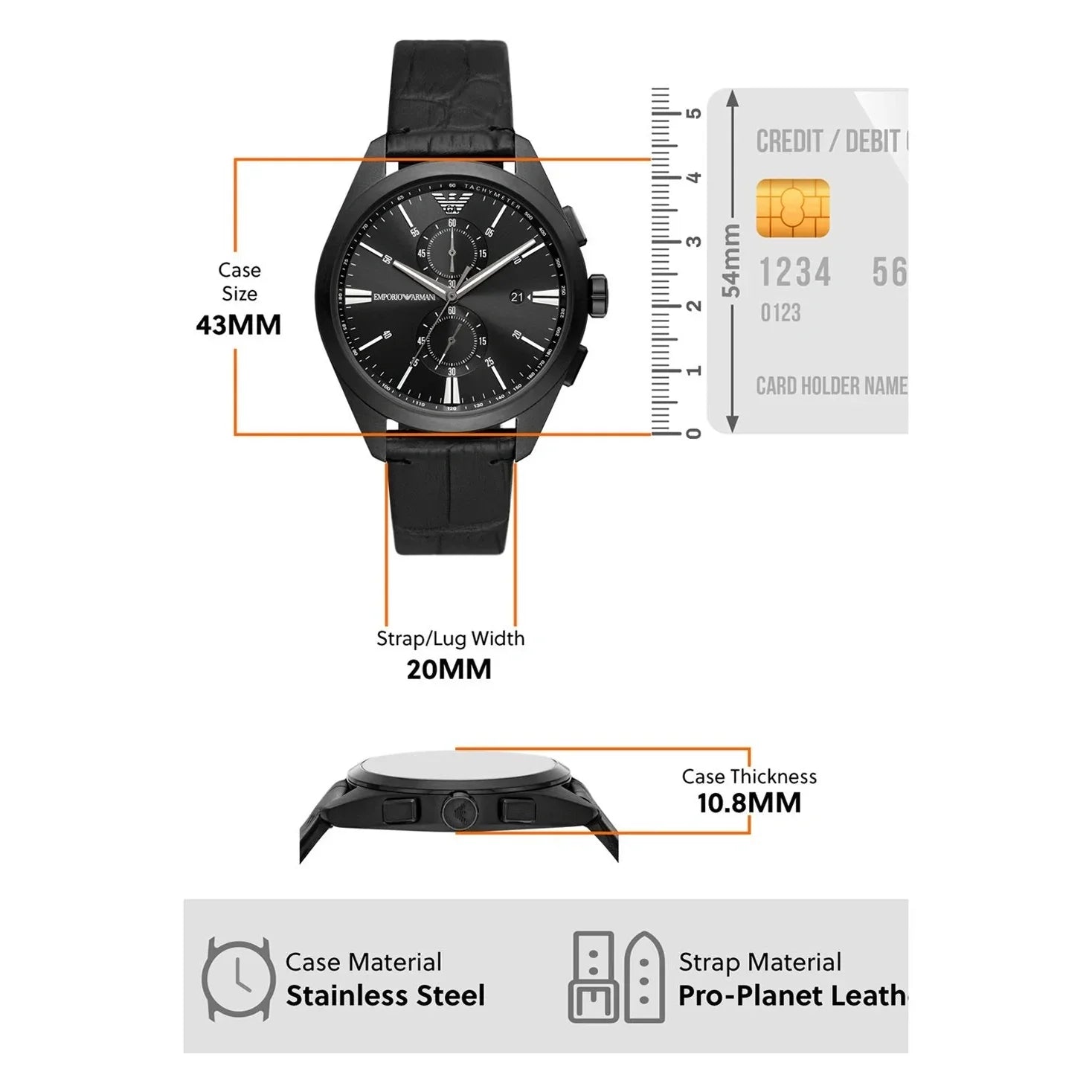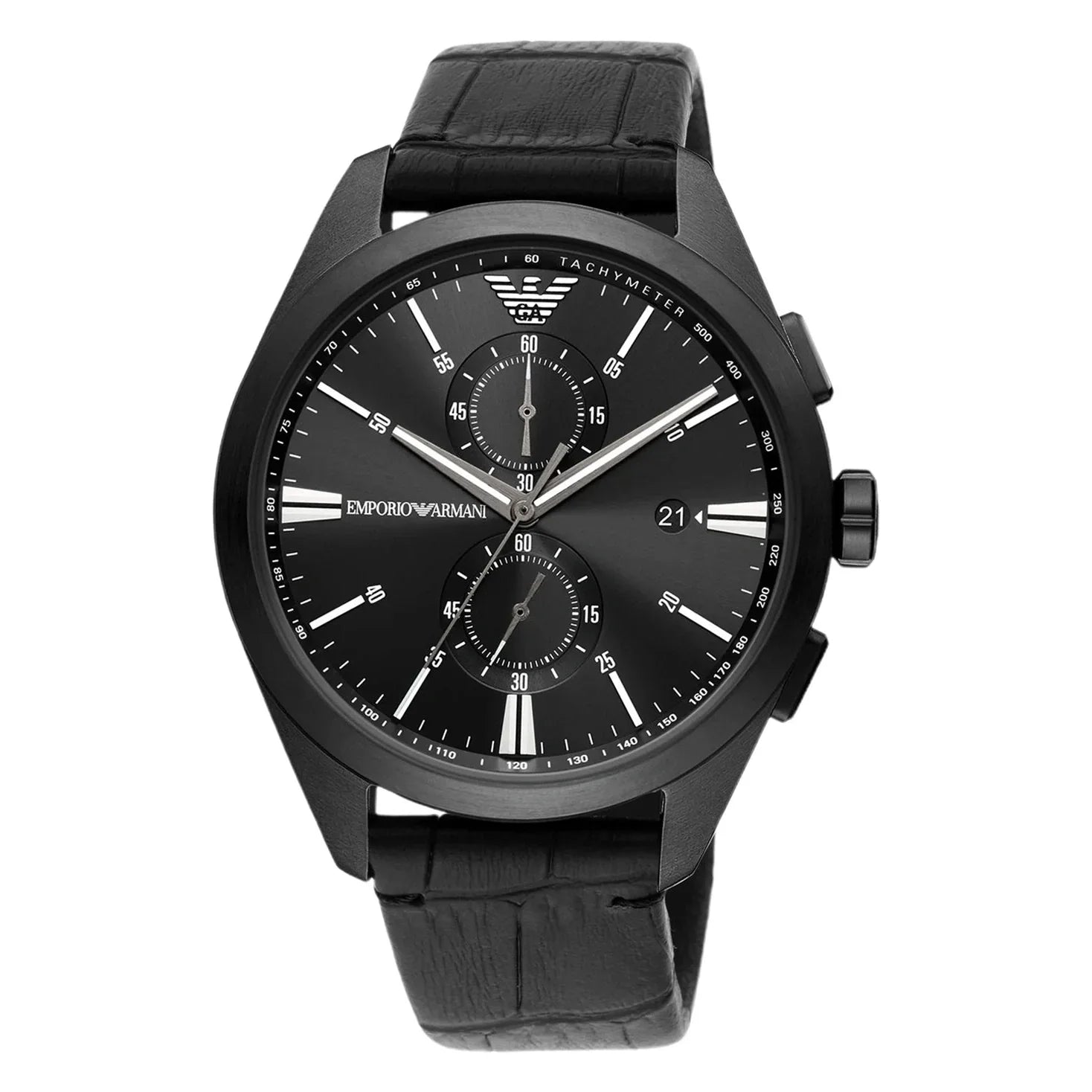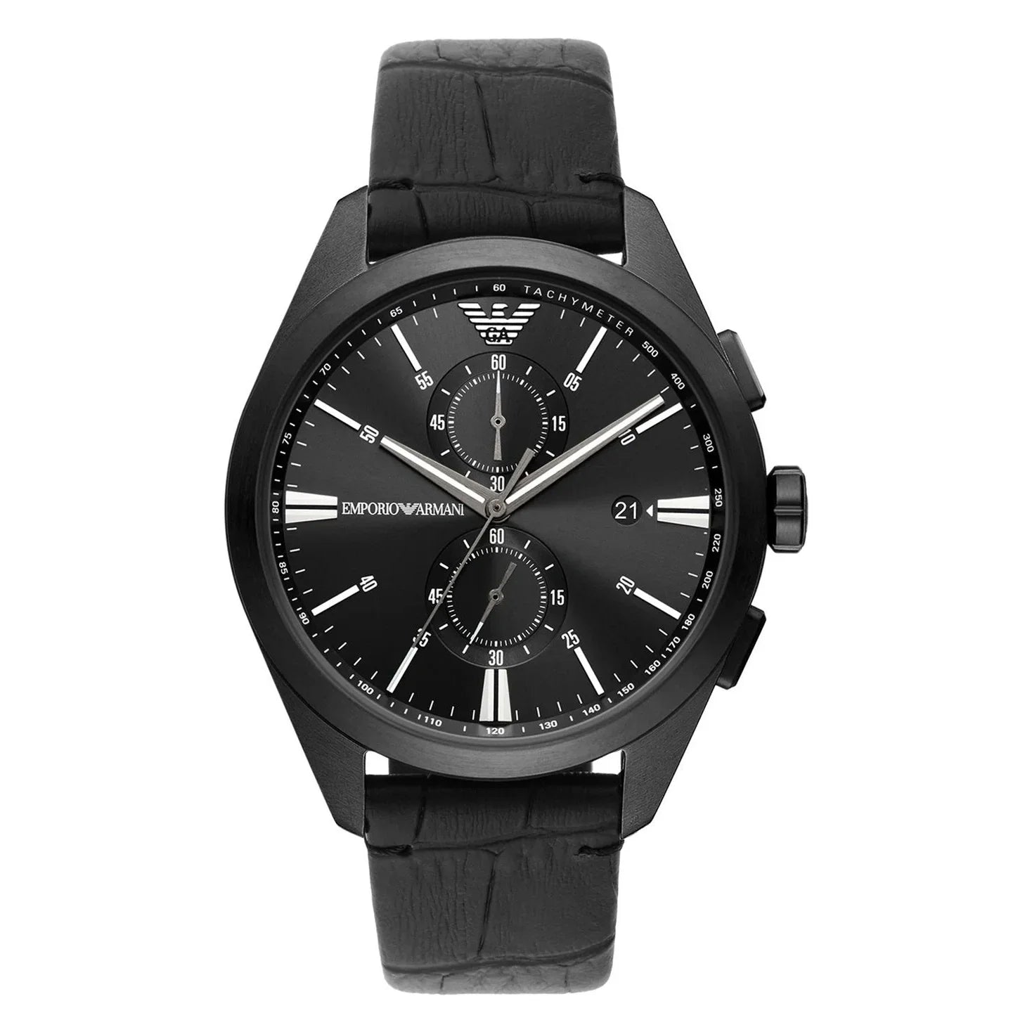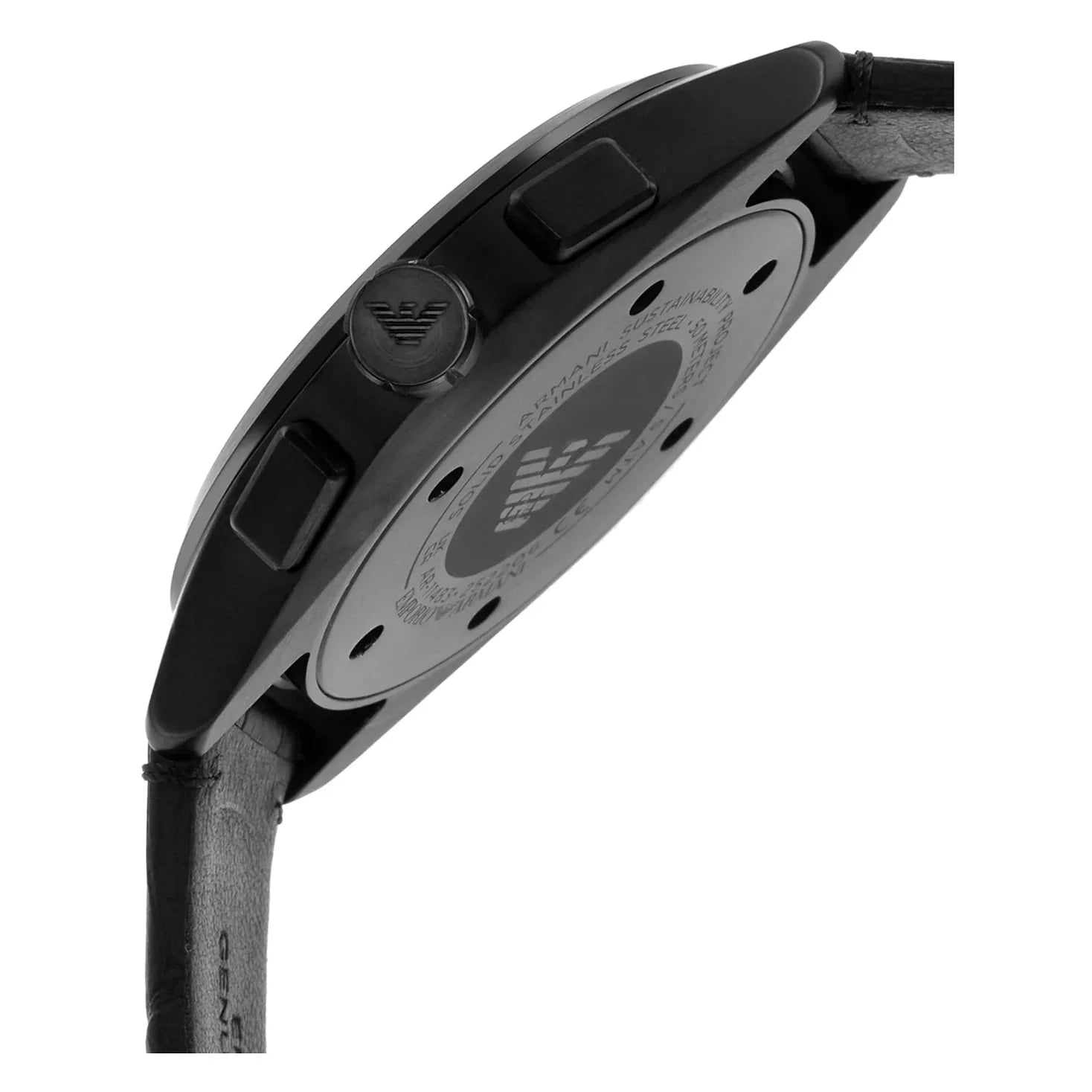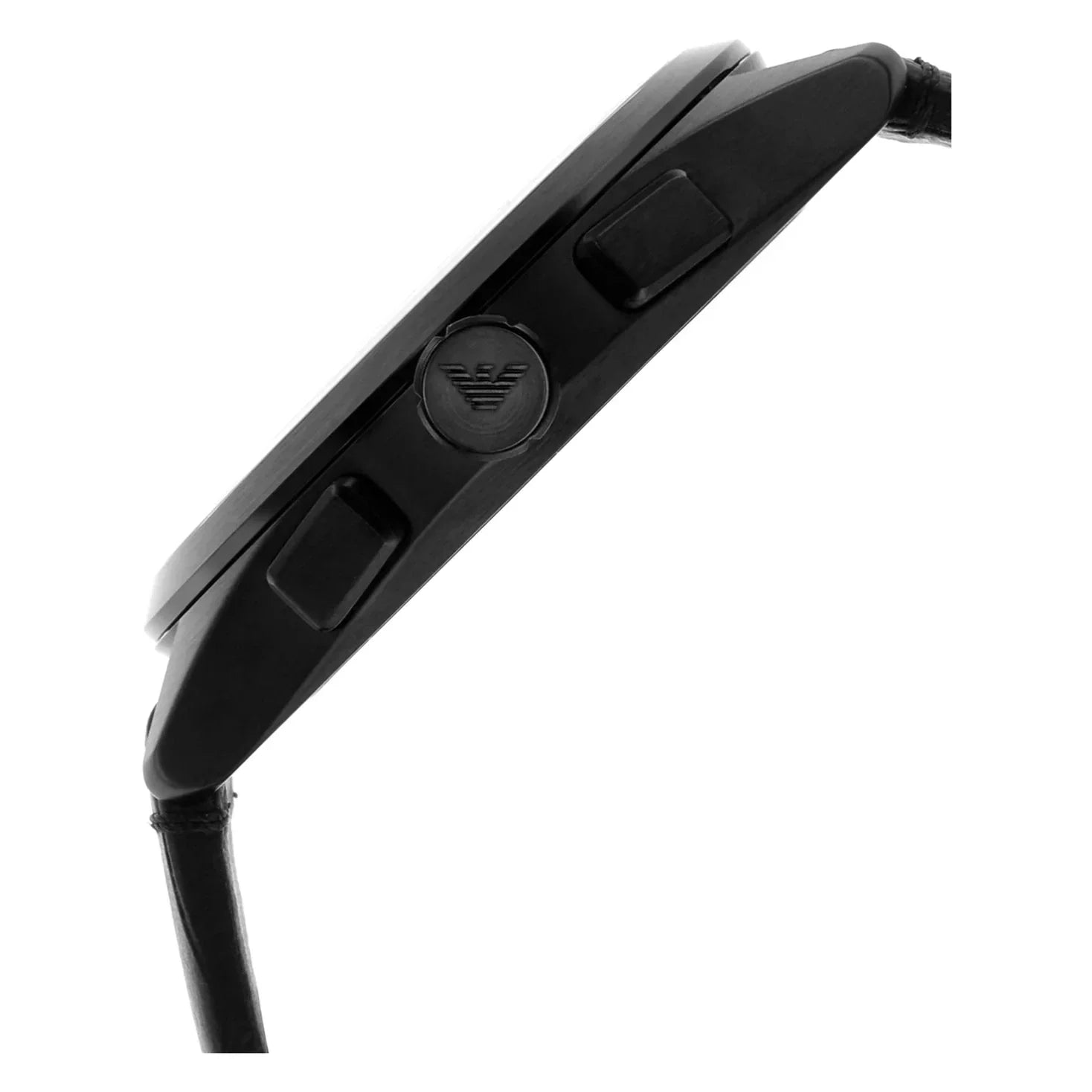 Introducing the must-have timepiece for watch aficionados, the Emporio Armani Men's Watch. With its sleek black strap and protected black round dial, this watch boasts both style and function. Featuring a chronograph and time adjustment crown, it's a perfect addition to any collection.