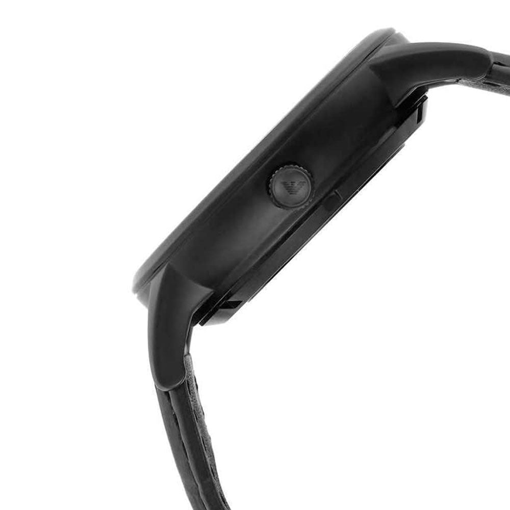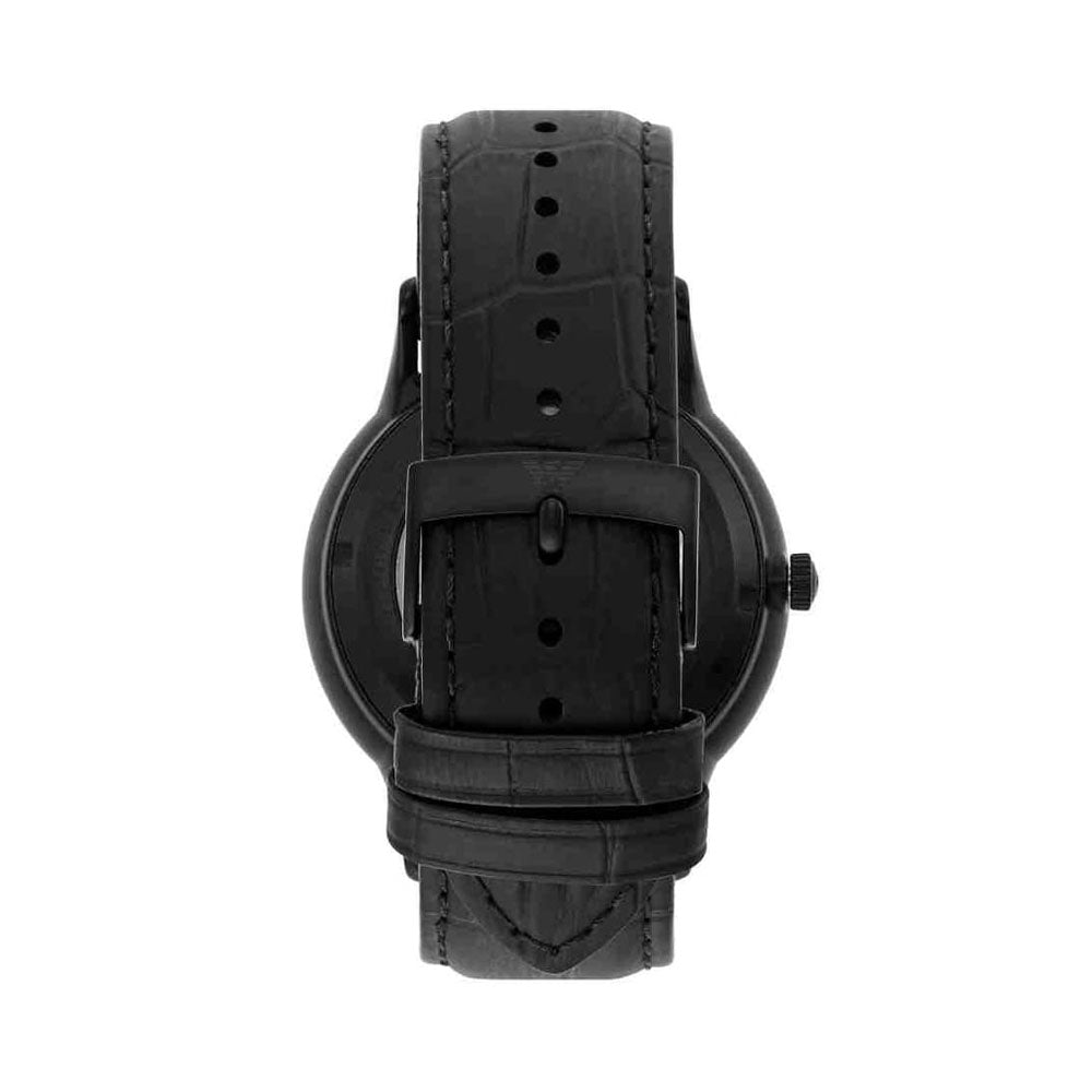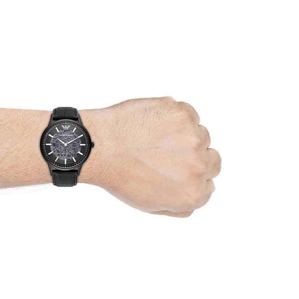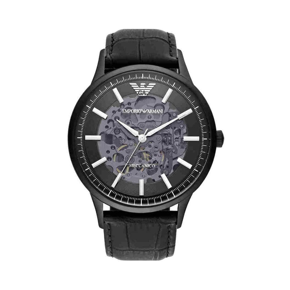 Go to the shopEmporio Armani's 43mm watch features a black cd finish, sunray skeleton dial, white stick indexes, automatic movement and black leather strap.