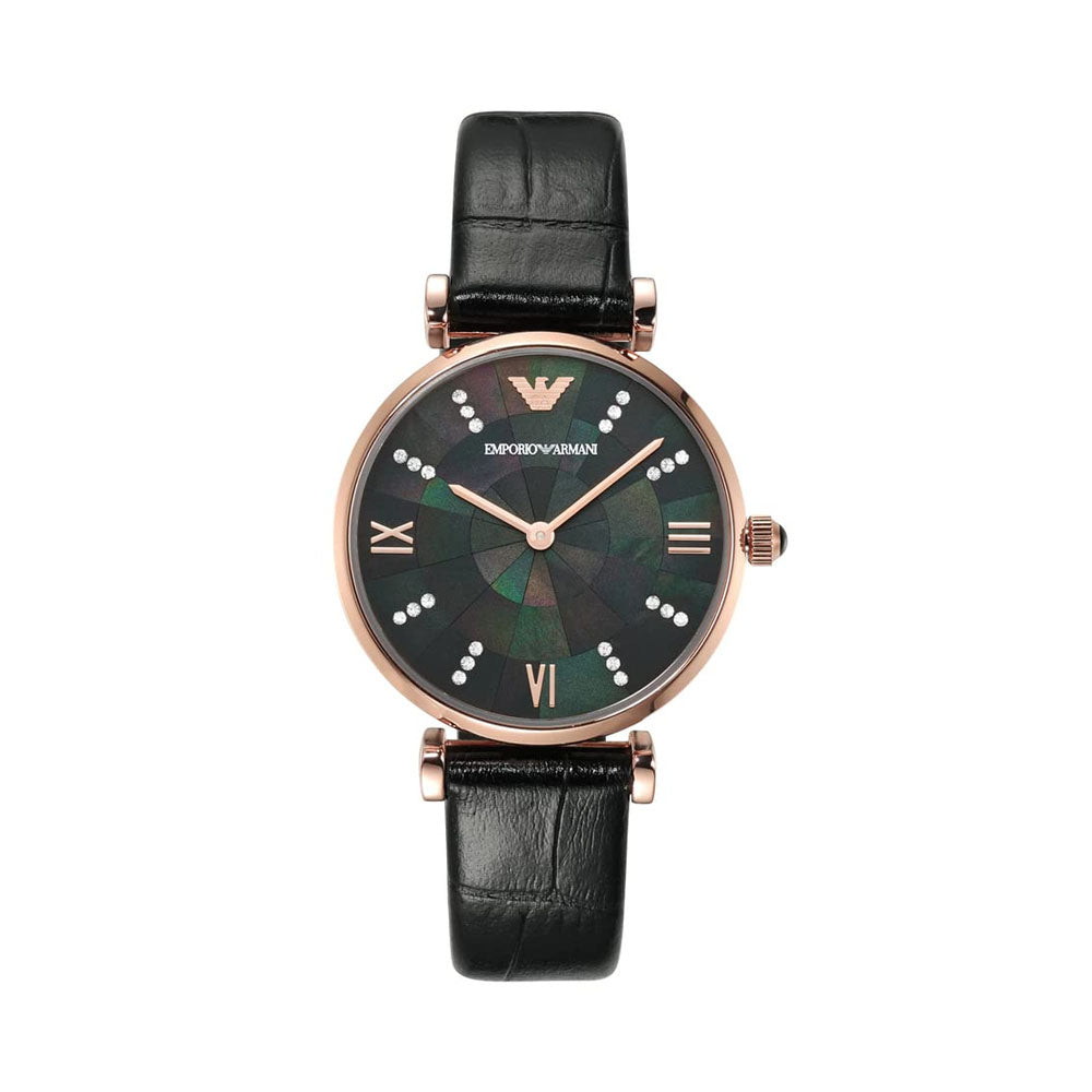 Emporio Armani's 32mm watch features a black mother of pearl glossy dial, at least 50% recycled stainless steel case, two-hand movement and black leather strap.