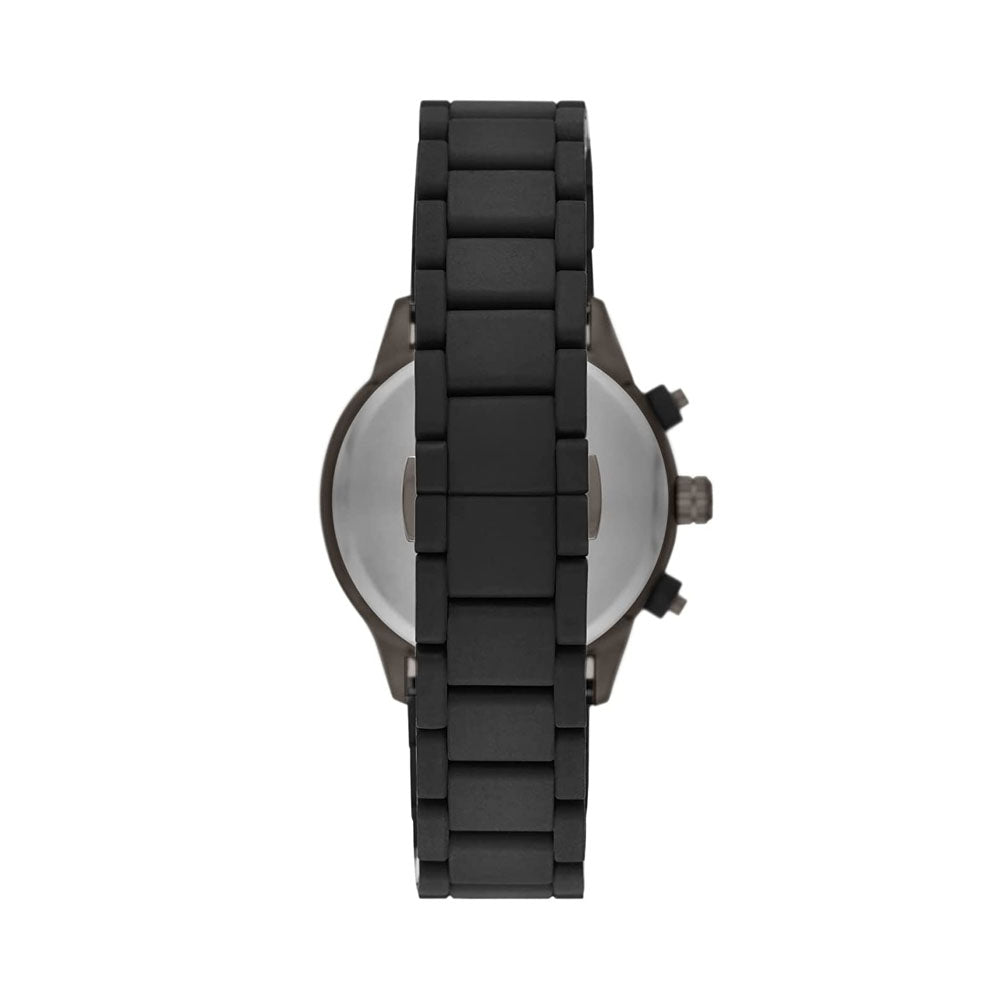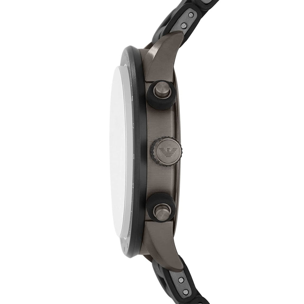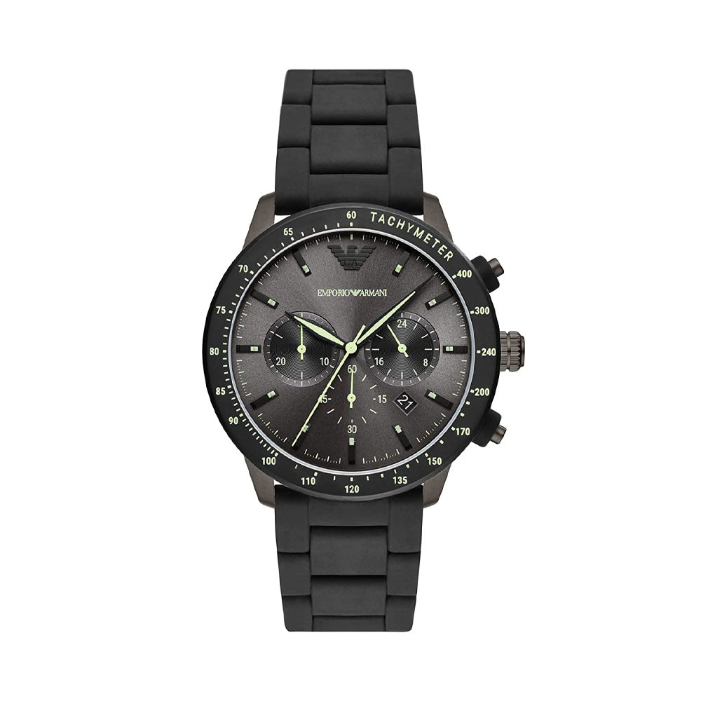Go to the shopEmporio Armani's 43mm watch features a black and gray cd finish, sunray dial, black stick indexes, chronograph movement and black silicone strap.