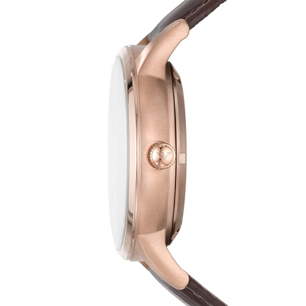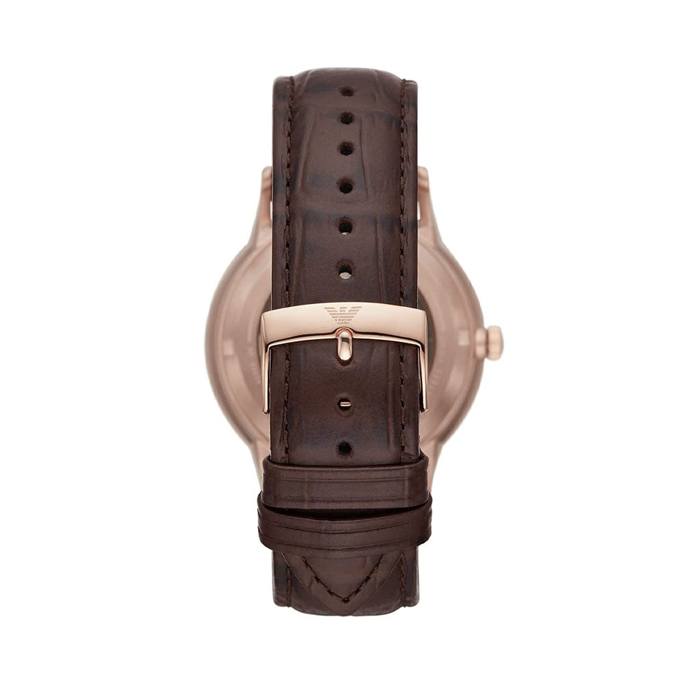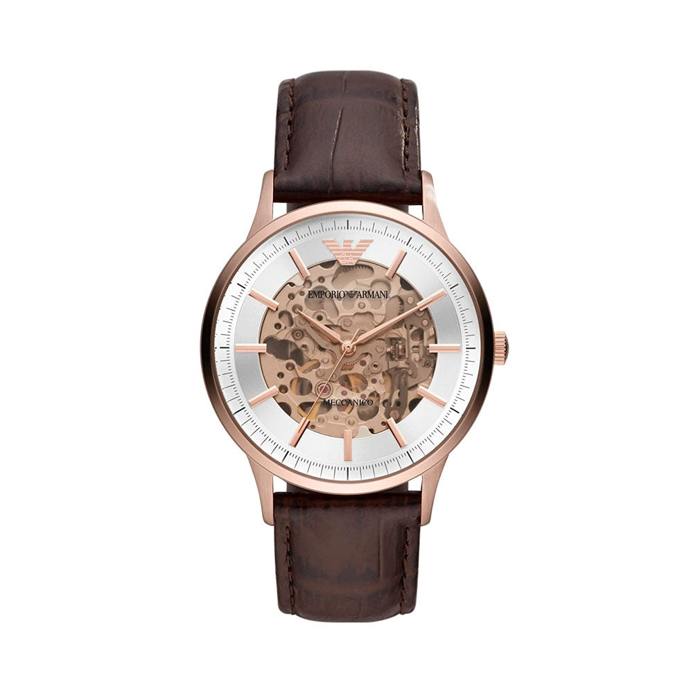 Go to the shopEmporio Armani's 43mm watch features a silver cd finish, sunray skeleton dial, rose gold stick indexes, automatic movement and brown leather strap.