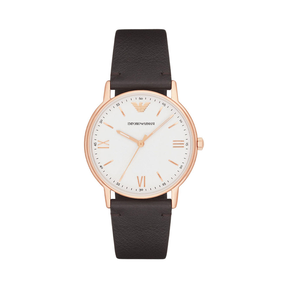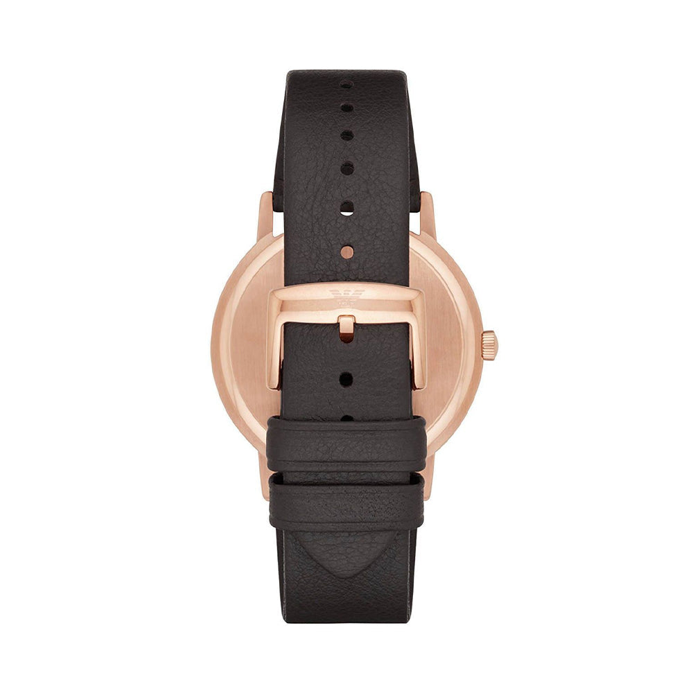 Redefining aristocracy, this men's analog watch by Emporio Armani is a must-have. The watch features a rich-textured black genuine leather strap secured with a rose gold-coloured buckle. The strap contrasts elegantly with the rose gold stainless steel case encasing a round white dial. The dial continues to maintain the nobility of the watch by being absolutely uncluttered with just the rose gold roman numeral hour markings, and three rose gold hands.