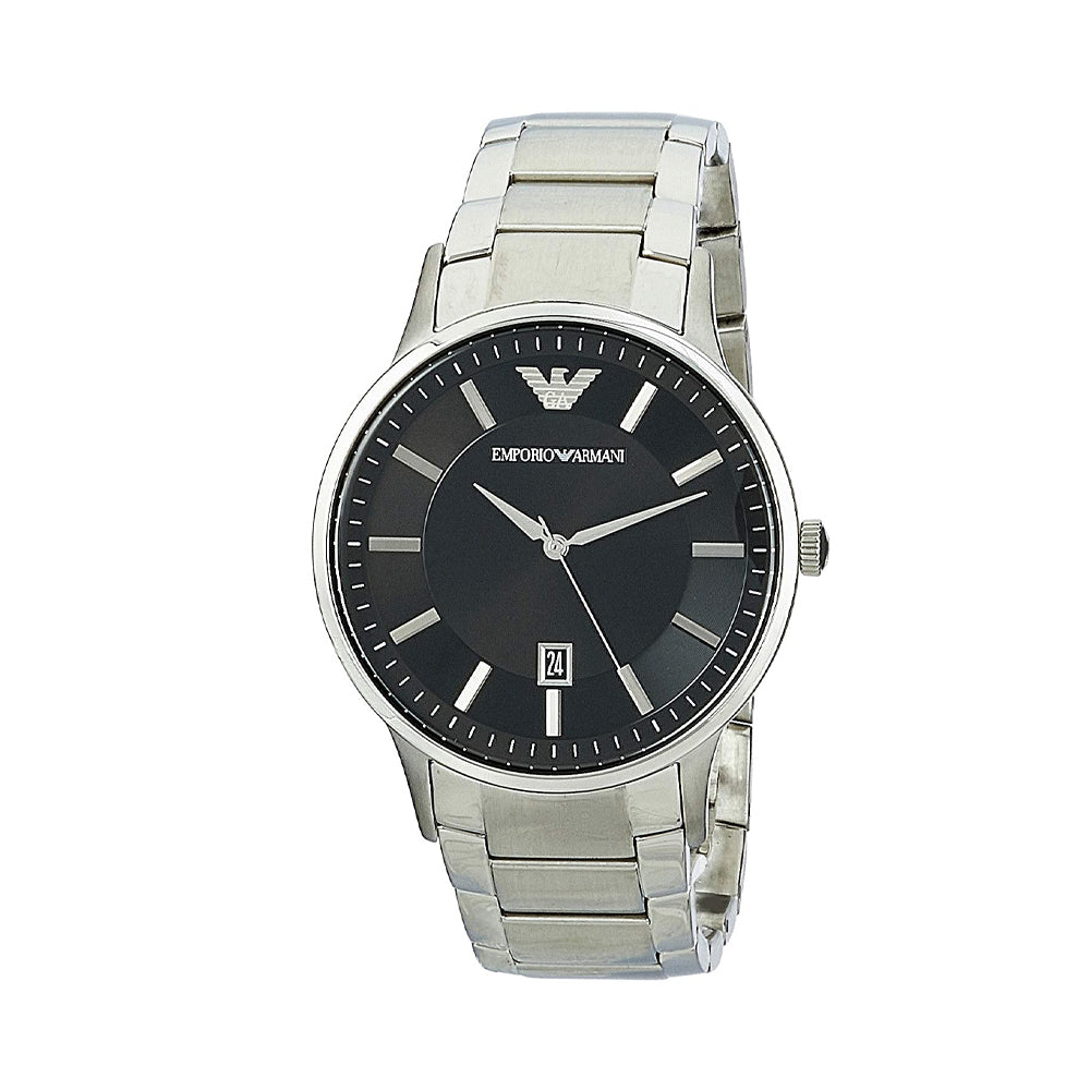 This timeless watch for men from Emporio Armani is a true winner, both in terms of looks and performance. It features a black sunray dial, silver toned-hands, raised stick hour markers with a date window and is powered by a quartz movement. The dial is enclosed in a silver-plated stainless...