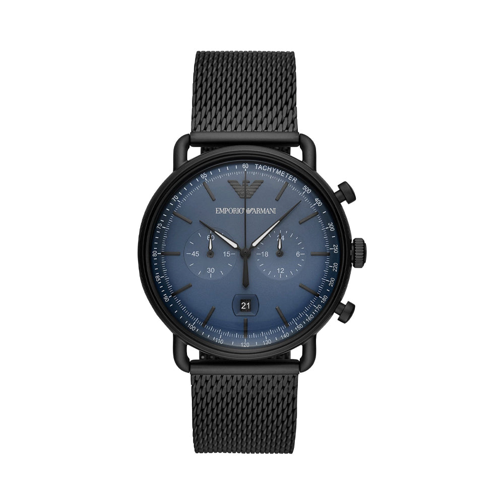 Radiating power, this Aviator-inspired men's Emporio Armani watch is handsomely equipped with a polished stainless steel case, blue sunray chronograph curve dial, three lum hands, and a date window. This watch is held on your wrist by a black mesh bracelet secured by a deployment buckle. If you like to...