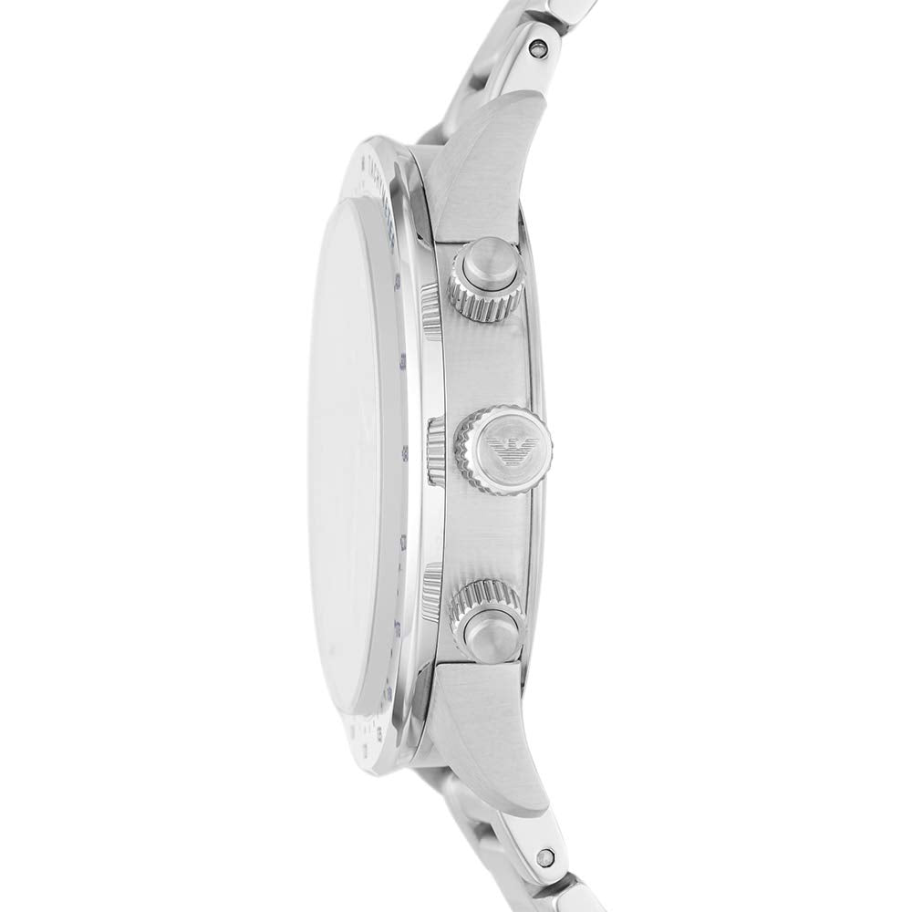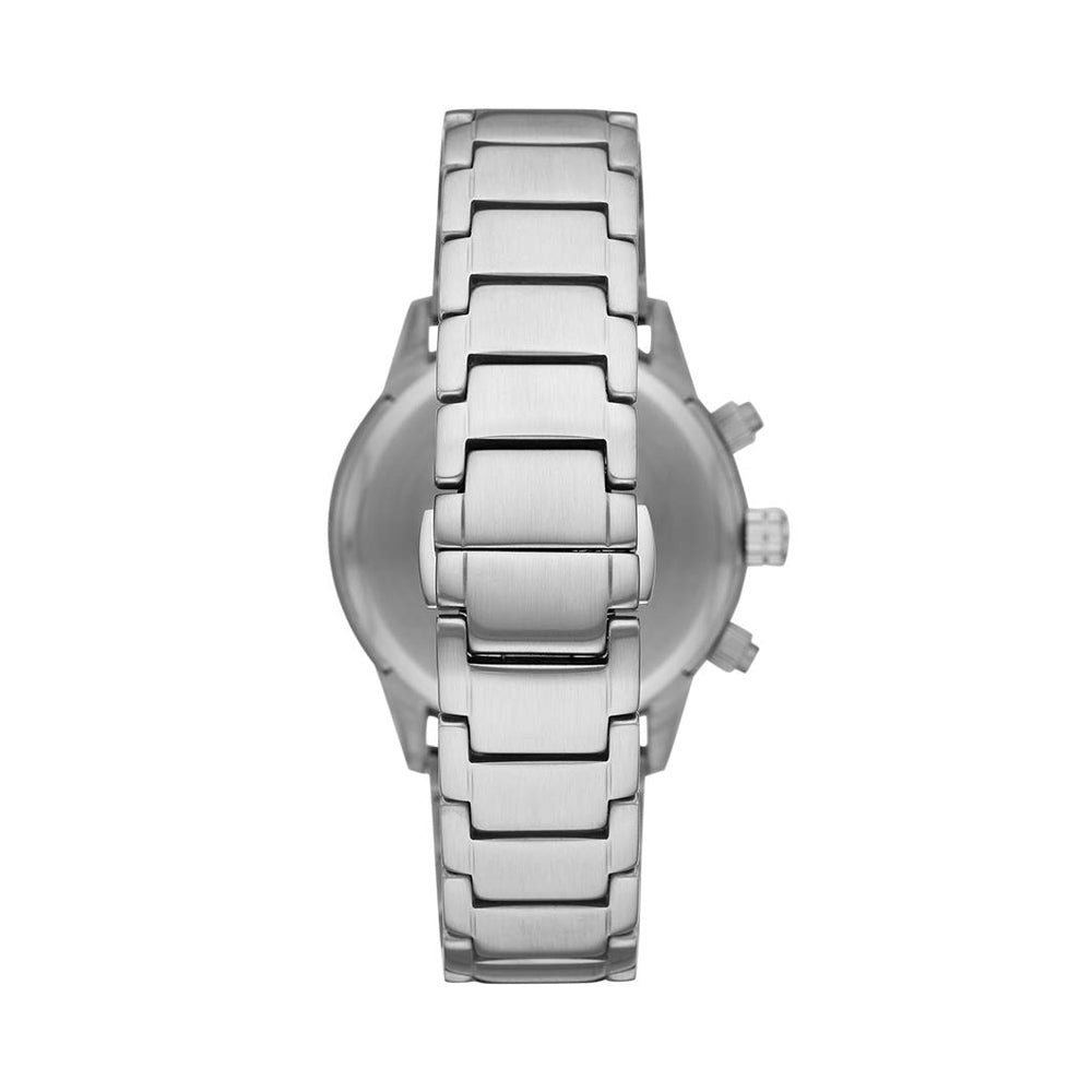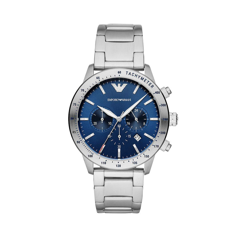 This robust and sturdy men's chronograph Mario watch from Emporio Armani showcases an insanely detailed blue sunray dial, stick indices with tachy meter on the bezel and plain three hands. A bold case and a stainless steel bracelet complete the look.