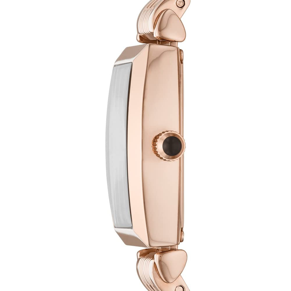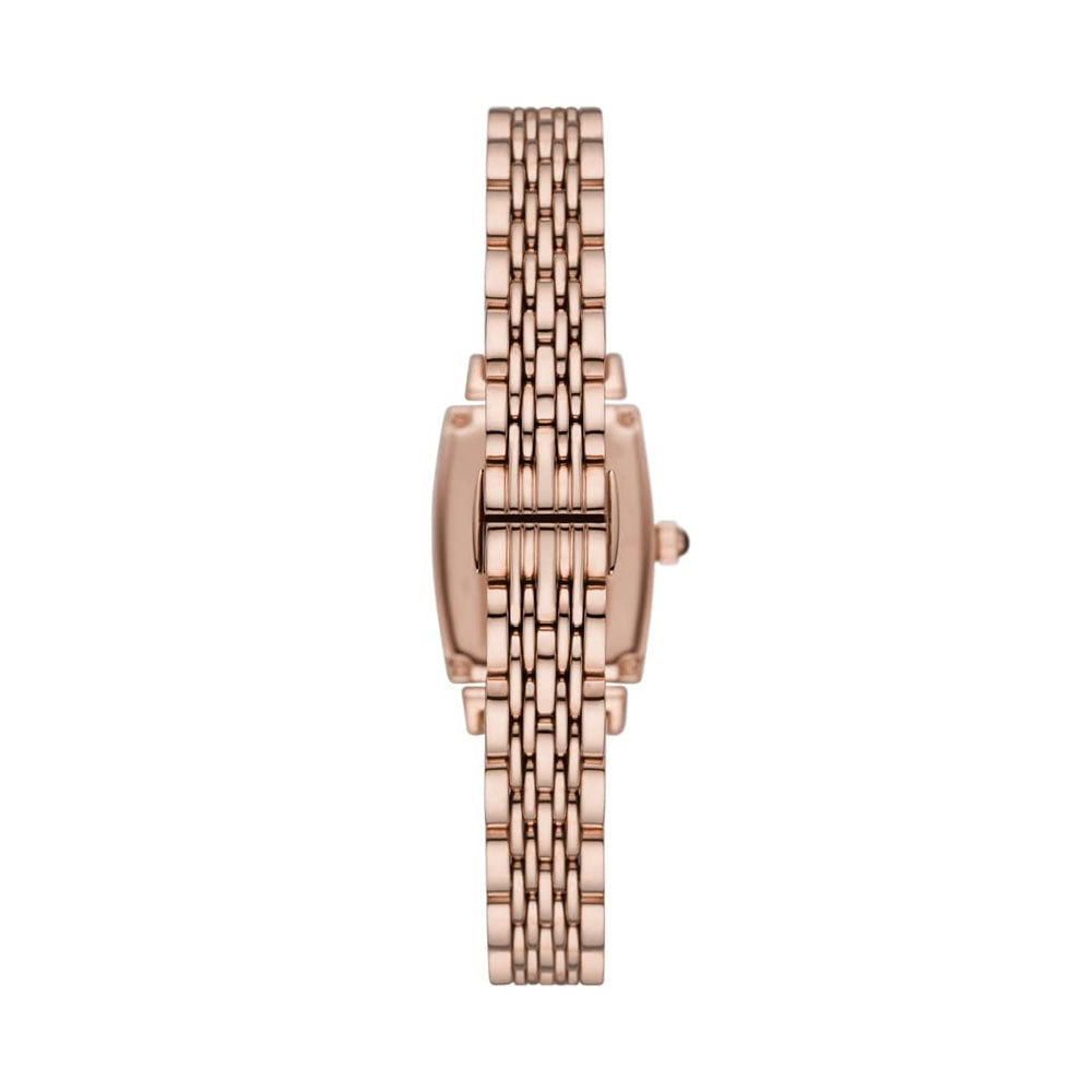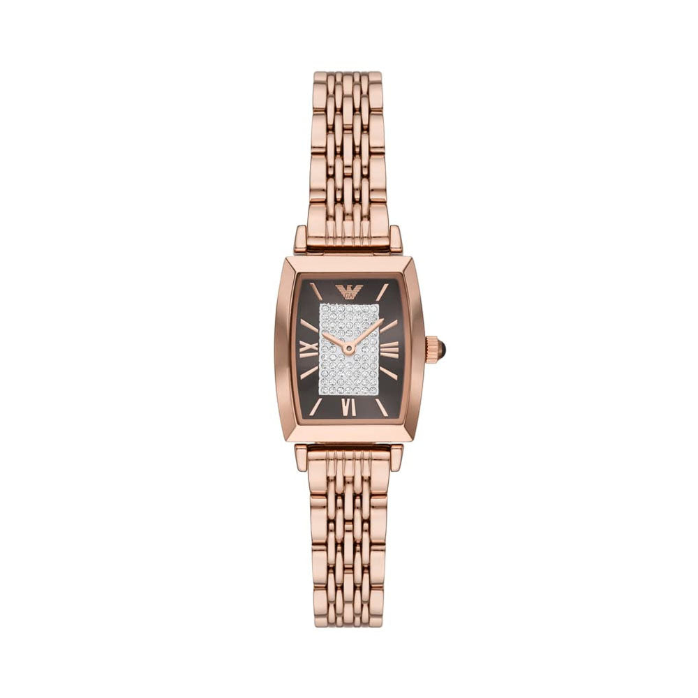Effortlessly combining style and functionality, this women's analog watch from Emporio Armani will be a perfect pick. Its Stainless Steel strap vaunts a rose gold hue that enhances the look of the watch. The brown rectangular dial is protected by a mineral glass. Furthermore, it is complemented with a deployment clasp that ensures a secure fit on the wrist.
