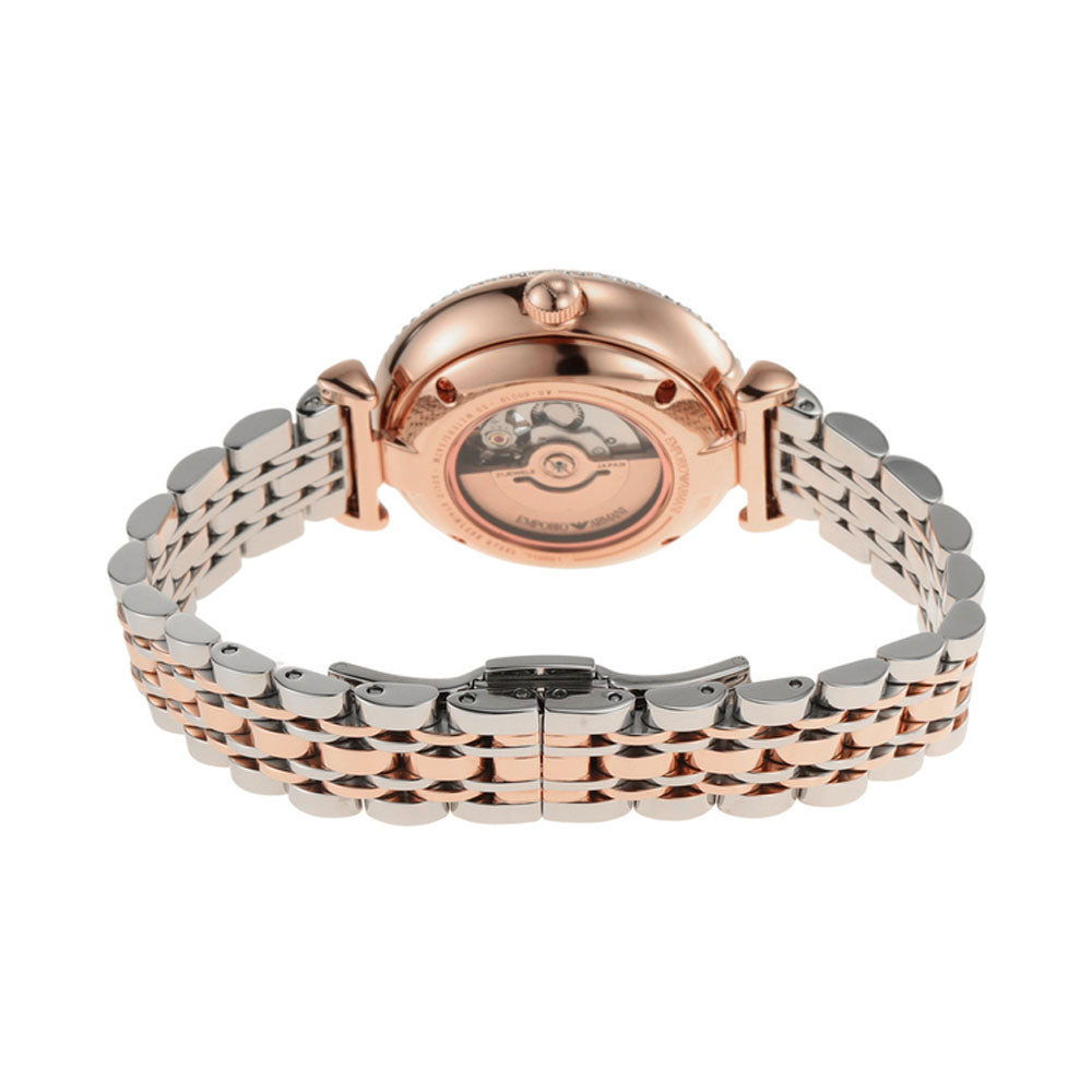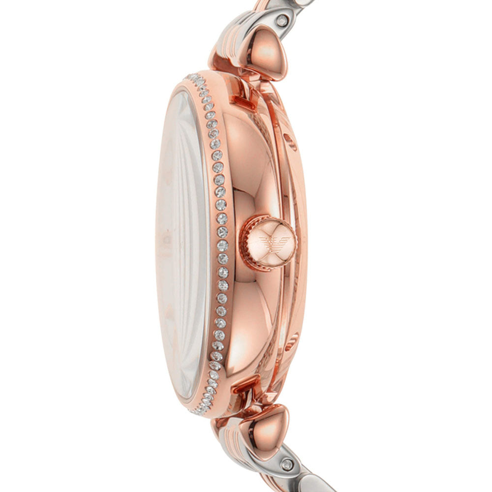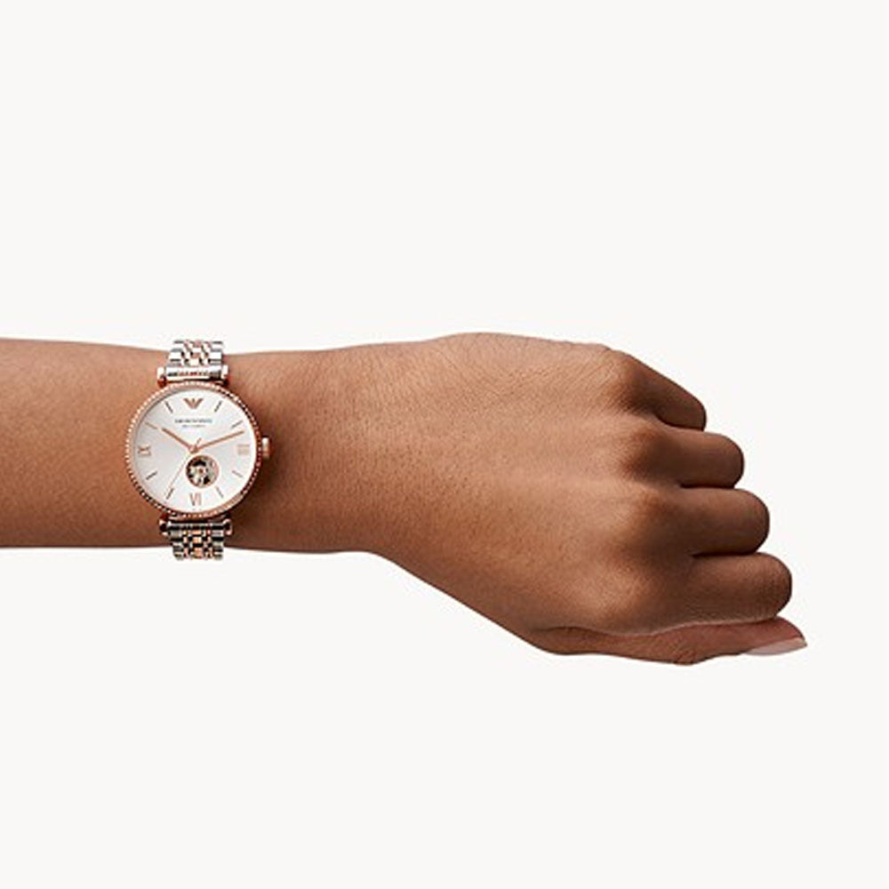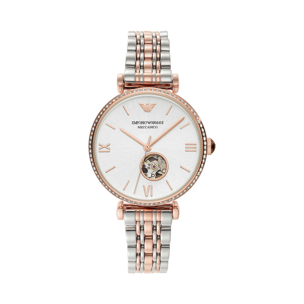 Amaze everyone around you by wearing this women's analog watch from Emporio Armani. The silver round dial is protected by a mineral glass. It features plain 3-hand, and a crown for time adjustment. The strap comes in a silver and rose gold hue that further elevates the look of the...