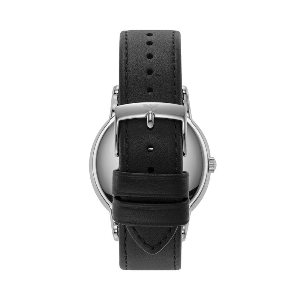 Emporio Armani's 41 mm watch with bracelet features a sleek sunray dial, three hand date movement, in pair with stainless steel, black leather strap with hook closure. The exemplary of brilliant craftsmanship, this fine watch will surely catch your attention.