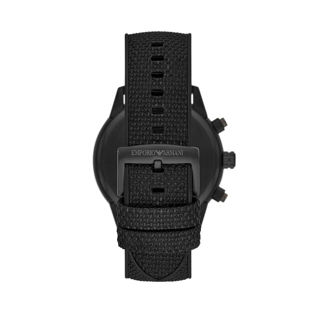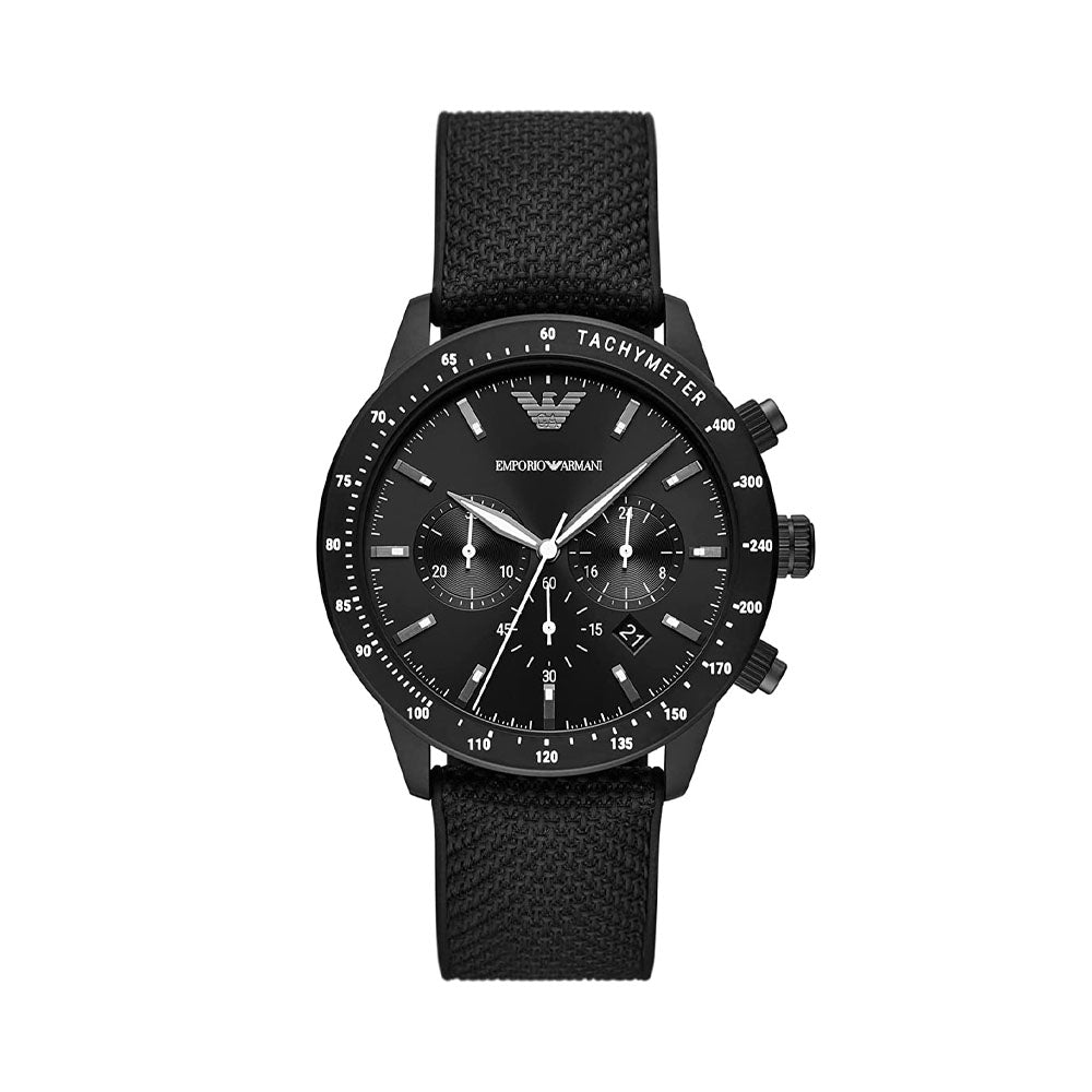 Emporio Armani's 43mm watch features a sunray black dial, black tachymeter, IP black topring with white marking, chronograph movement and black fabric strap.