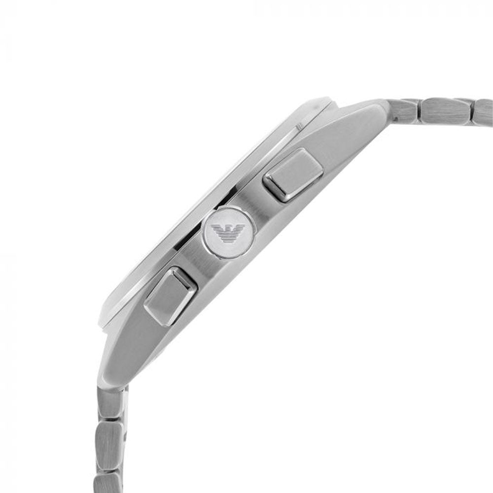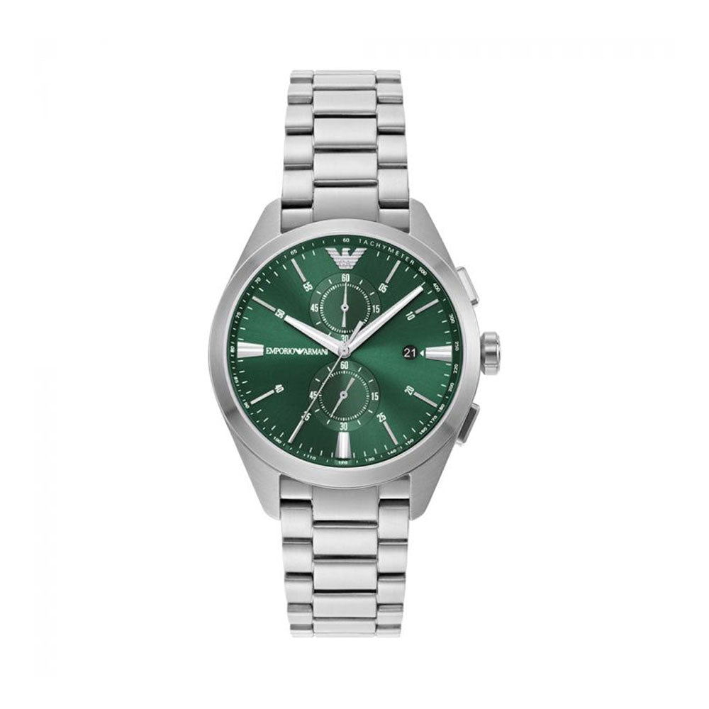 Emporio Armani's 43mm watch features a green sunray dial with applied indexes and hands with white luminova, at least 50% recycled stainless steel case, chronograph movement and at least 50% recycled stainless steel bracelet.