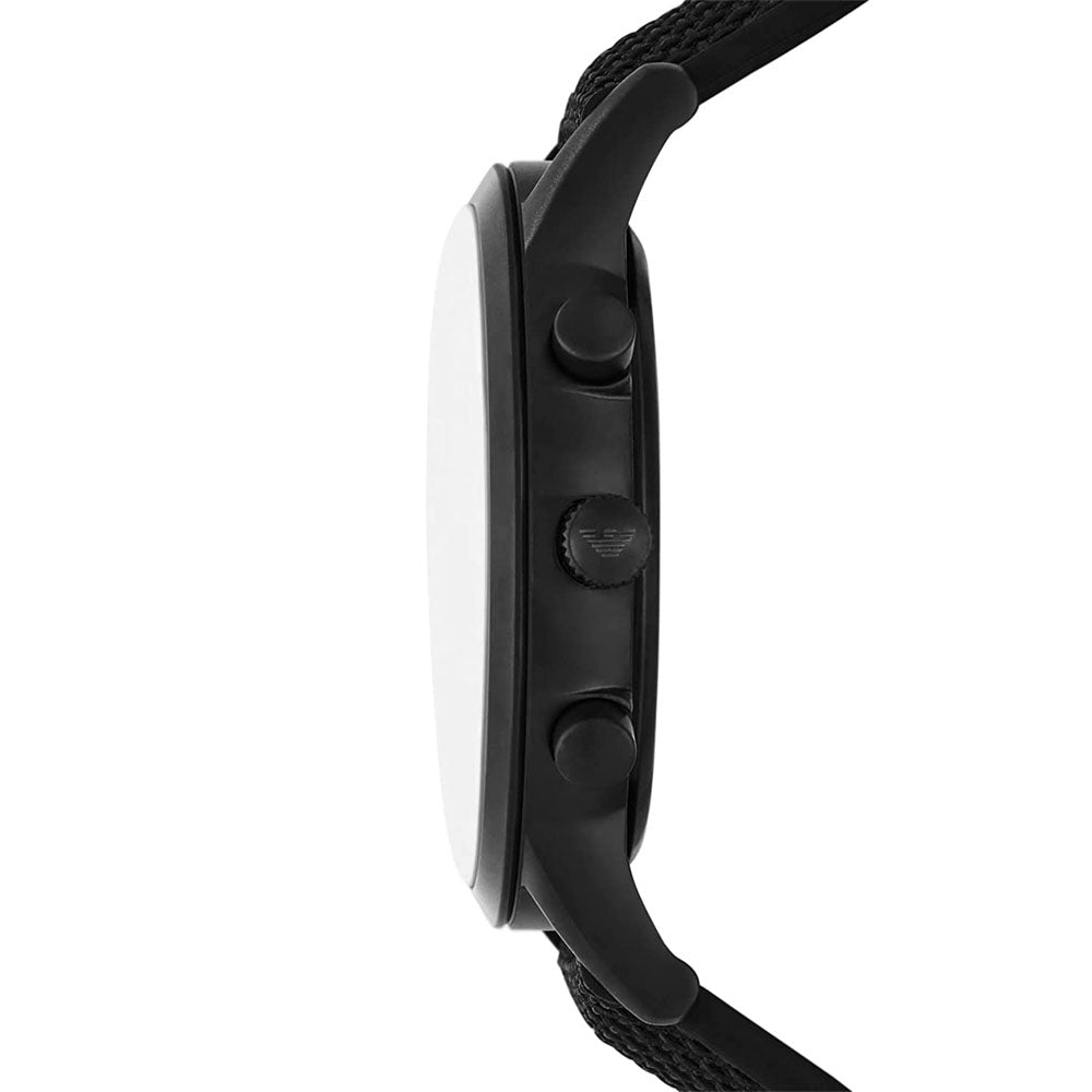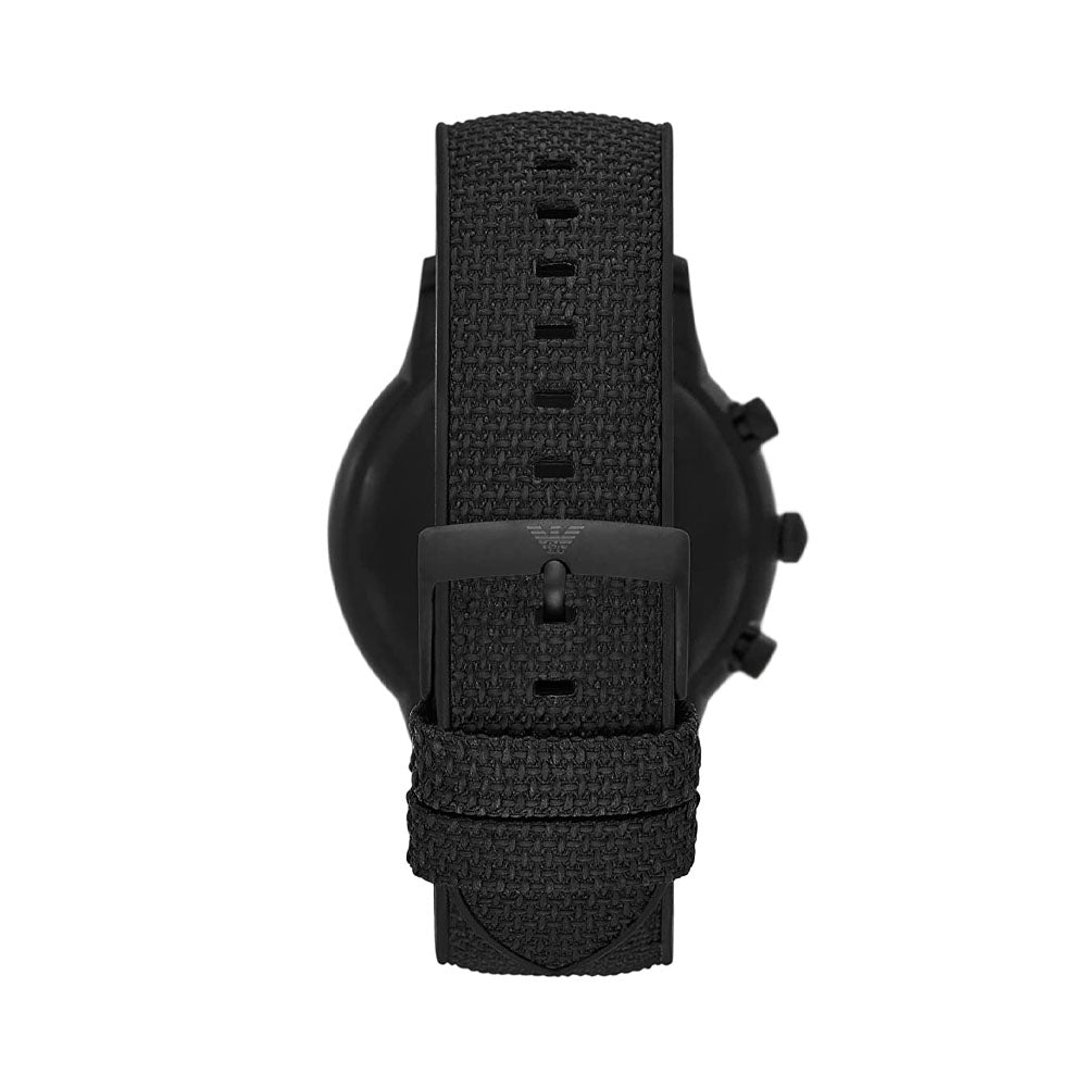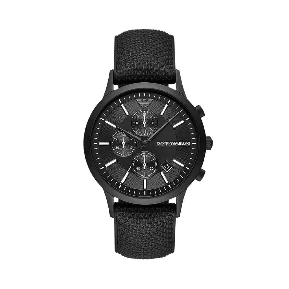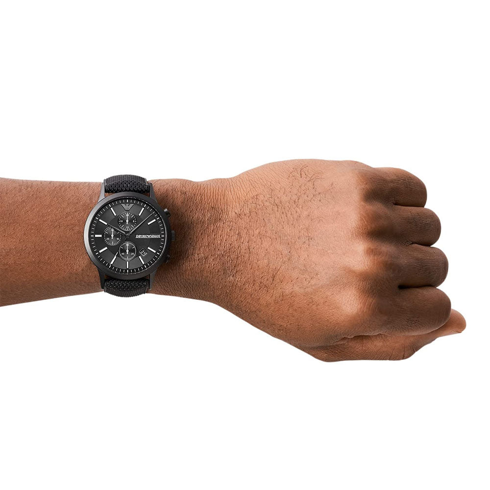Go to the shopEmporio Armani's 43mm watch features an all matte case, sunray black dial with CD cut texture, chronograph movement and black silicone backed fabric strap.