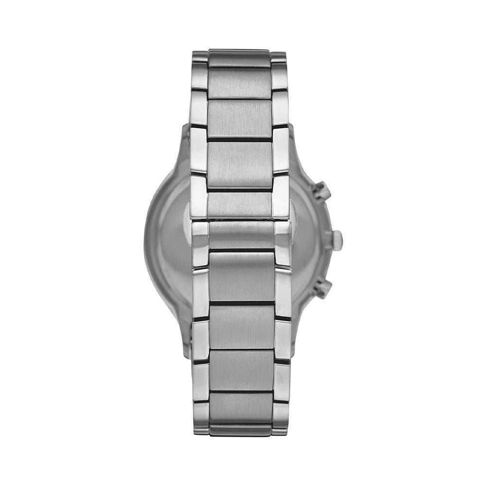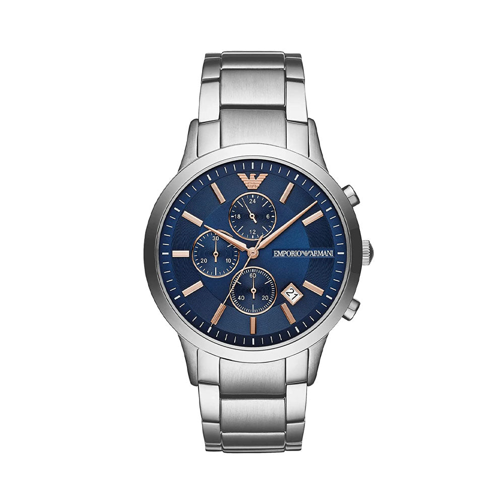 Go to the shopEmporio Armani's 43mm watch stainless steel case, sunray blue dial with rose gold tone indexes and CD cut texture, chronograph movement and stainless steel bracelet.