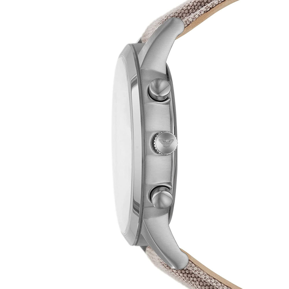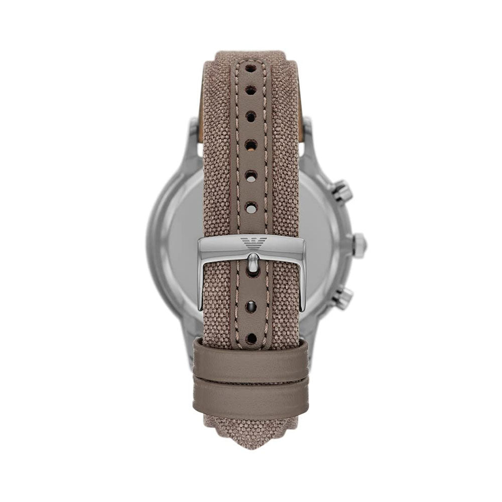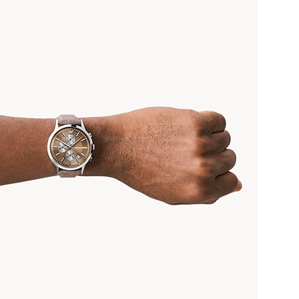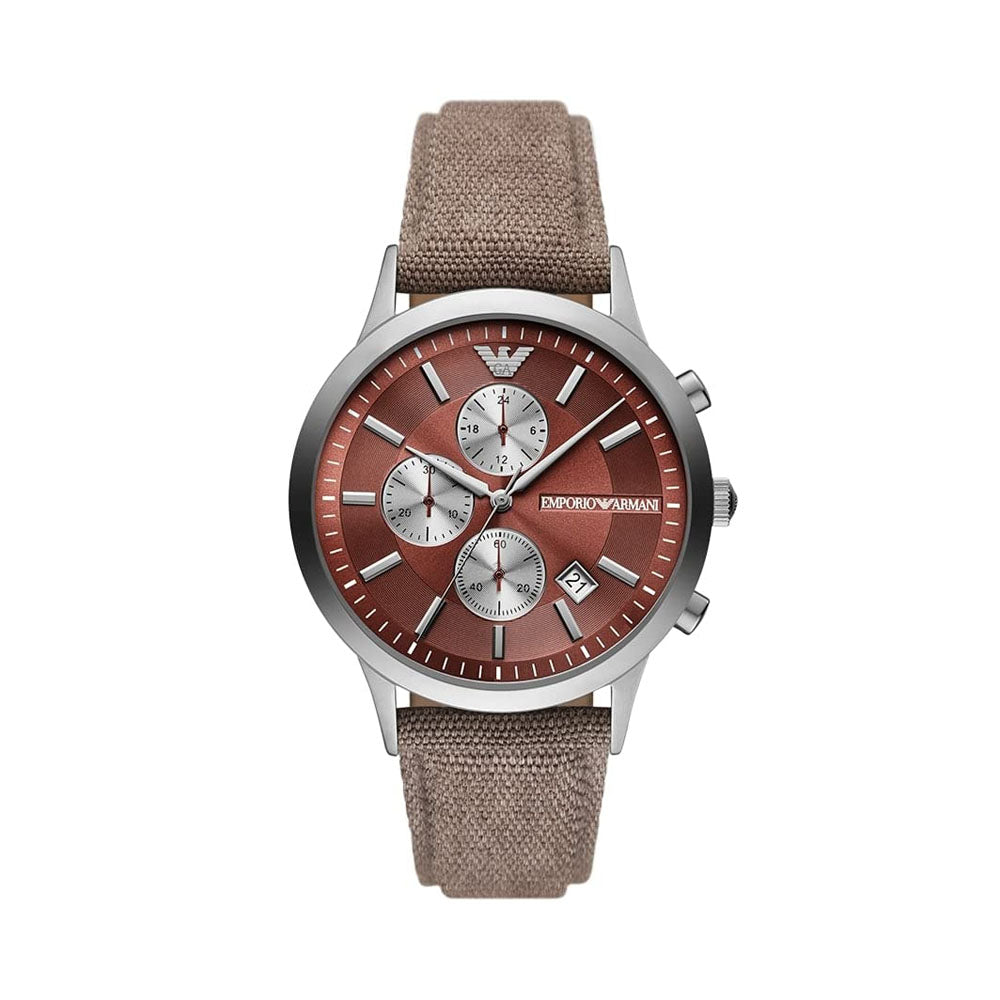 Go to the shopEmporio Armani's 43mm watch features a sunray copper dial with CD cut texture, chronograph movement and gray fabric strap.