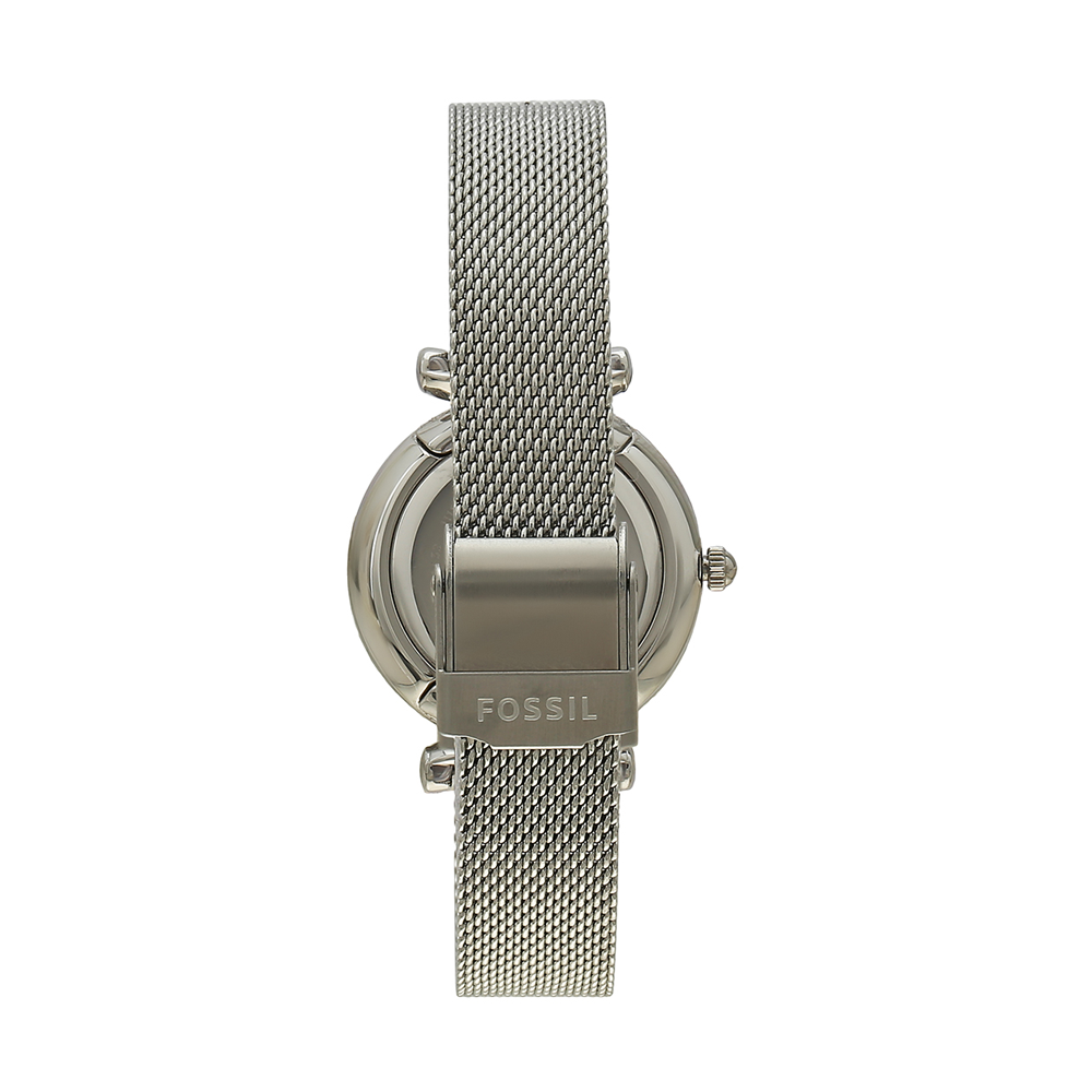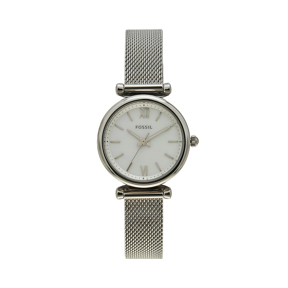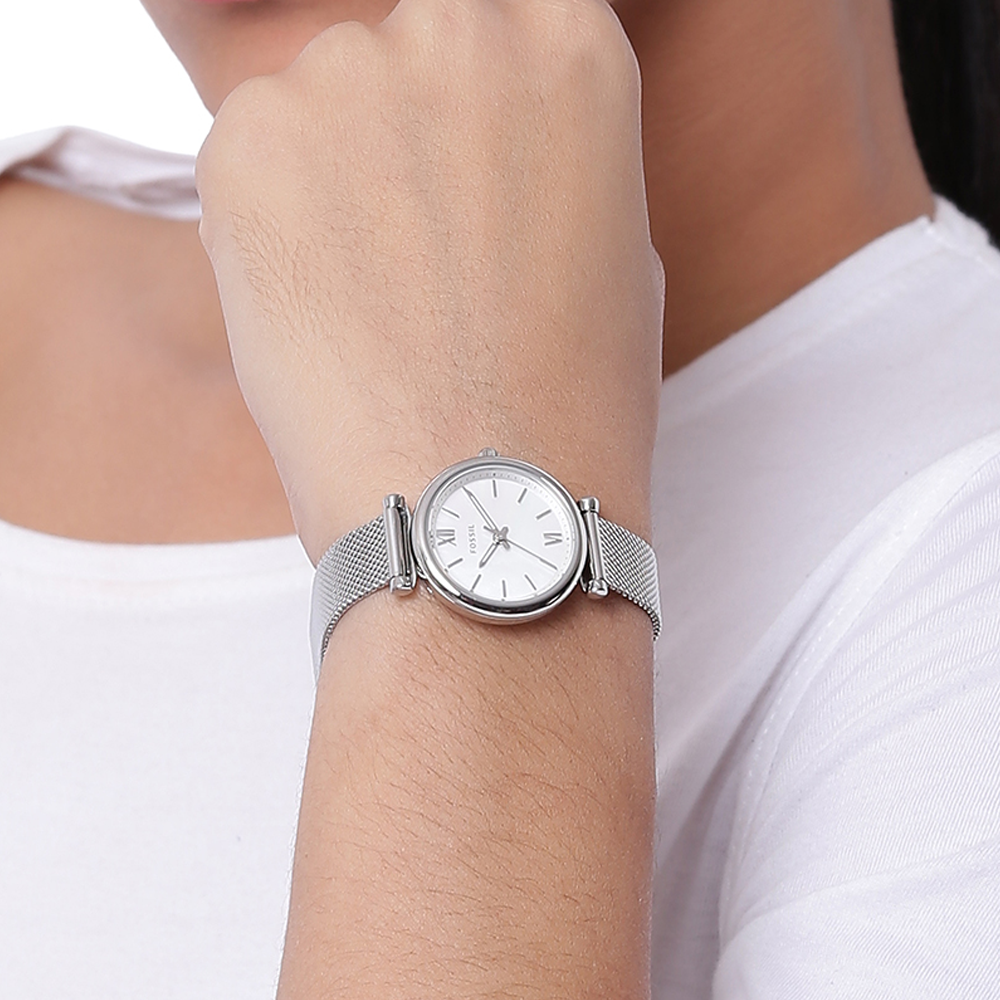 Adorn your wrist with this exquisite analog watch from Carlie collection by Fossil. Carlie watches combines elegant design and rich materials to create a glamorous accessory. Housed in a 28 mm case, the white mother of pearl round dial features plain three hands with Roman numerals for time reading ease....
